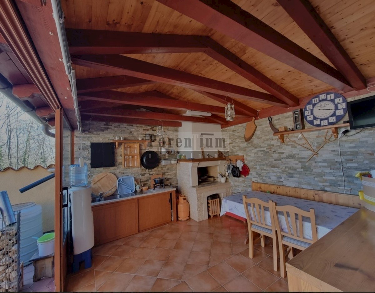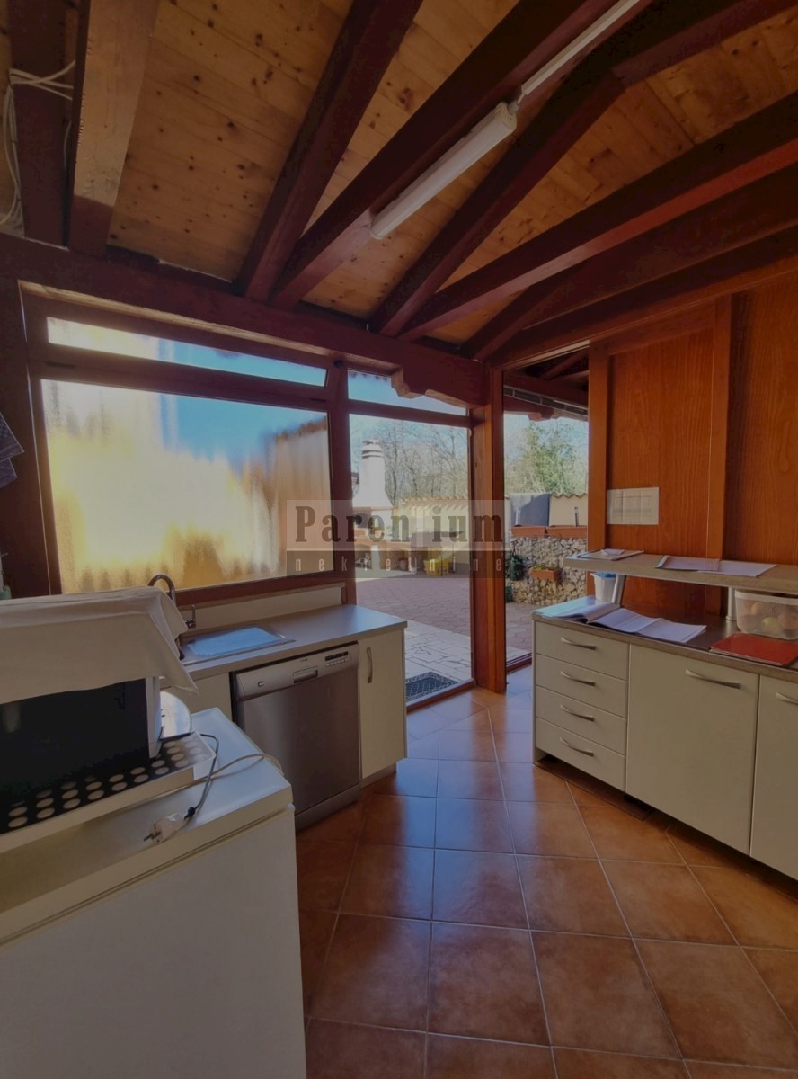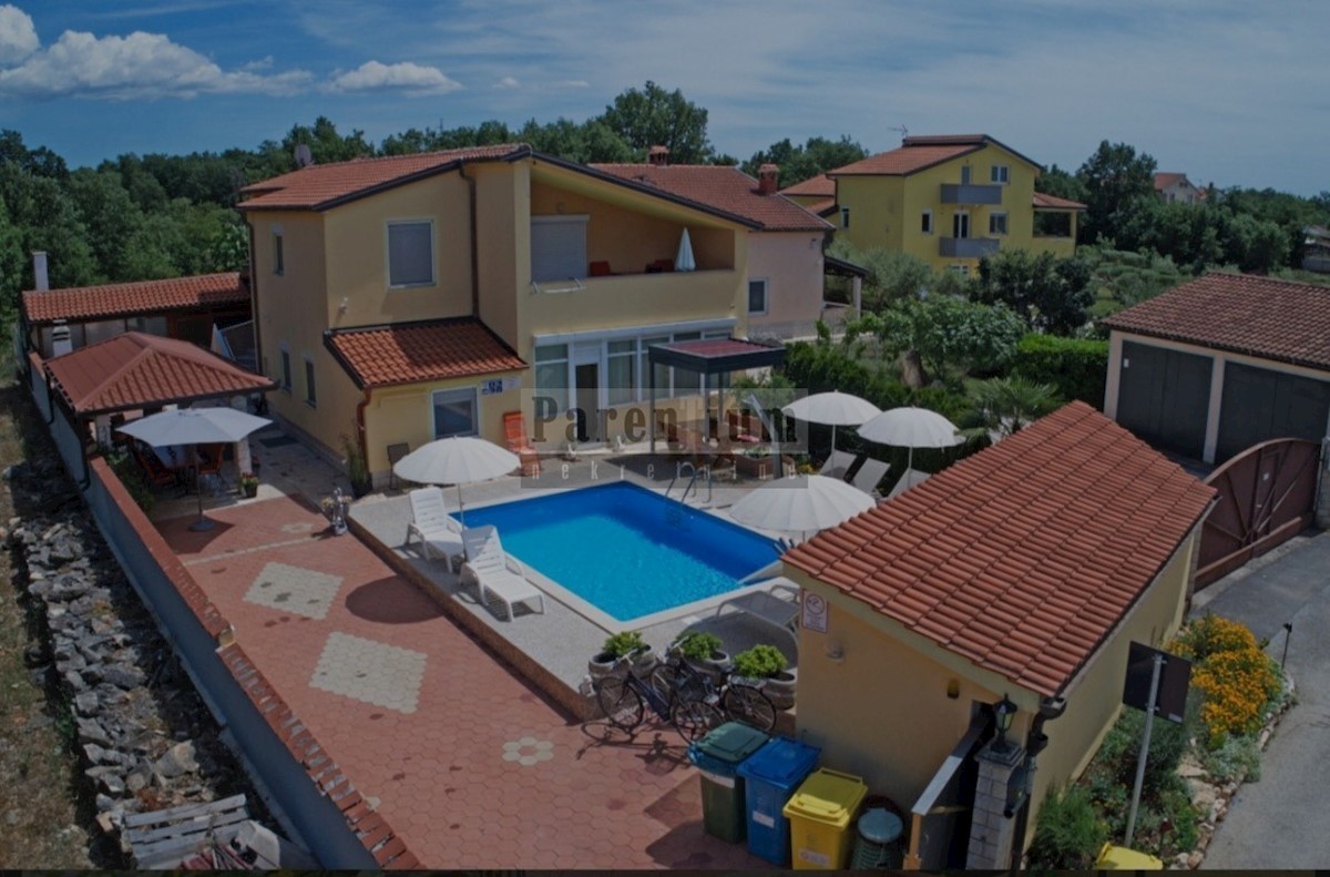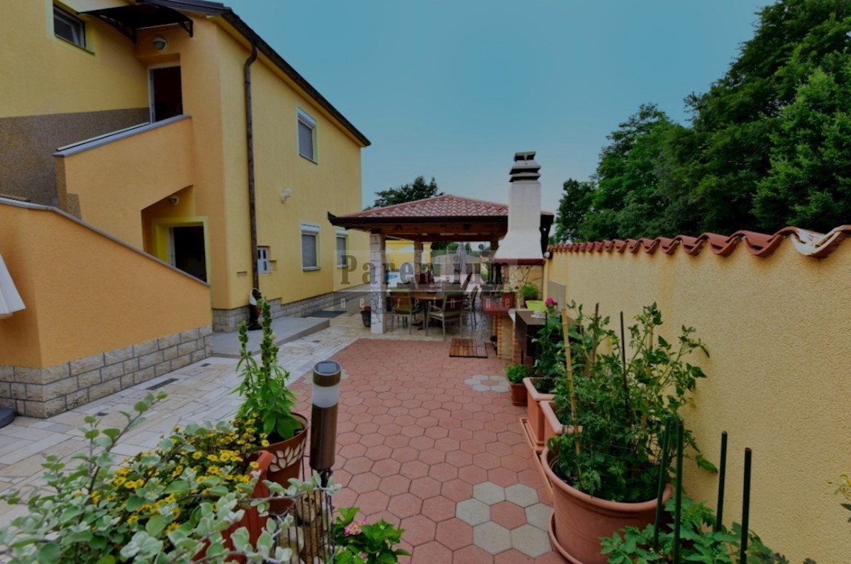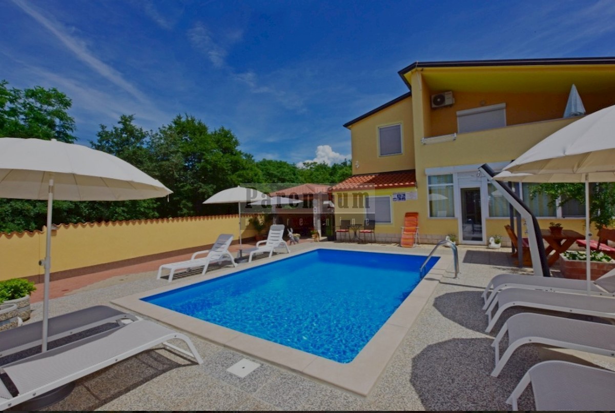 Poreč, okolica, 6 km oddaljena od morja in centra mesta, je ta apartmajska hiša s skupno petimi apartmaji. Njegova skupna površina je 280 m2. Hiša se razteza v dveh etažah, od tega se tri stanovanja nahajajo v pritličju in dva apartmaja v prvem nadstropju