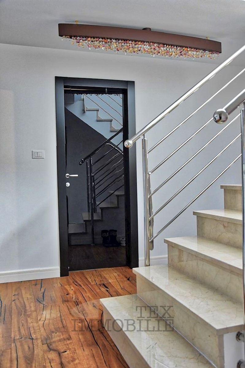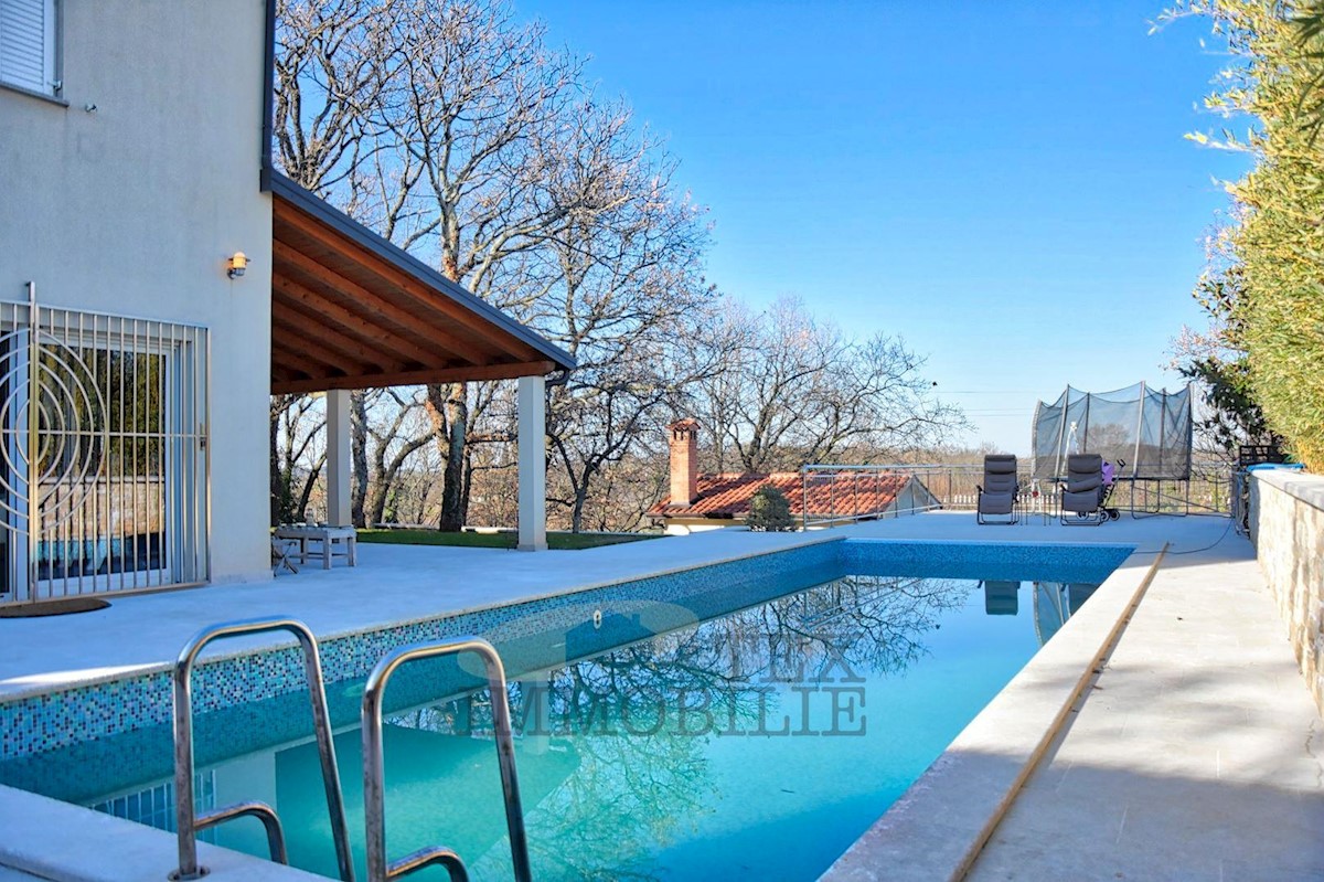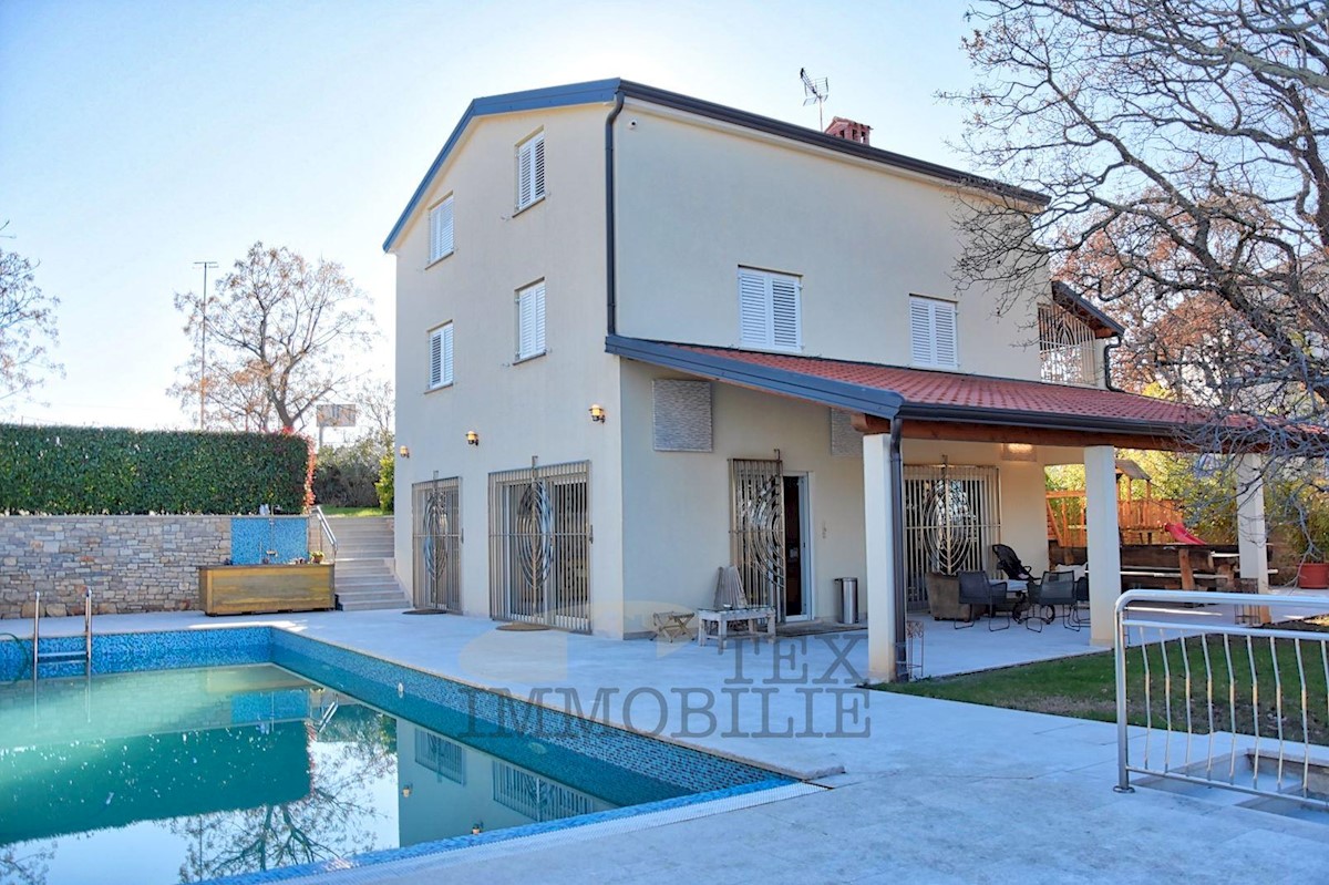 Prodamo hišo z bazenom na parceli 926 m2 nedaleč od Poreča in 3 km od morja. V pritličju hiše se nahaja kuhinja, dnevna soba, kopalnica, shramba in velika pokrita terasa. V 1. nadstropju sta dve spalnici, kopalnica in skupna terasa. V 2. nadstropju so tri