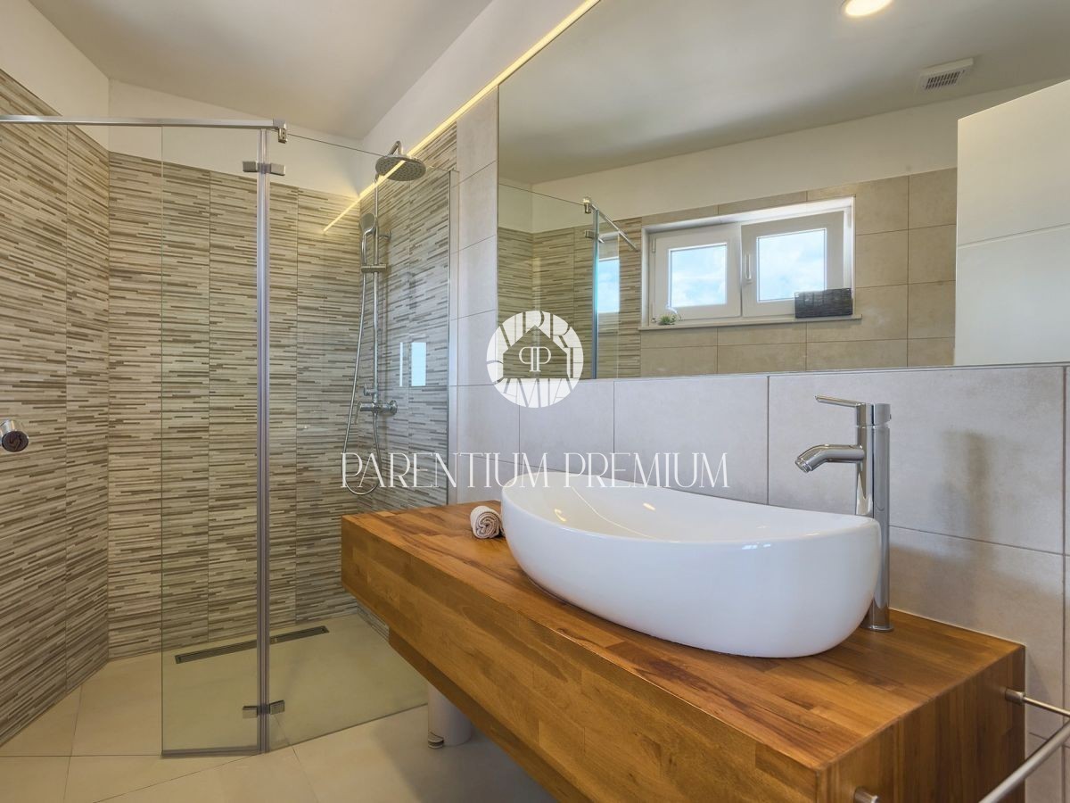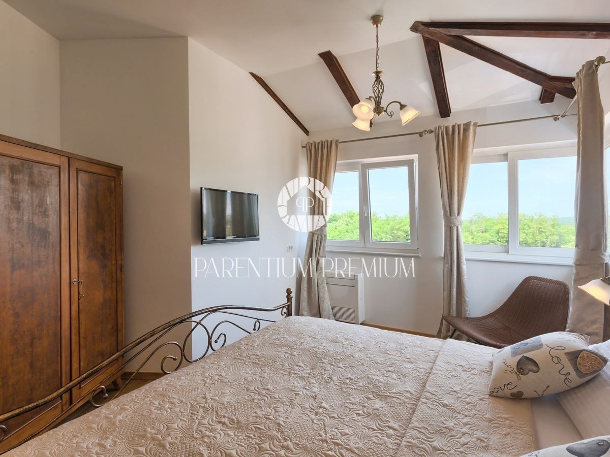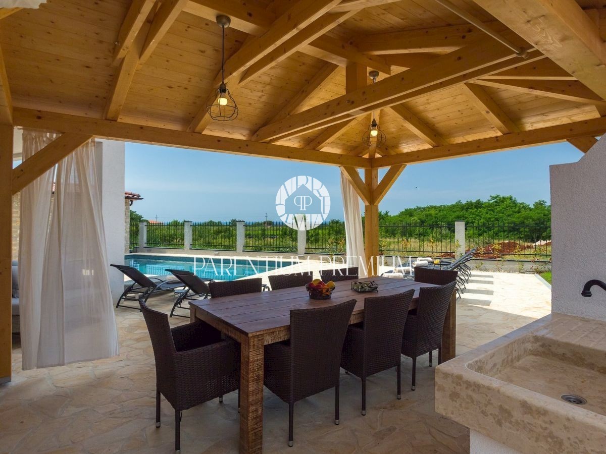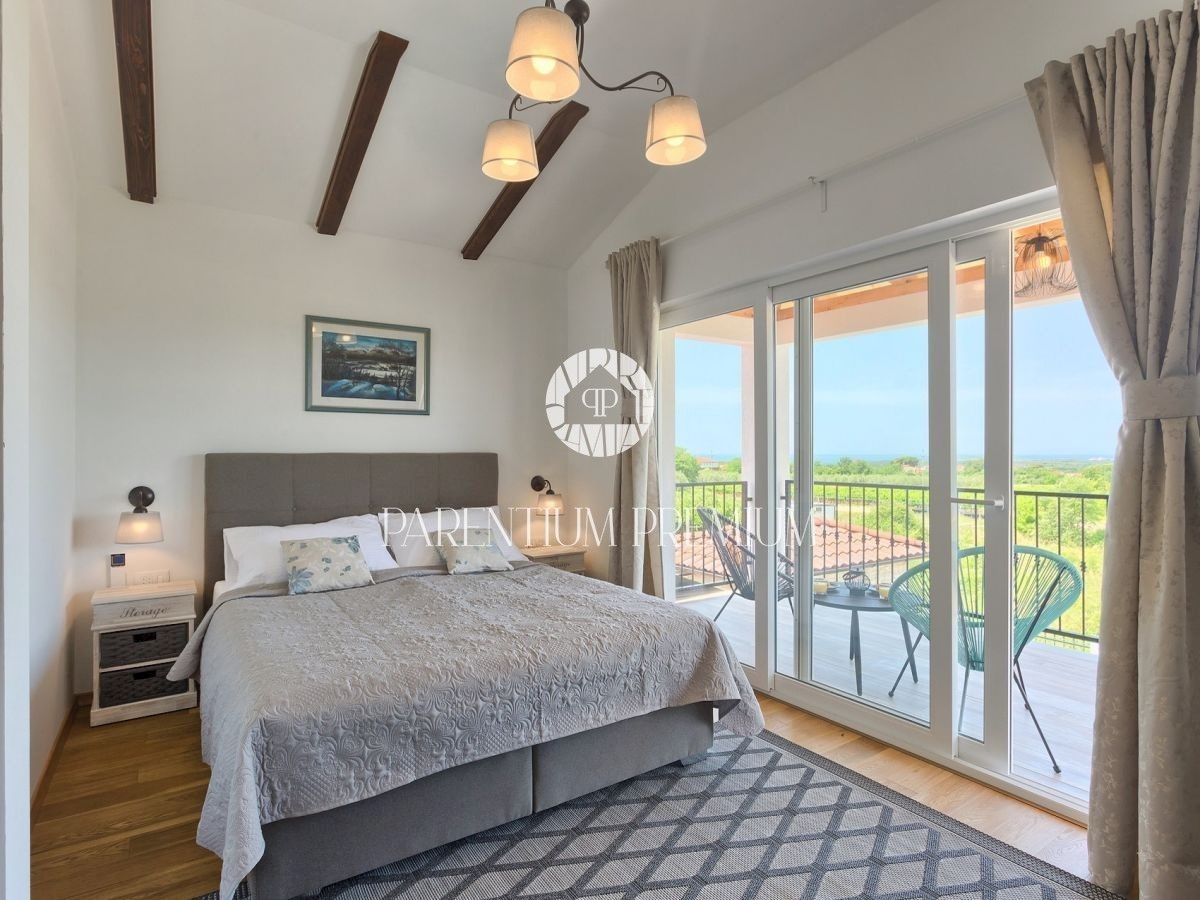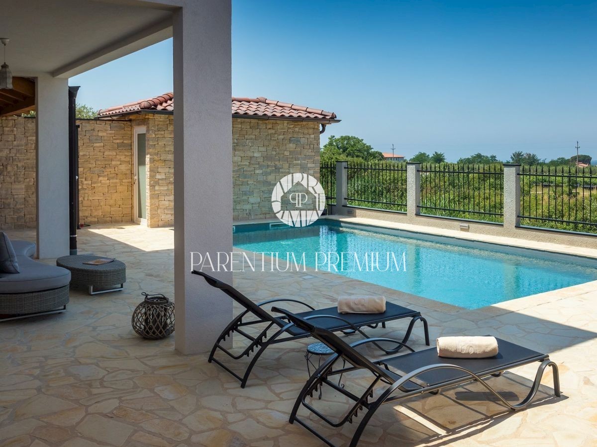 Istra, okolica Poreča V bližini Poreča se prodaja ta novozgrajena čudovita kamnita vila s čudovitim pogledom na morje in okolico. Hiša se razprostira v dveh etažah, kjer se v prvem nadstropju hiše nahaja predsoba, prostorna spalnica s kopalnico, lepa ve