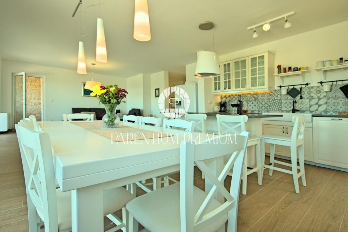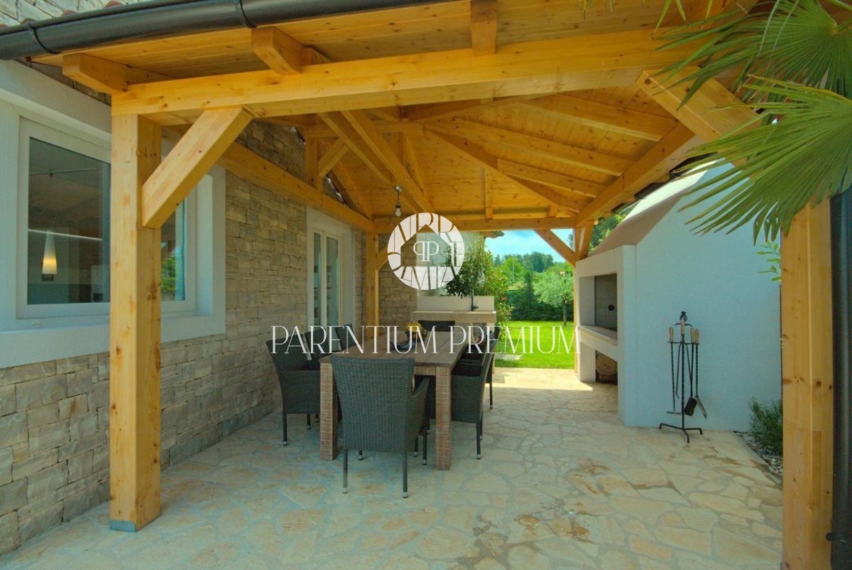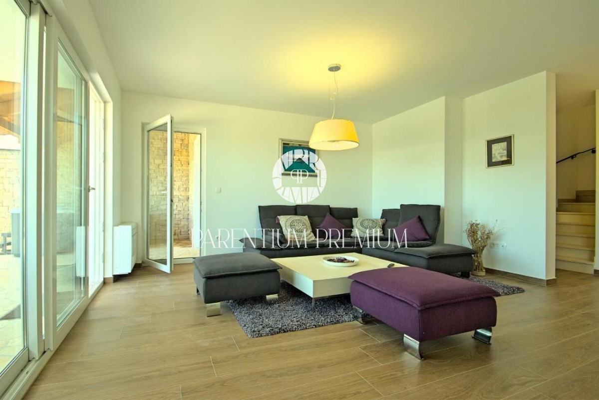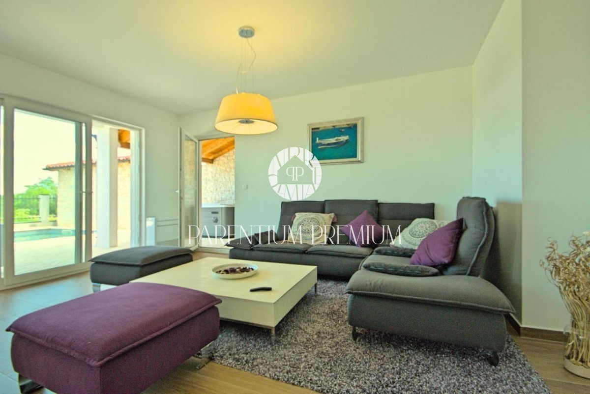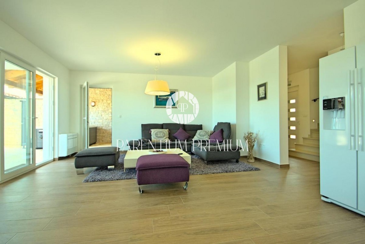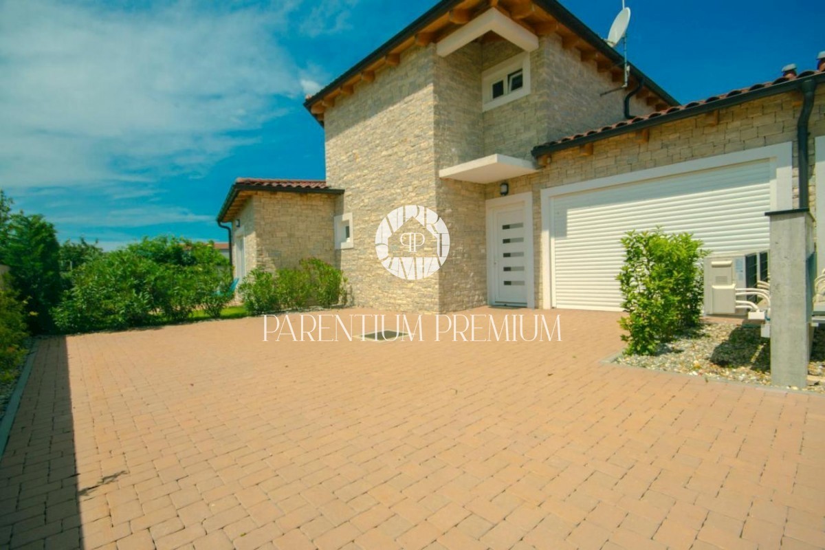 Istra, okolica Poreča V bližini Poreča se prodaja ta novozgrajena čudovita kamnita vila s čudovitim pogledom na morje in okolico. Hiša se razprostira v dveh etažah, kjer se v prvem nadstropju hiše nahaja predsoba, prostorna spalnica s kopalnico, lepa ve