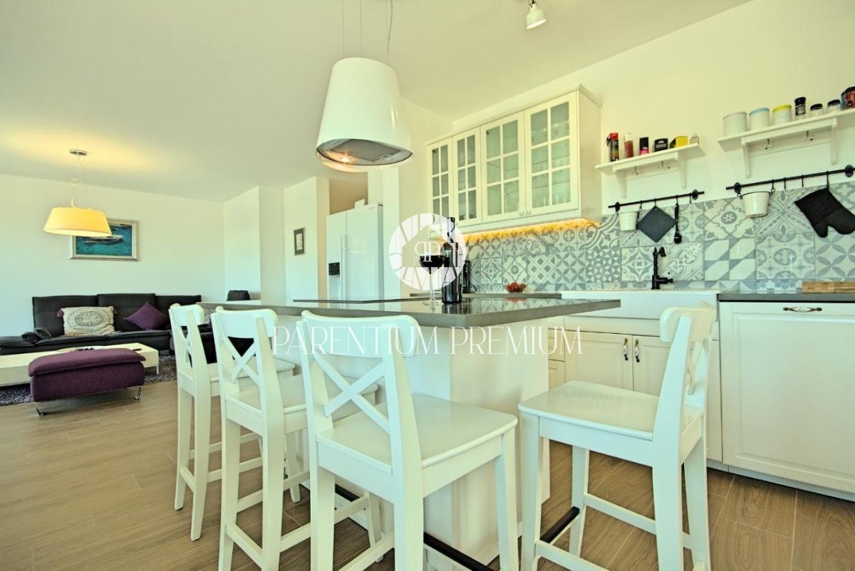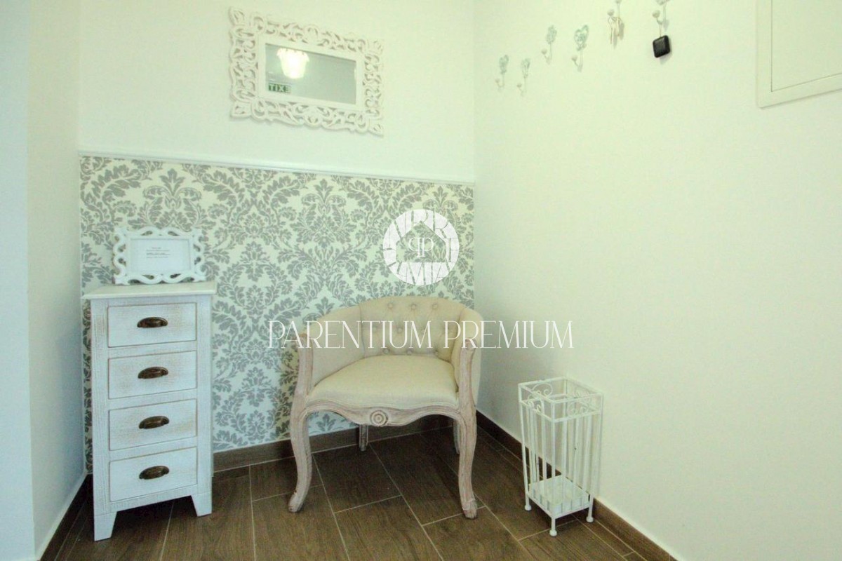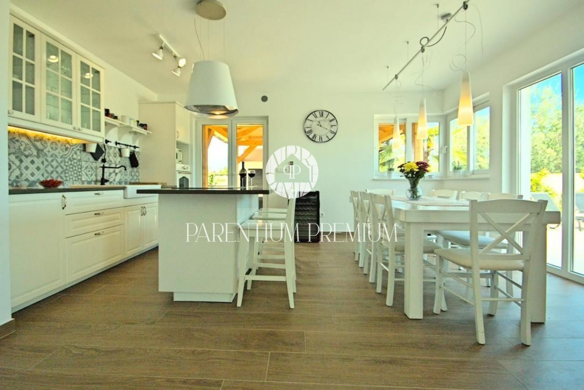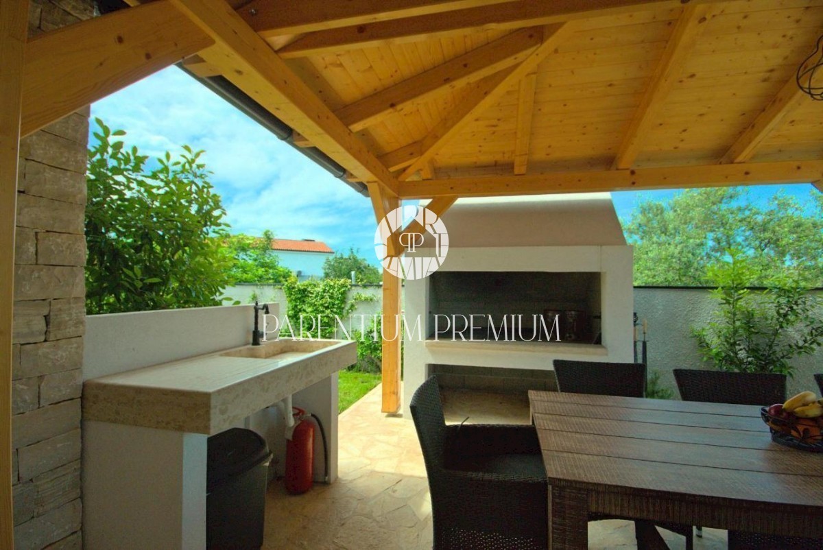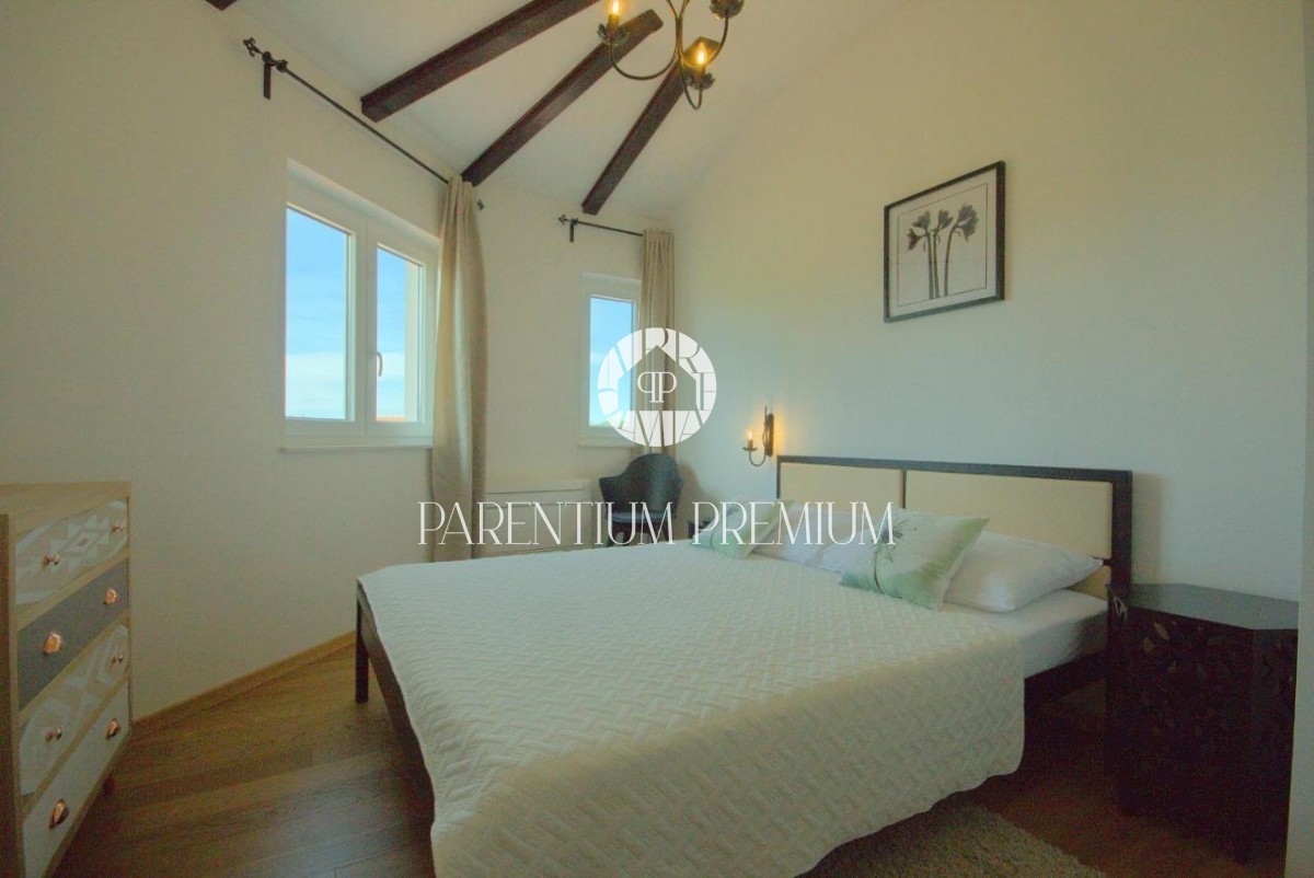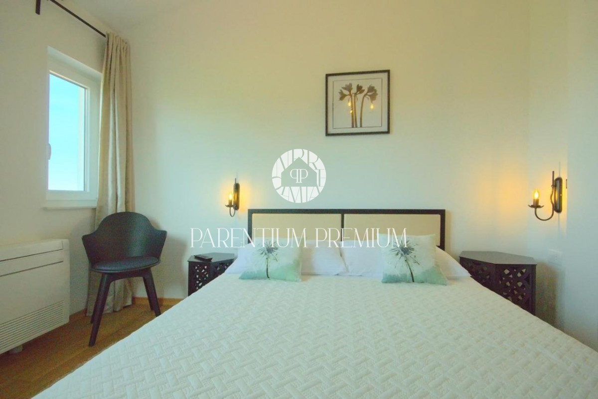 Istra, okolica Poreča V bližini Poreča se prodaja ta novozgrajena čudovita kamnita vila s čudovitim pogledom na morje in okolico. Hiša se razprostira v dveh etažah, kjer se v prvem nadstropju hiše nahaja predsoba, prostorna spalnica s kopalnico, lepa ve