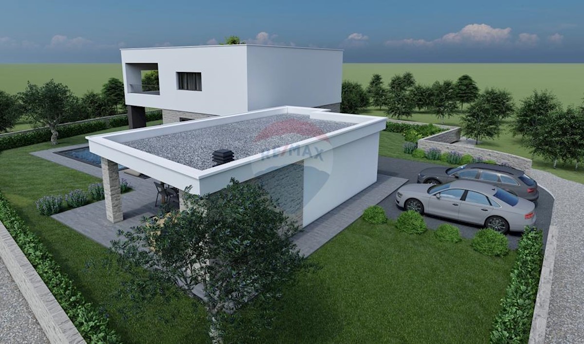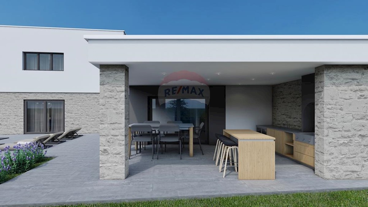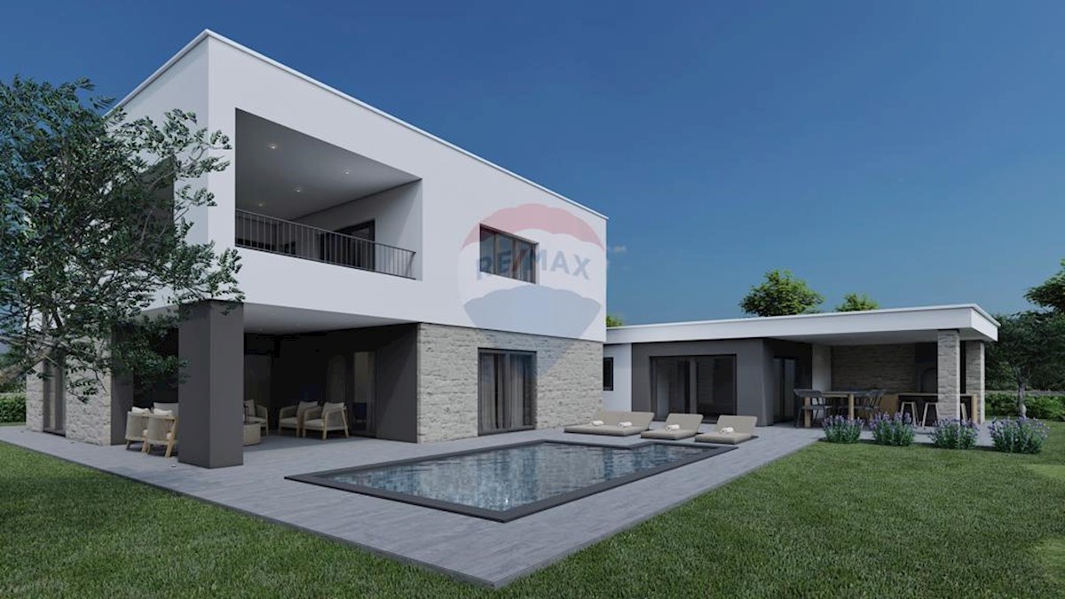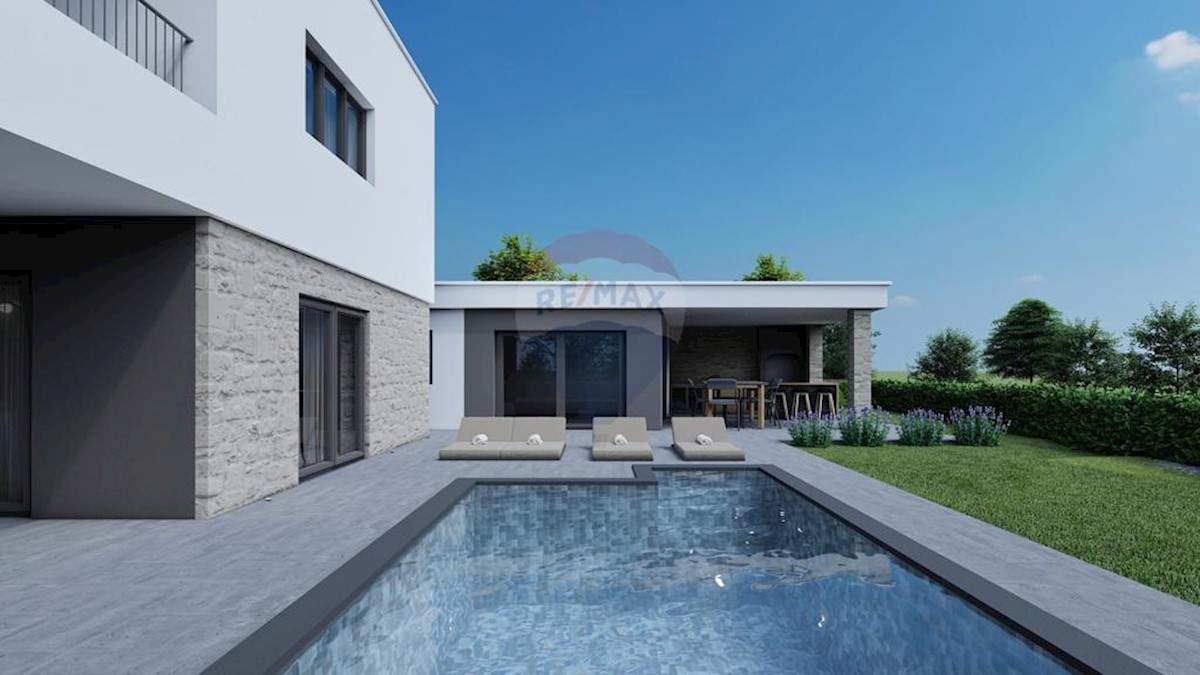 V okolici Poreča je naprodaj hiša v gradnji, stanovanjske površine 210 m2 in 640 m2 vrta. Pritličje obsega predsobo, shrambo, garderobo, wc, eno spalnico s kopalnico, kuhinjo z jedilnico, veliko dnevno sobo z izhodom na teraso in bazen s prostorom za sonč