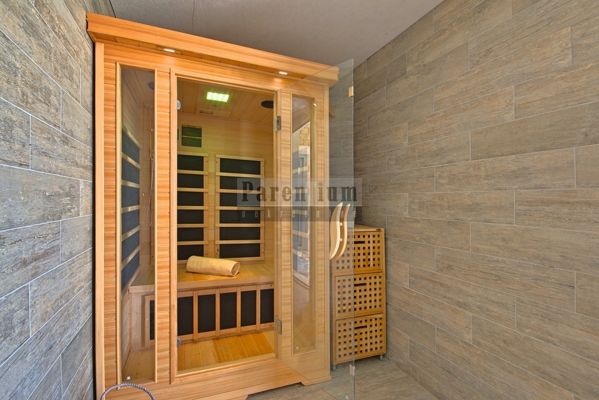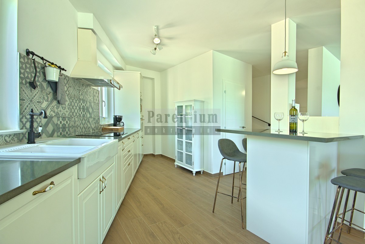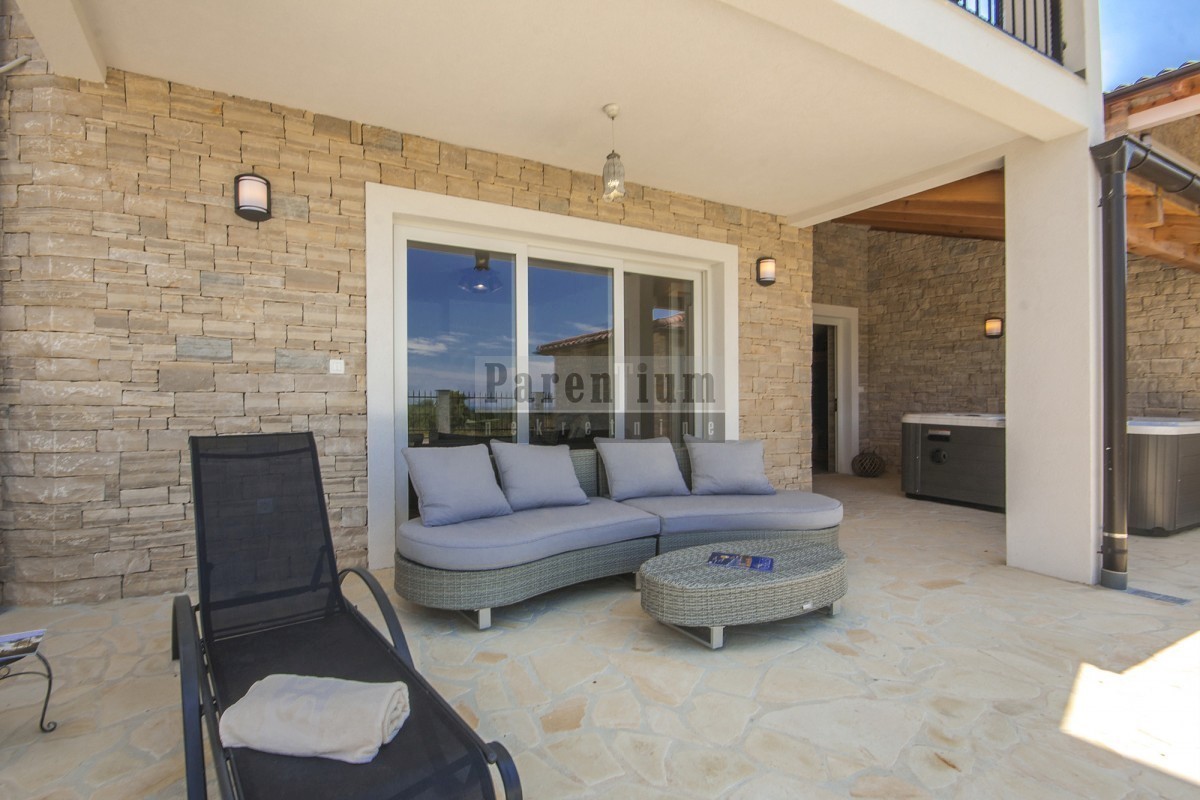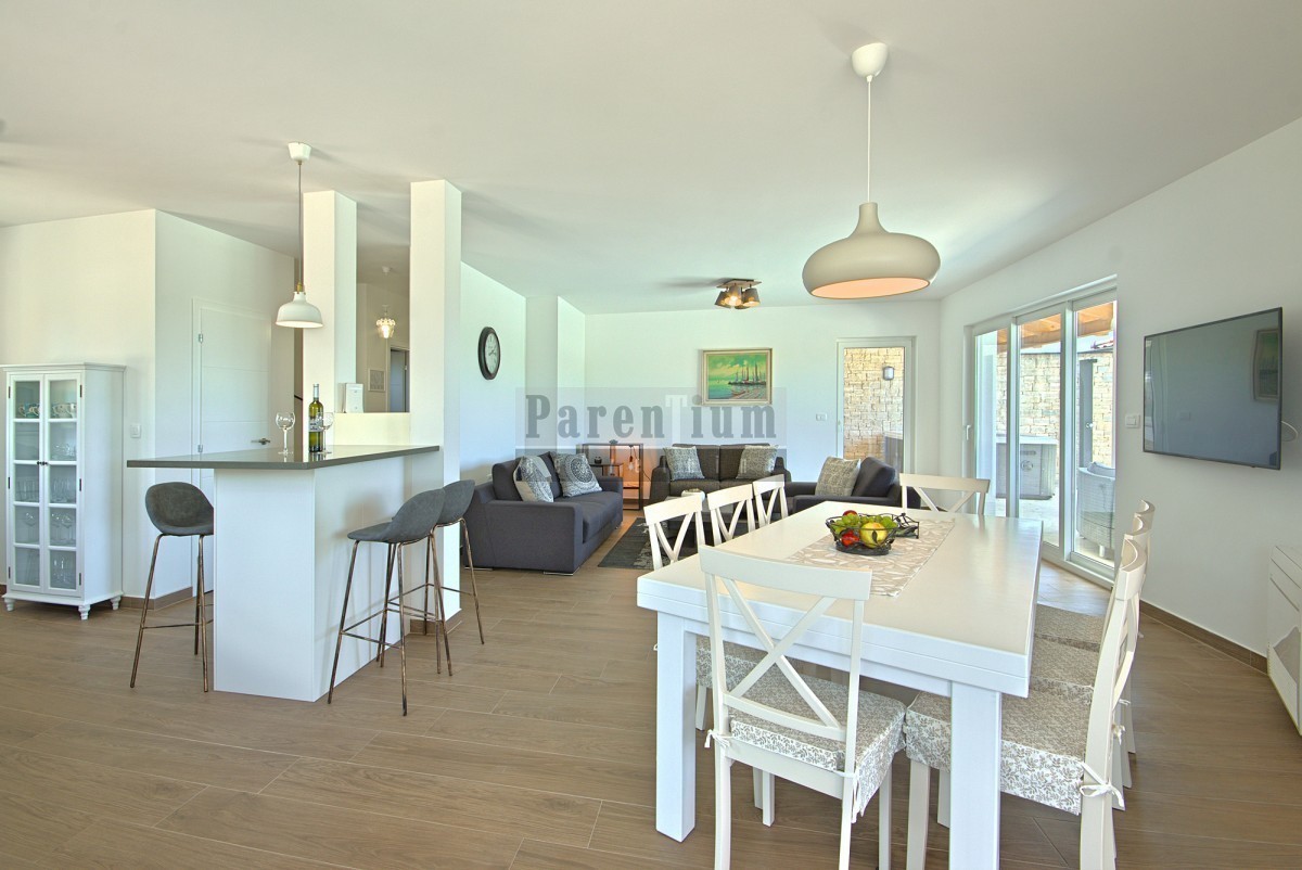 Poreč, okolica, prodamo čudovito vilo le 5 km od morja in mesta. Površina meri 186 m2 in je razdeljena na dve etaži. V pritličju se nahaja kuhinja, jedilnica, prostorna dnevna soba z izhodom na pokrito teraso, ena spalnica s kopalnico, WC za goste in shra