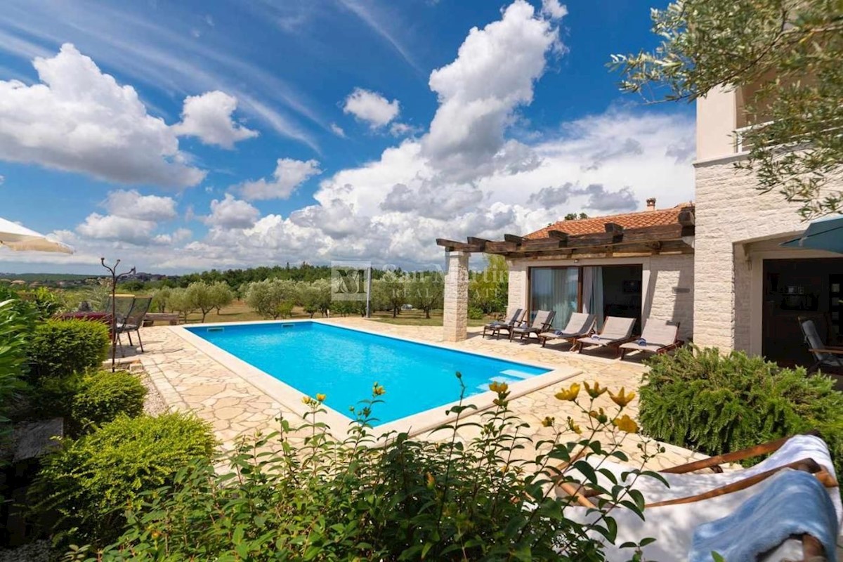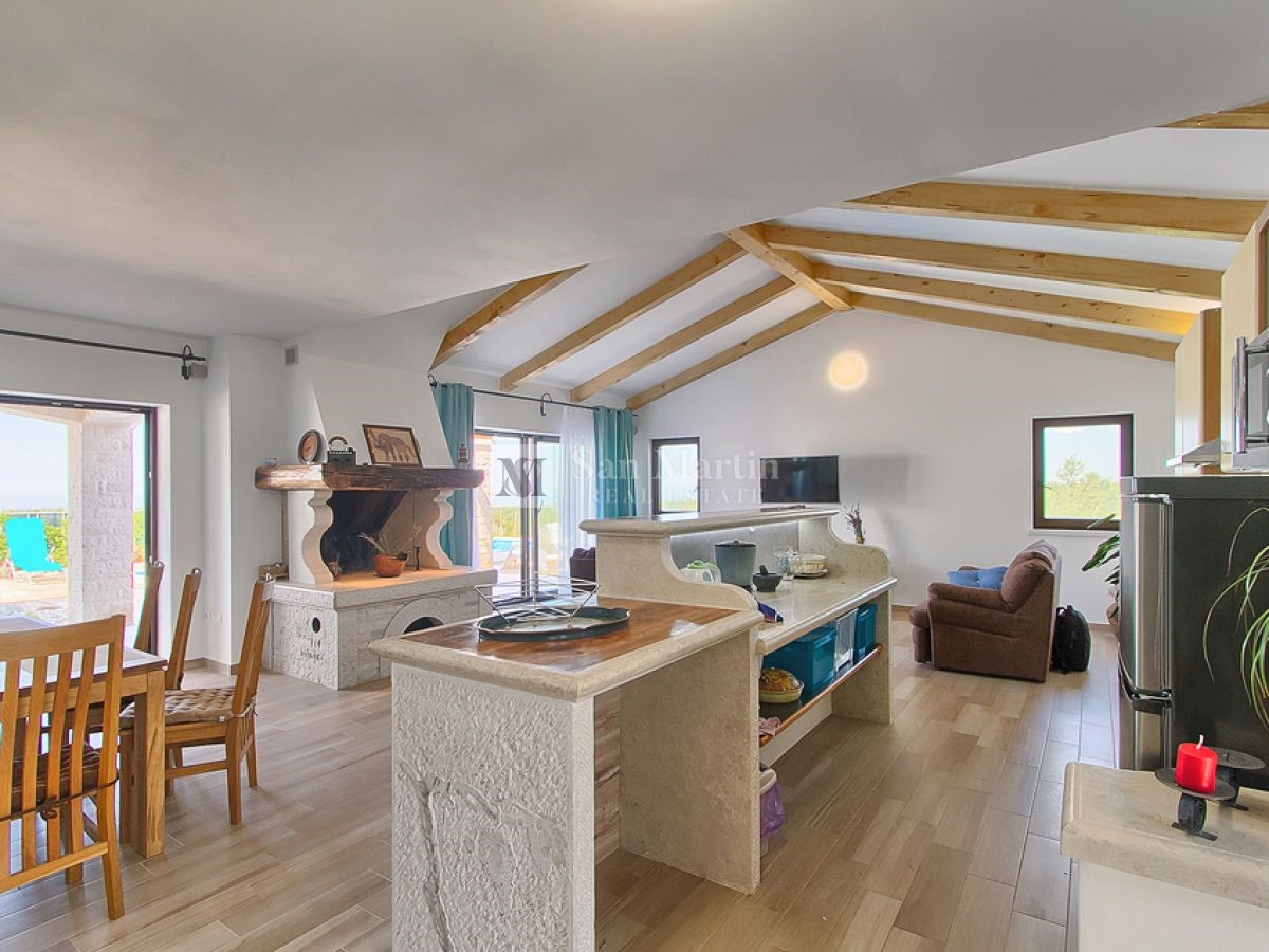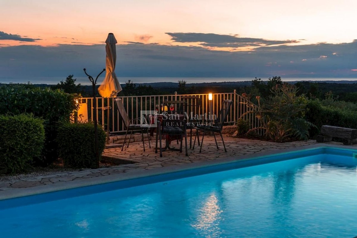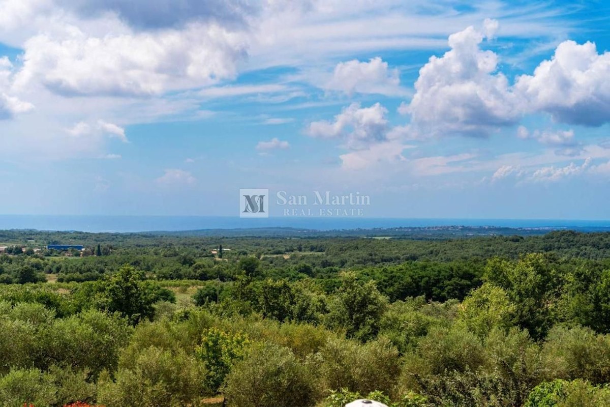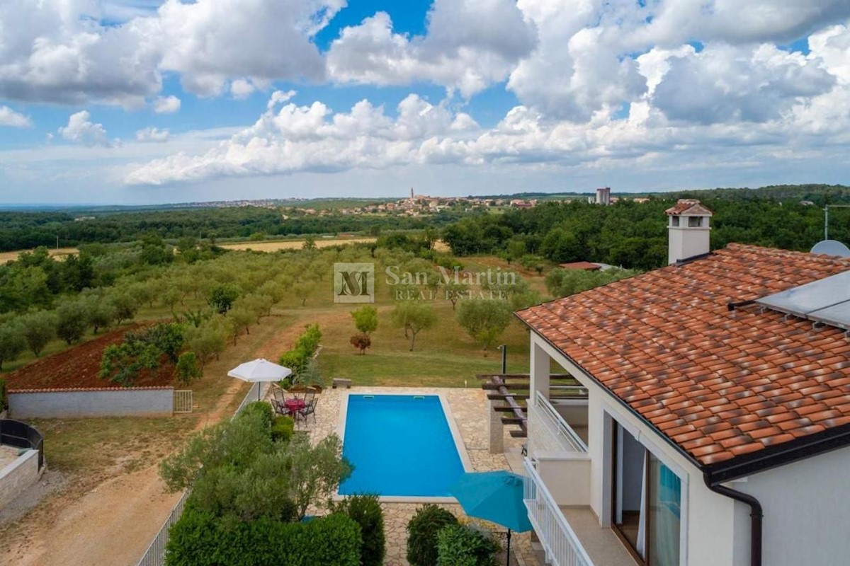 Poreč - okolica, hiša s čudovitim panoramskim razgledom! Ta hiša s skupno površino 166 m2 se nahaja na robu mirnega, lepega kraja nedaleč od Poreča, na urejenem vrtu. Hiša se razprostira na dveh etažah. V pritličju je dnevna soba z jedilnico in kuhinjo,