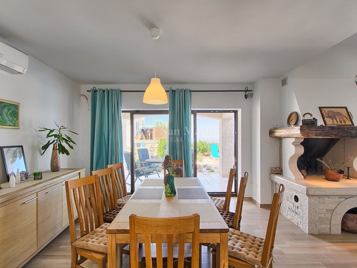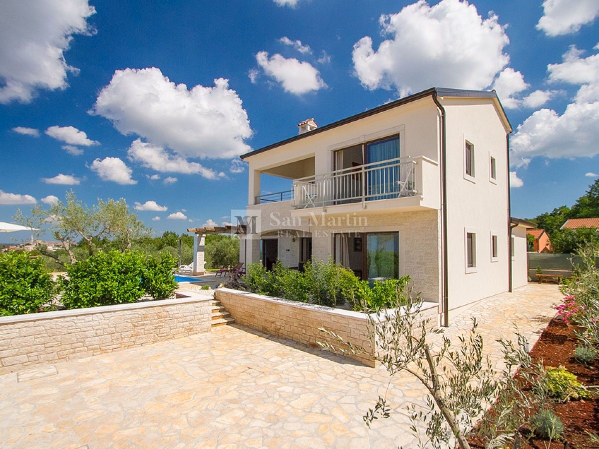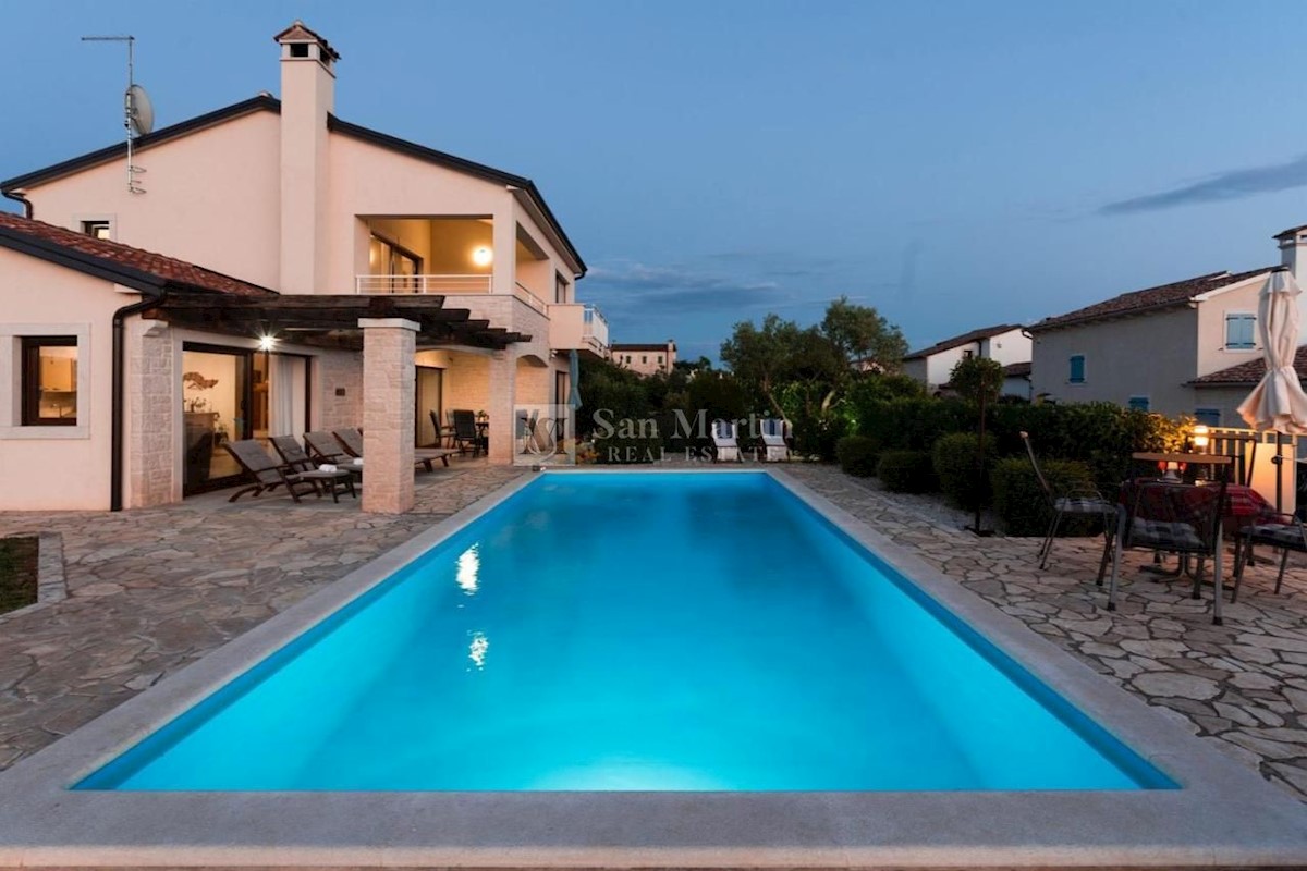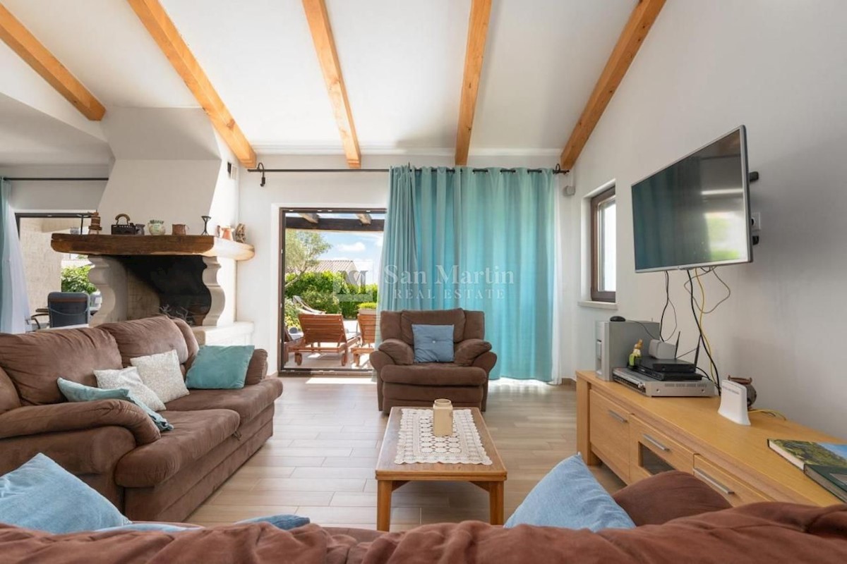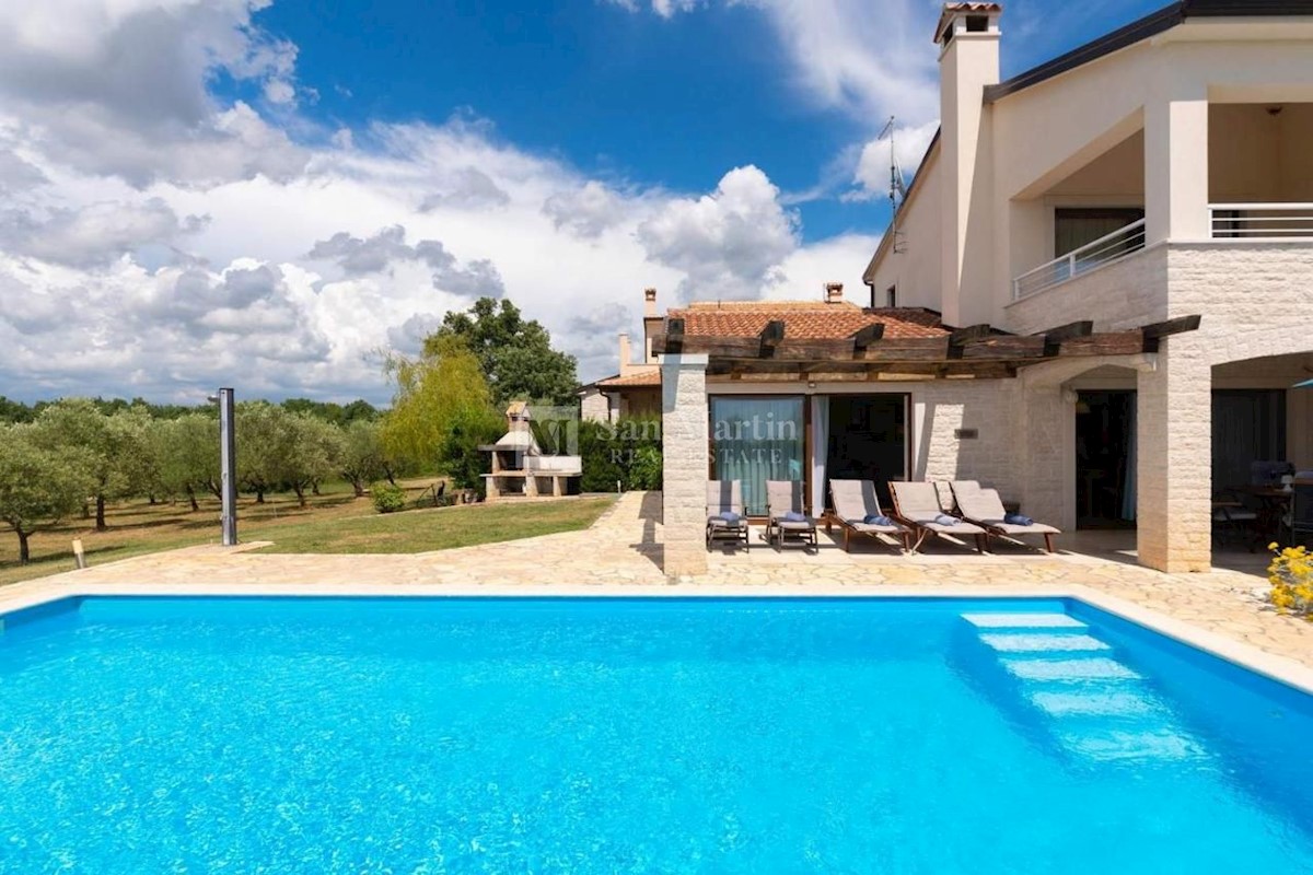 Poreč - okolica, hiša s čudovitim panoramskim razgledom! Ta hiša s skupno površino 166 m2 se nahaja na robu mirnega, lepega kraja nedaleč od Poreča, na urejenem vrtu. Hiša se razprostira na dveh etažah. V pritličju je dnevna soba z jedilnico in kuhinjo,