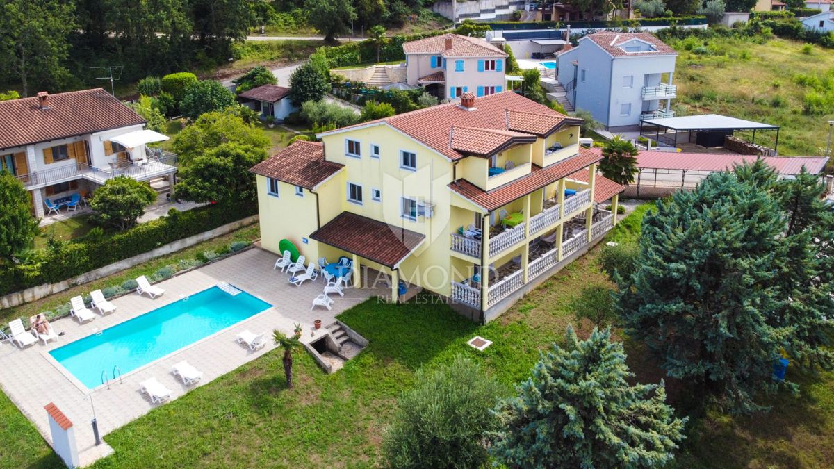 Poreč, apartmajska hiša z bazenom na atraktivni lokaciji! Ta prostorna apartmajska hiša s skupno šestimi apartmaji se nahaja v mirnem kraju med Porečom in Vrsarjem. Njegova skupna izmera je 510 m2 in se razprostira v dveh etažah. V pritličju se nahaja e