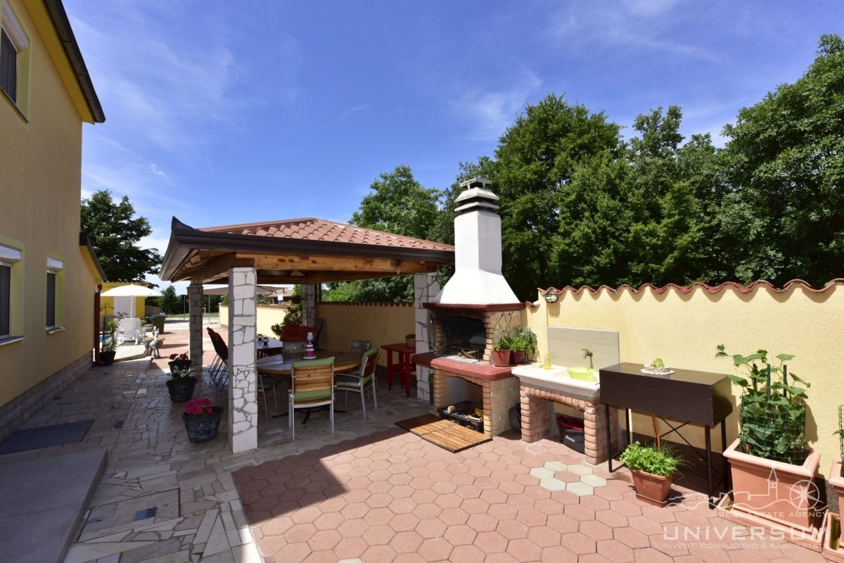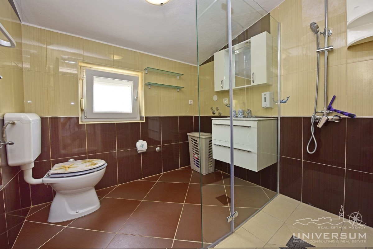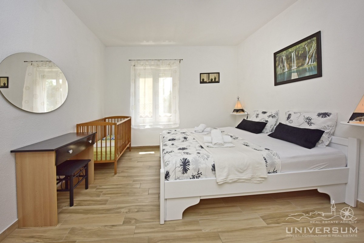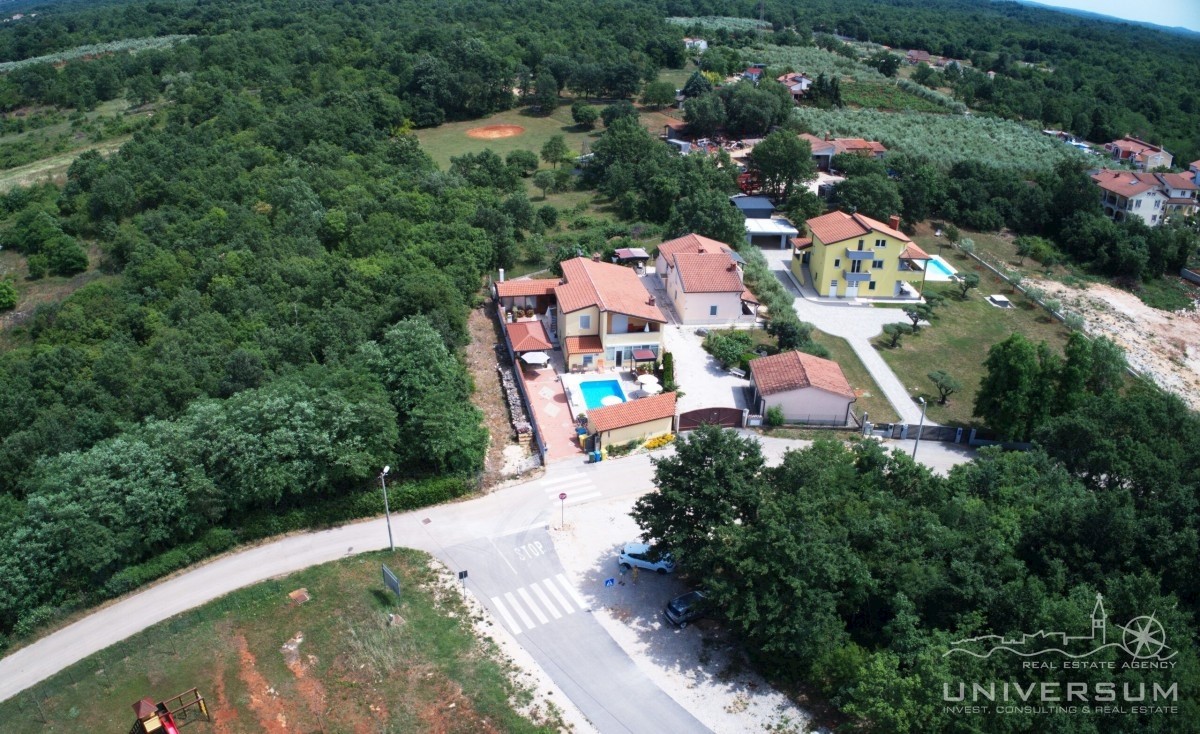 V bližini Poreča se prodaja ta stanovanjska hiša s skupno petimi apartmaji. Hiša je dvoetažna: v pritličju so trije apartmaji, v prvem nadstropju pa dva apartmaja. Vsak apartma ima dve spalnici, kopalnico, kuhinjo z jedilnico in dnevno sobo z izhodom na t