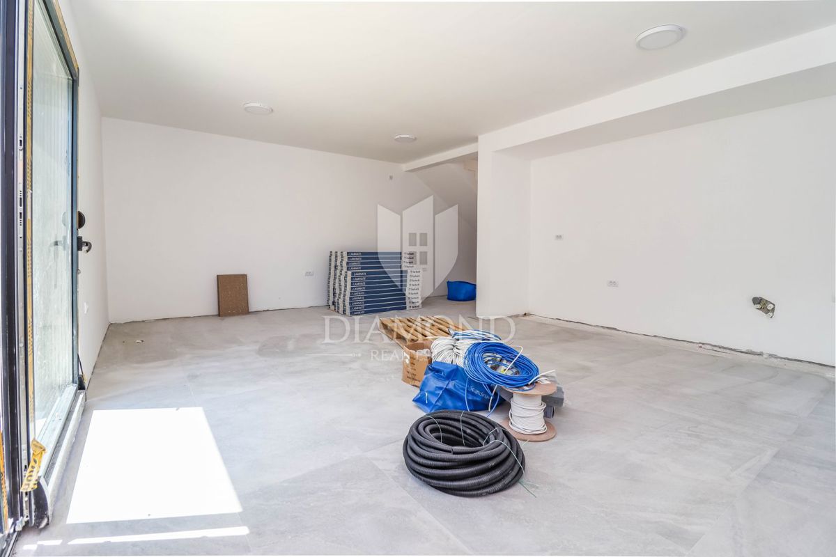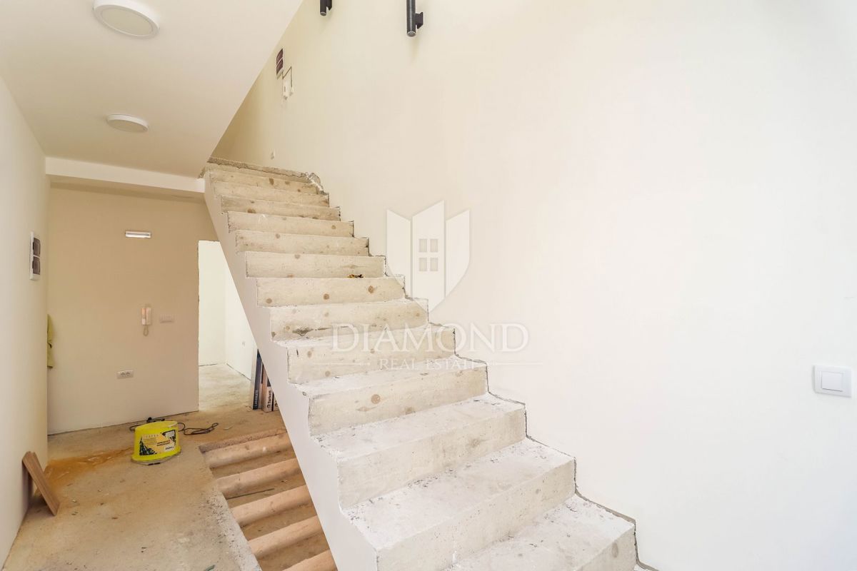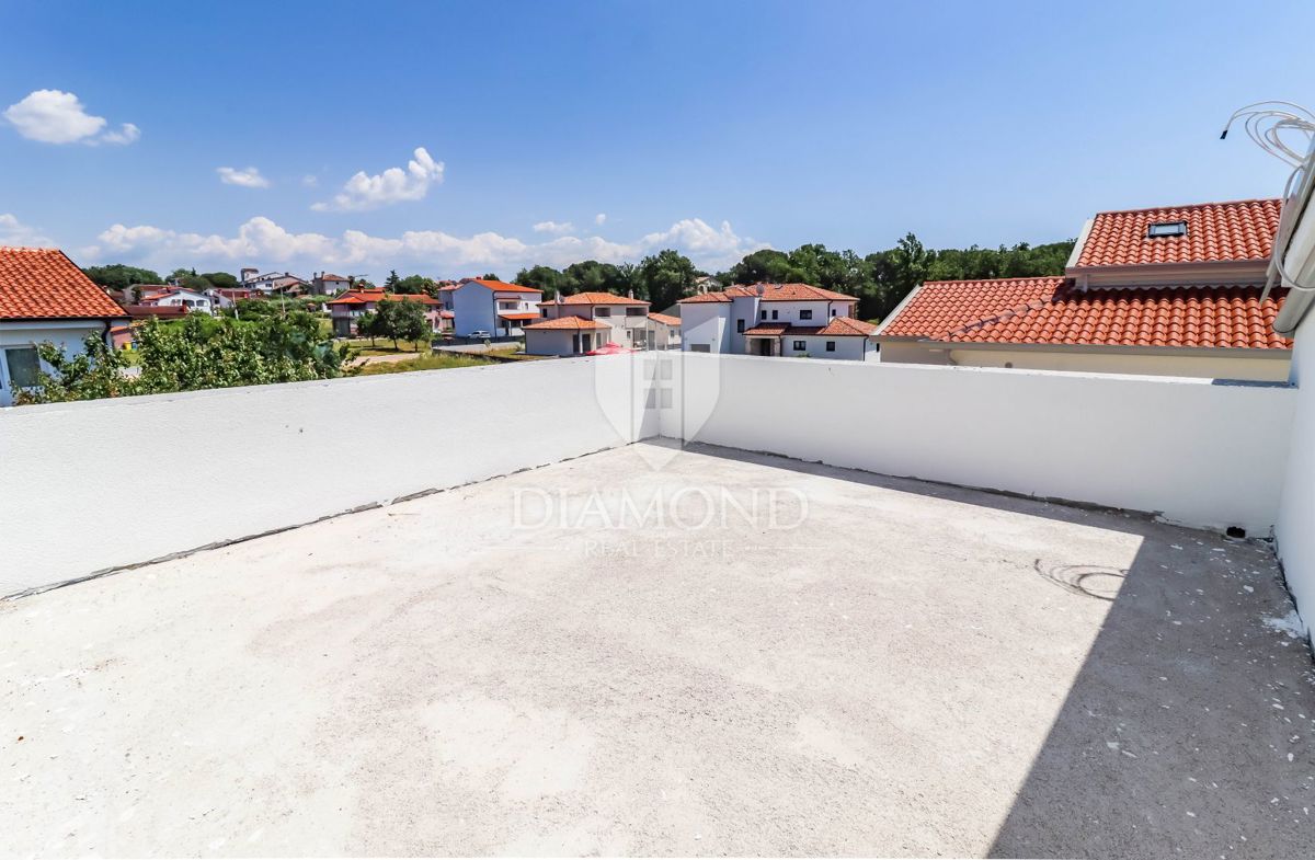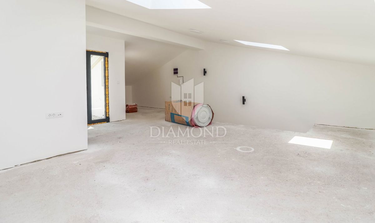 Poreč, odličen duplex po sistemu pametne hiše! Ta luksuzna in moderna hiša dvojček z vrtom je naprodaj na mirni lokaciji 1 km od mesta Poreč in morja. Hiša se razprostira v treh etažah in meri 187,93 m2. Pritličje hiše obsega predsobo, wc, spalnico, k