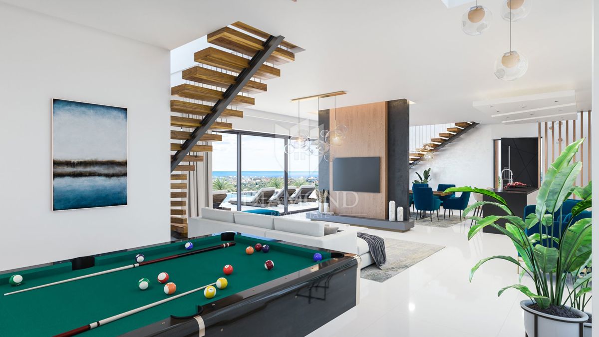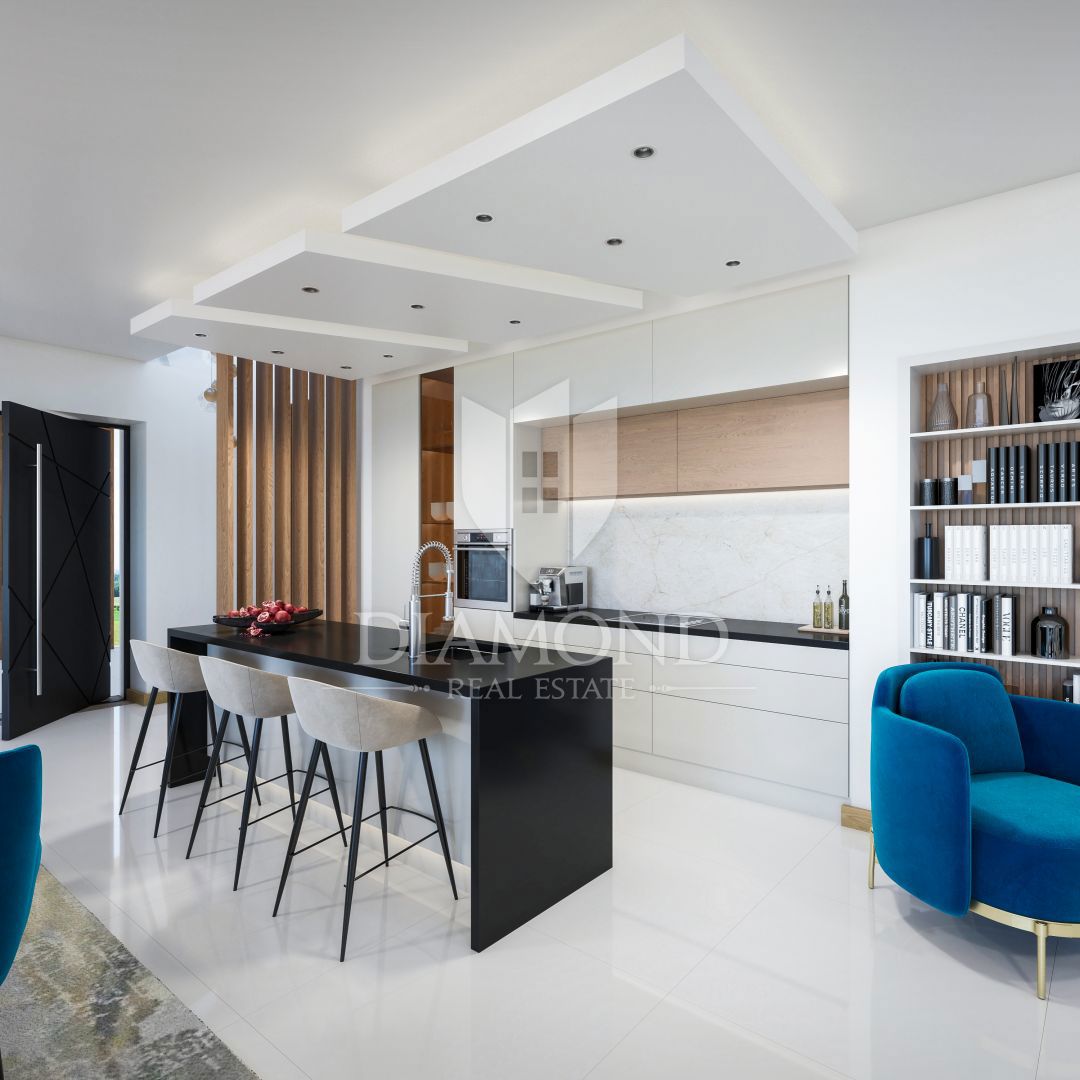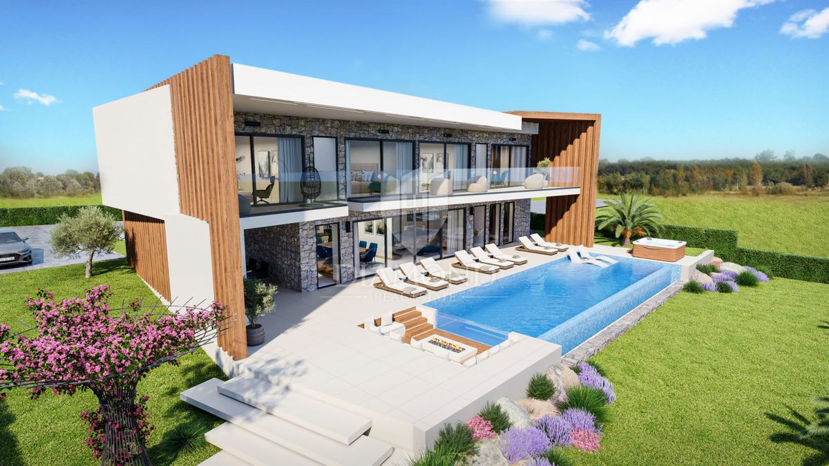 Poreč, okolica, luksuzna vila s panoramskim pogledom na morje! Ta impresivna vila izstopa po edinstvenem modernem dizajnu, obogatenem z avtentičnimi kamnitimi deli in lesenimi elementi, kar ima za posledico popolno mešanico stila in funkcionalnosti, ki