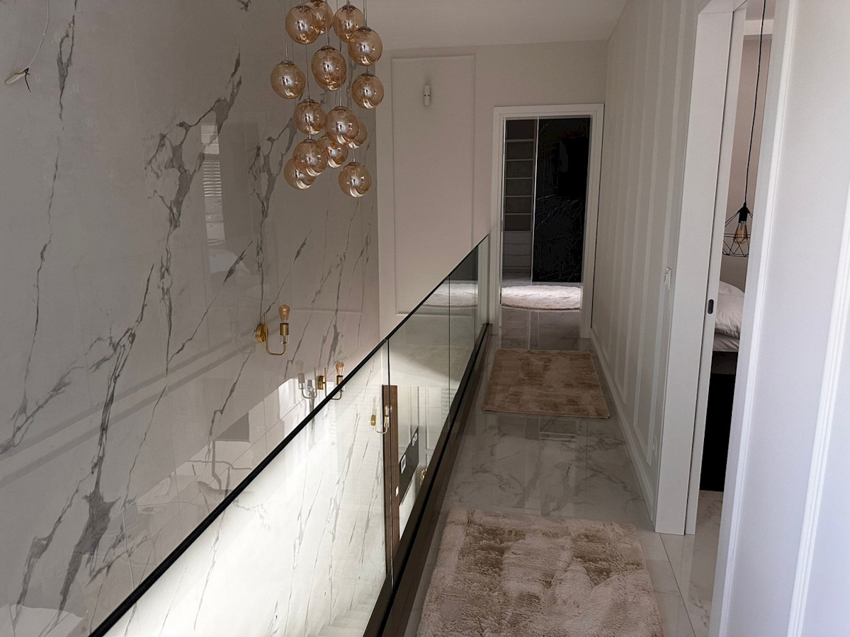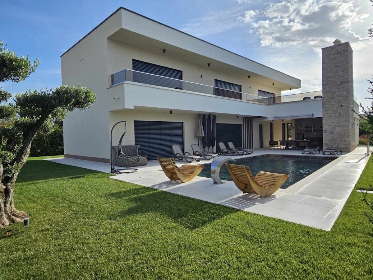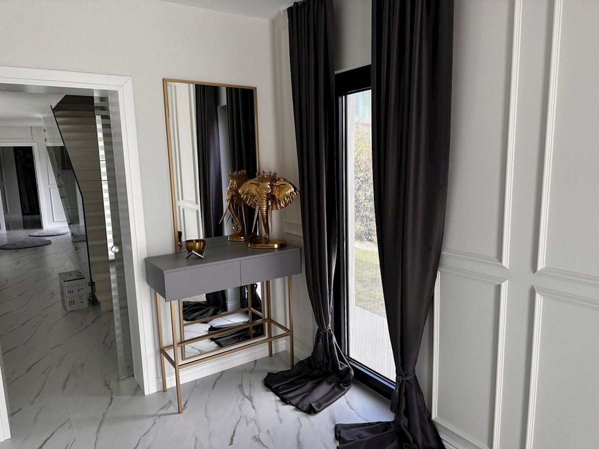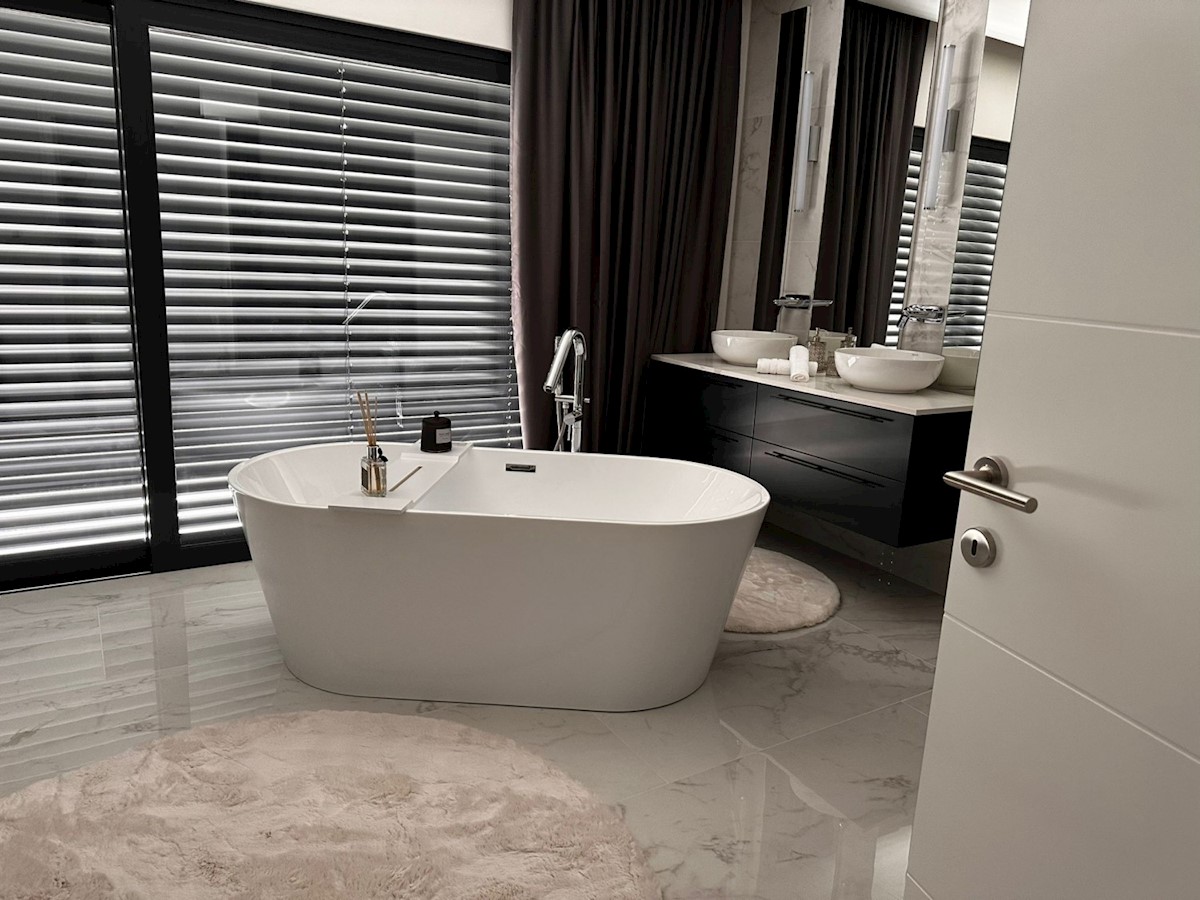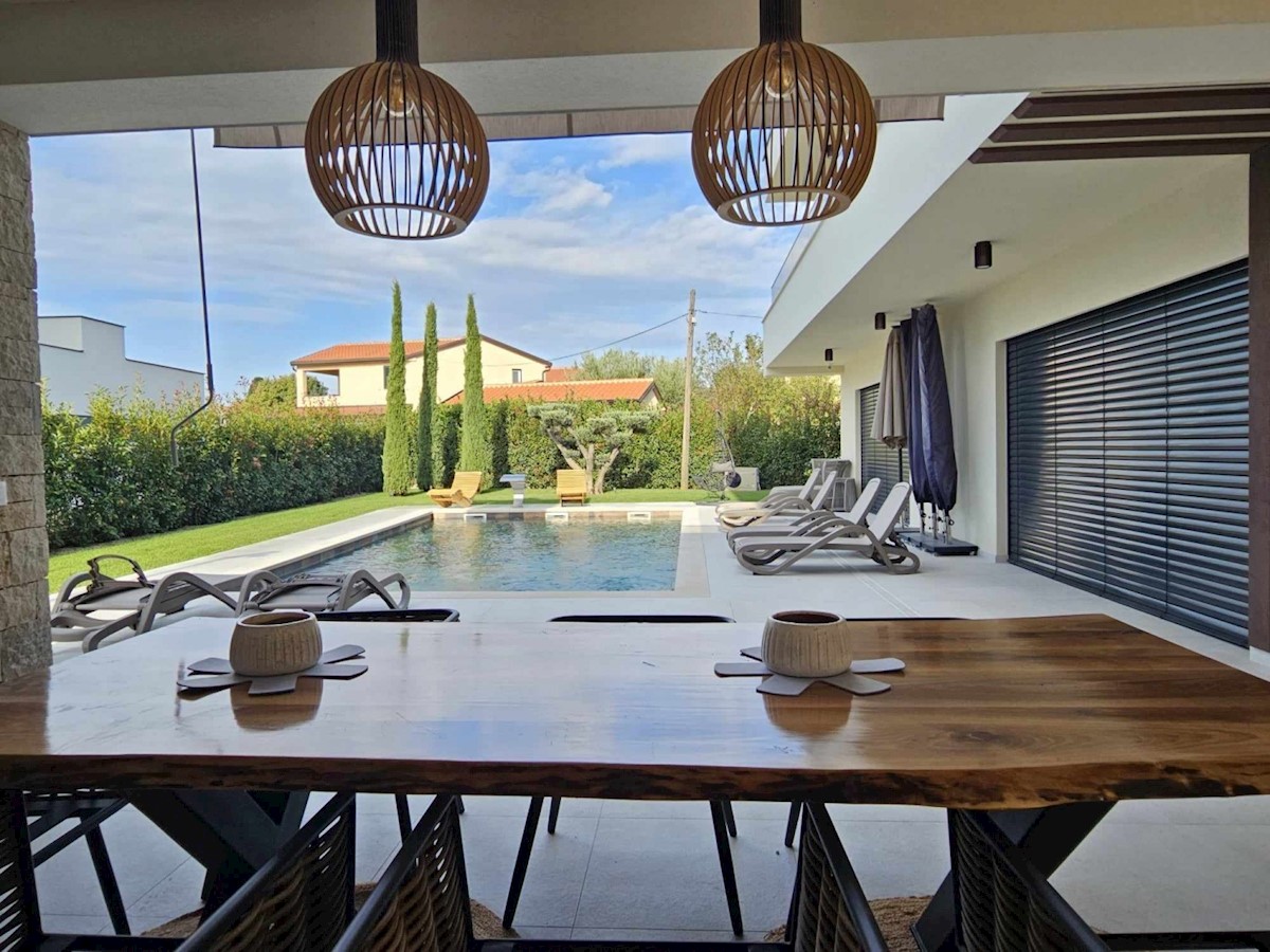POREČ - luksuzna vila na mirni lokaciji, cca 2 km od Poreča in morja - Vila ima 360 m2 bruto površine - obsega dnevno sobo s kuhinjo in jedilnico, 4 spalnice, 5 kopalnic, WC za goste, letna kuhinja in prostorna terasa s pogledom na morje - hiša se prodaja