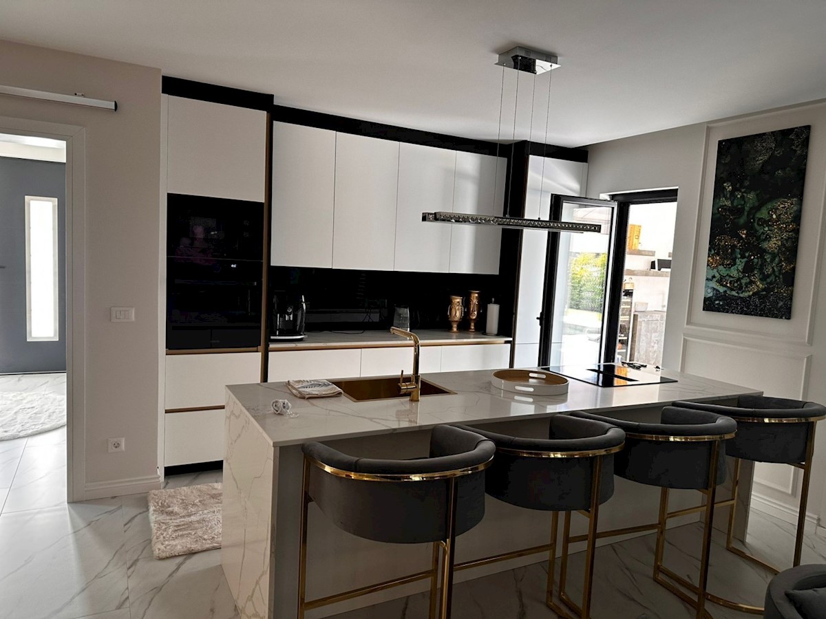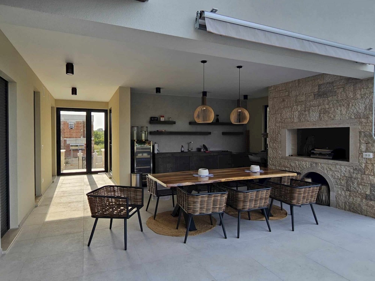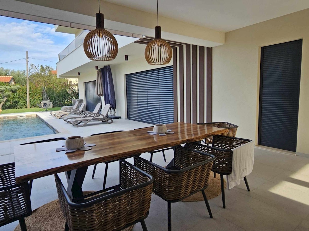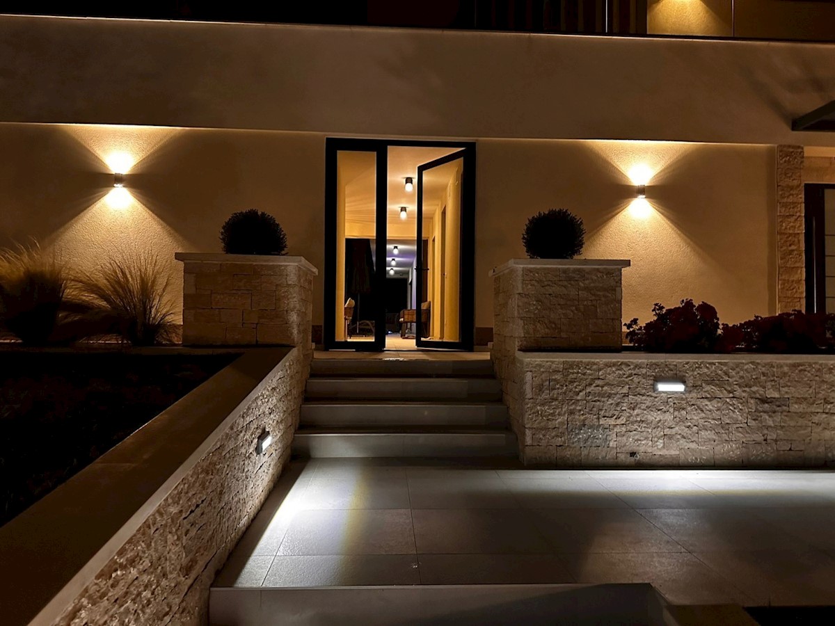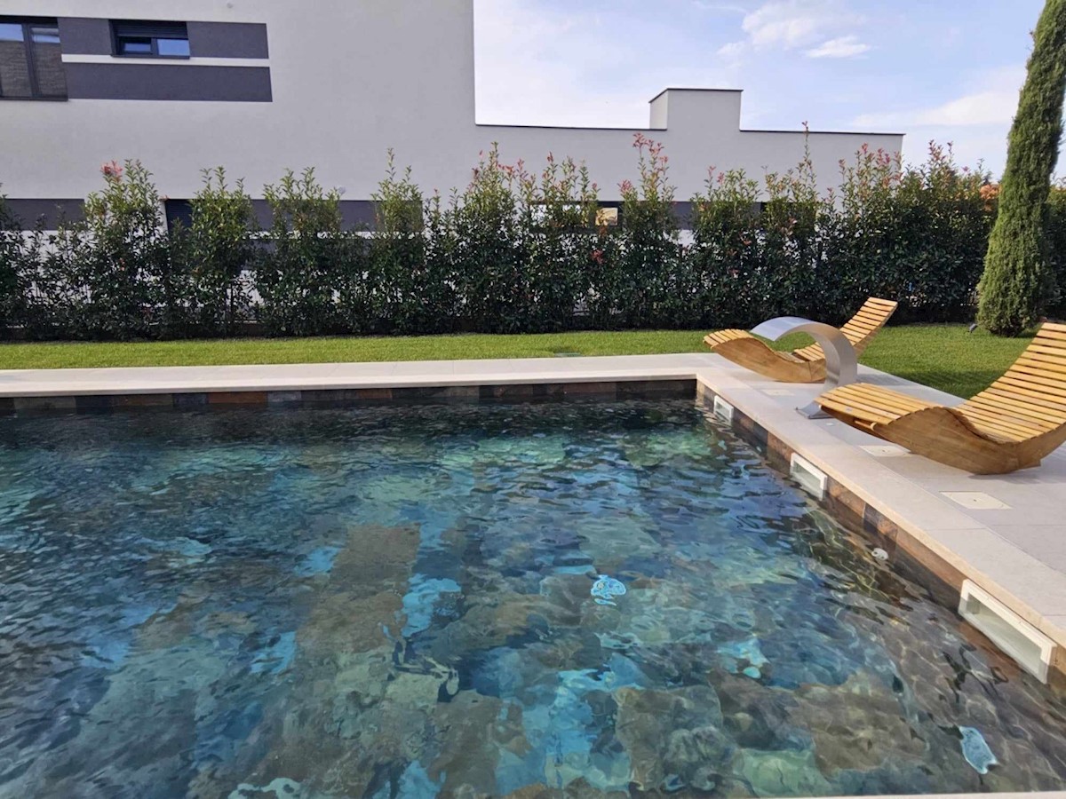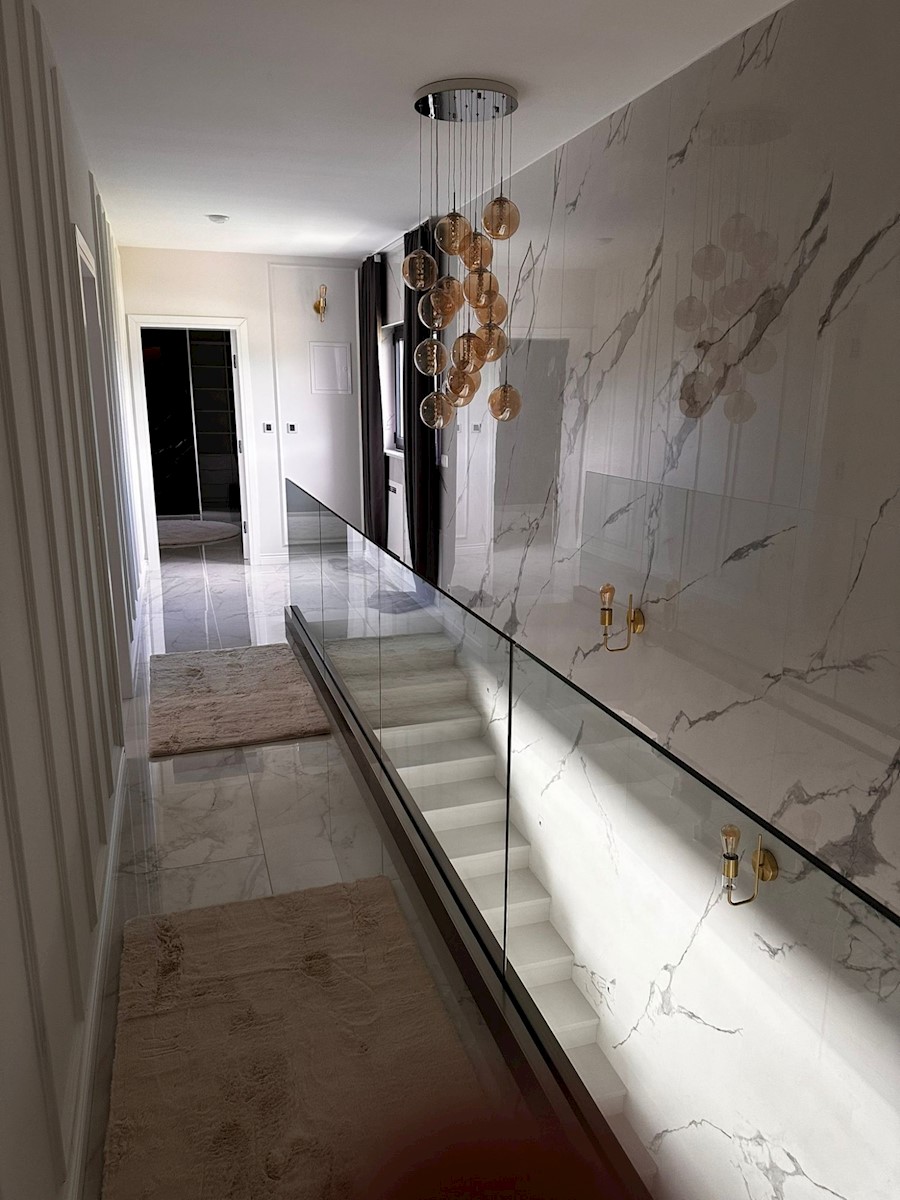 POREČ - luksuzna vila na mirni lokaciji, cca 2 km od Poreča in morja - Vila ima 360 m2 bruto površine - obsega dnevno sobo s kuhinjo in jedilnico, 4 spalnice, 5 kopalnic, WC za goste, letna kuhinja in prostorna terasa s pogledom na morje - hiša se prodaja