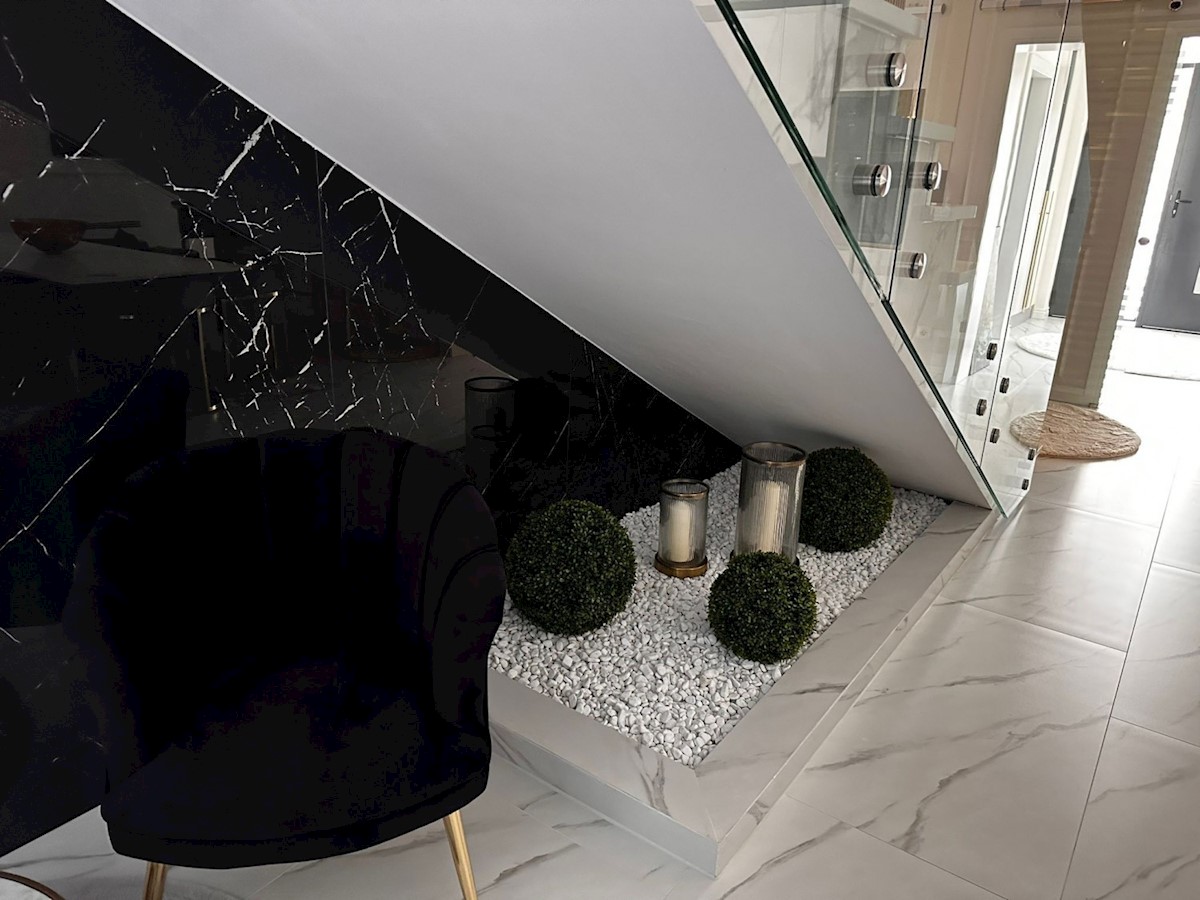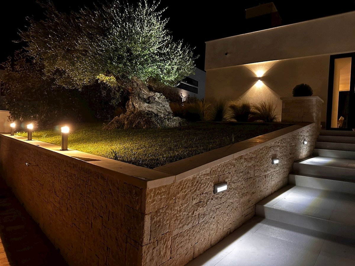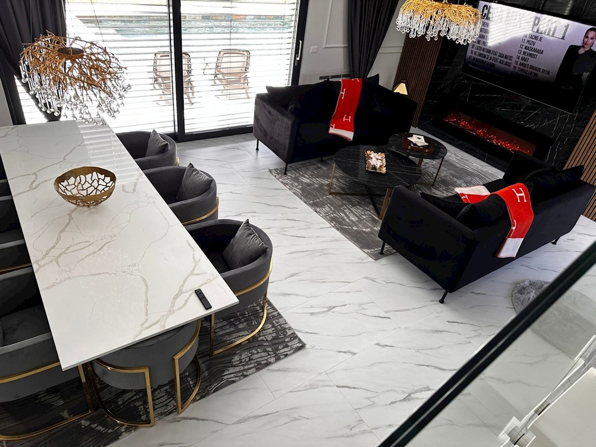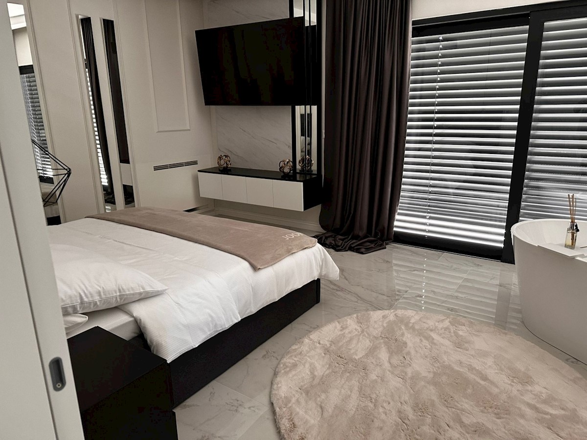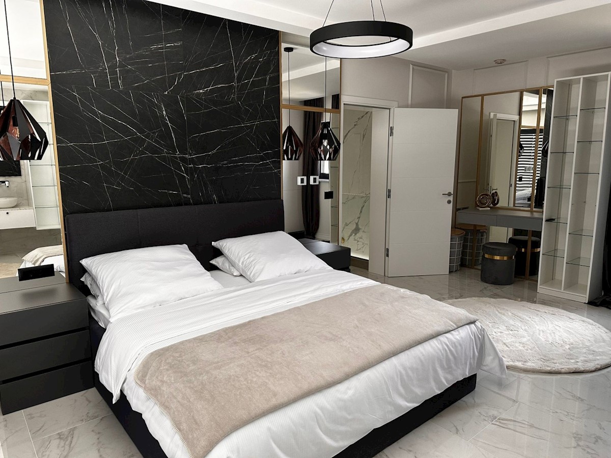 POREČ - luksuzna vila na mirni lokaciji, cca 2 km od Poreča in morja - Vila ima 360 m2 bruto površine - obsega dnevno sobo s kuhinjo in jedilnico, 4 spalnice, 5 kopalnic, WC za goste, letna kuhinja in prostorna terasa s pogledom na morje - hiša se prodaja