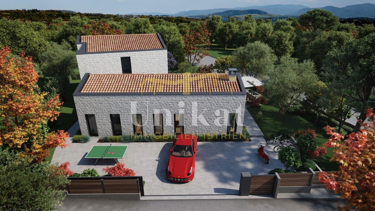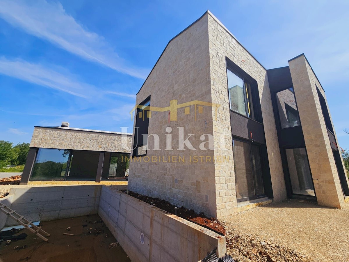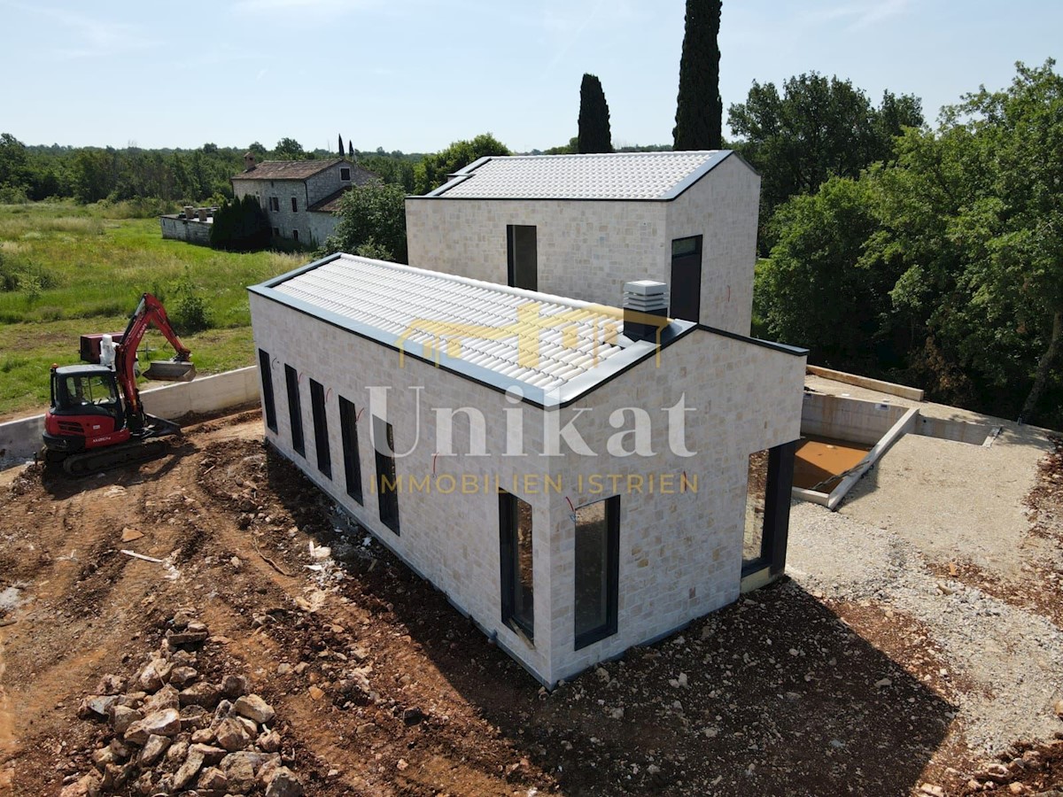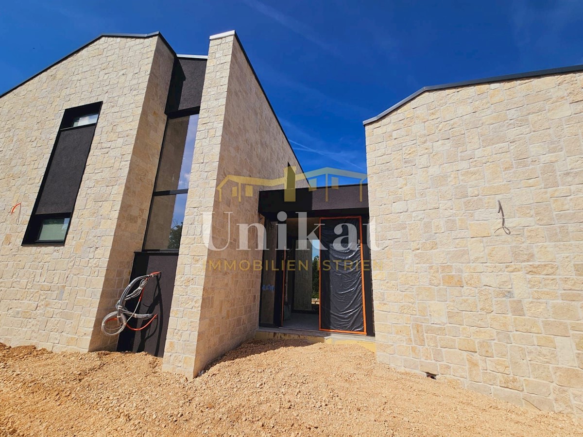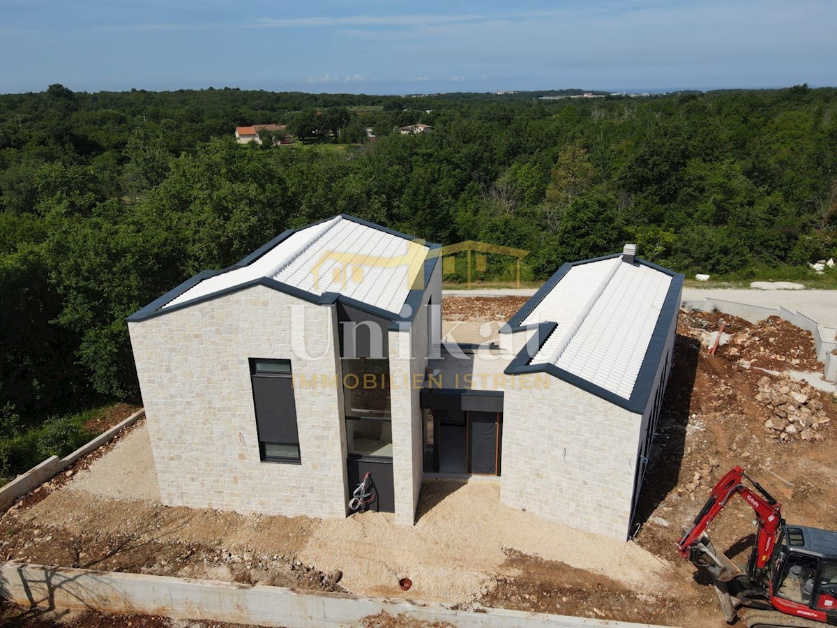 Modern house clad in natural stone, just a few kilometers from Poreč and the sea. The house is on the edge of a quiet place with a view of nature. On the ground floor there are living room with kitchen and dining area, two bedrooms, two bathrooms and a se