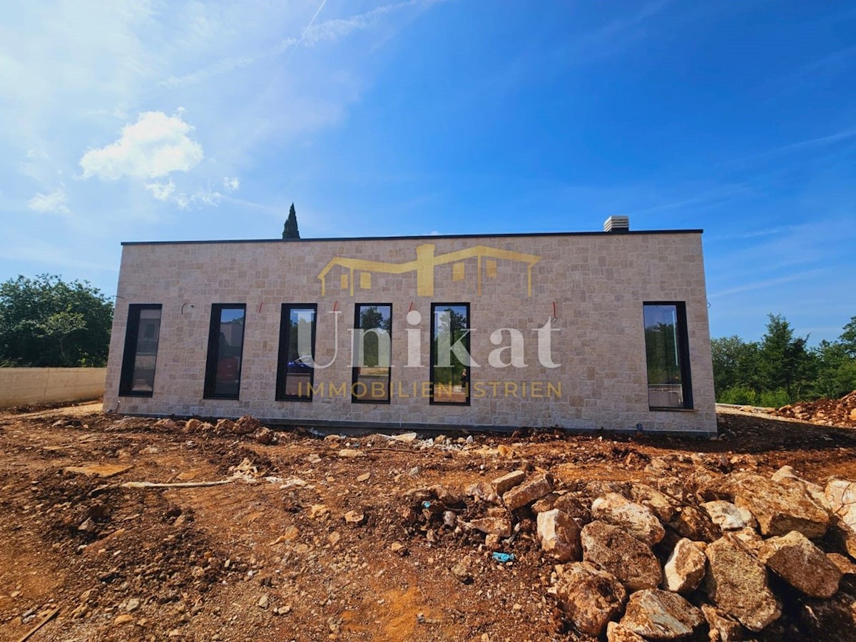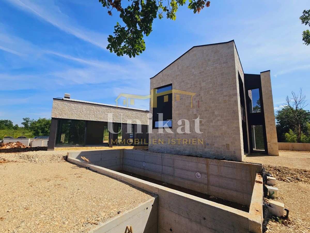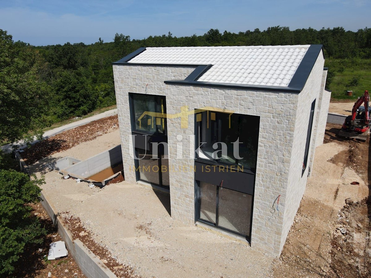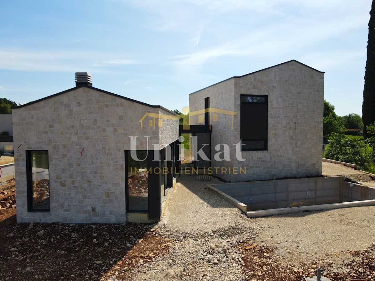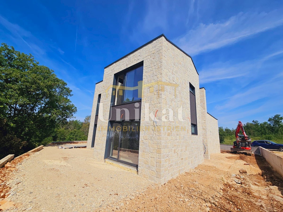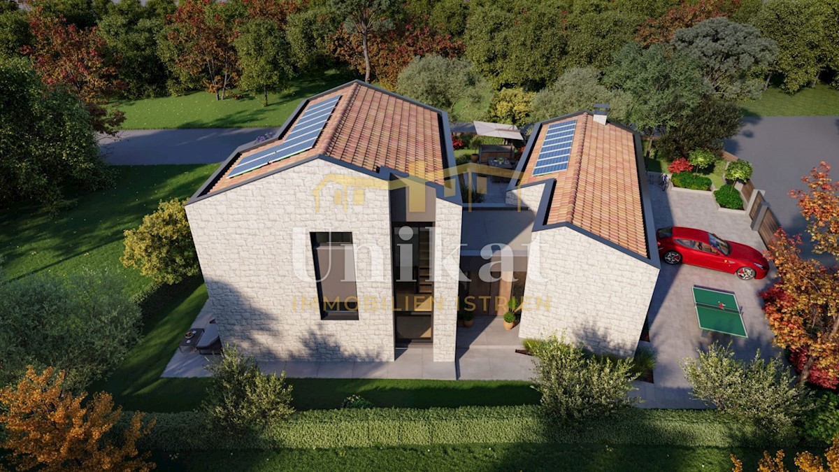 Modern house clad in natural stone, just a few kilometers from Poreč and the sea. The house is on the edge of a quiet place with a view of nature. On the ground floor there are living room with kitchen and dining area, two bedrooms, two bathrooms and a se