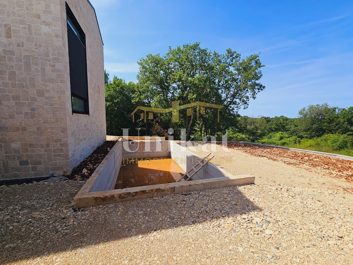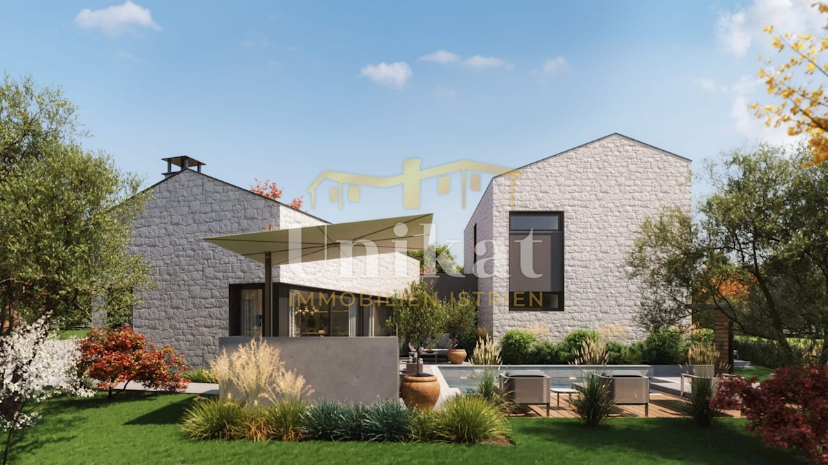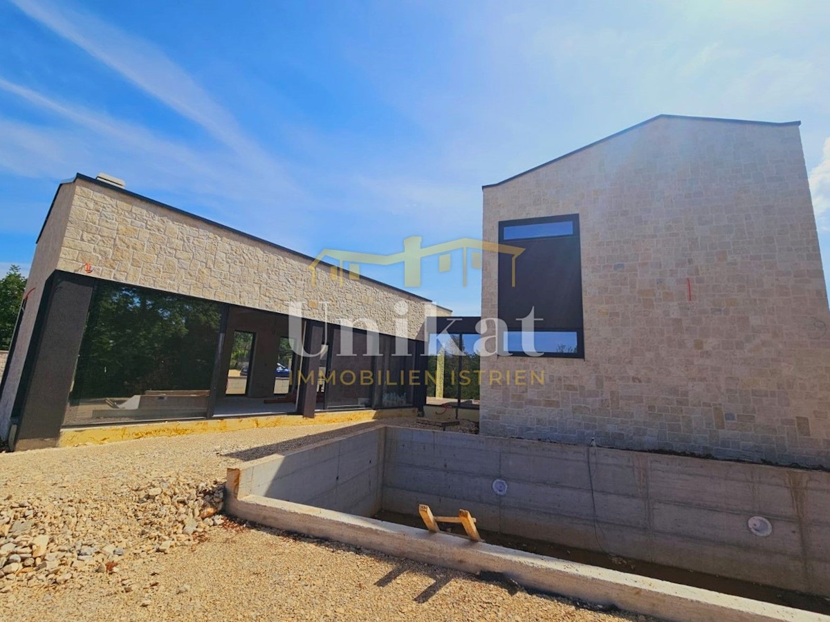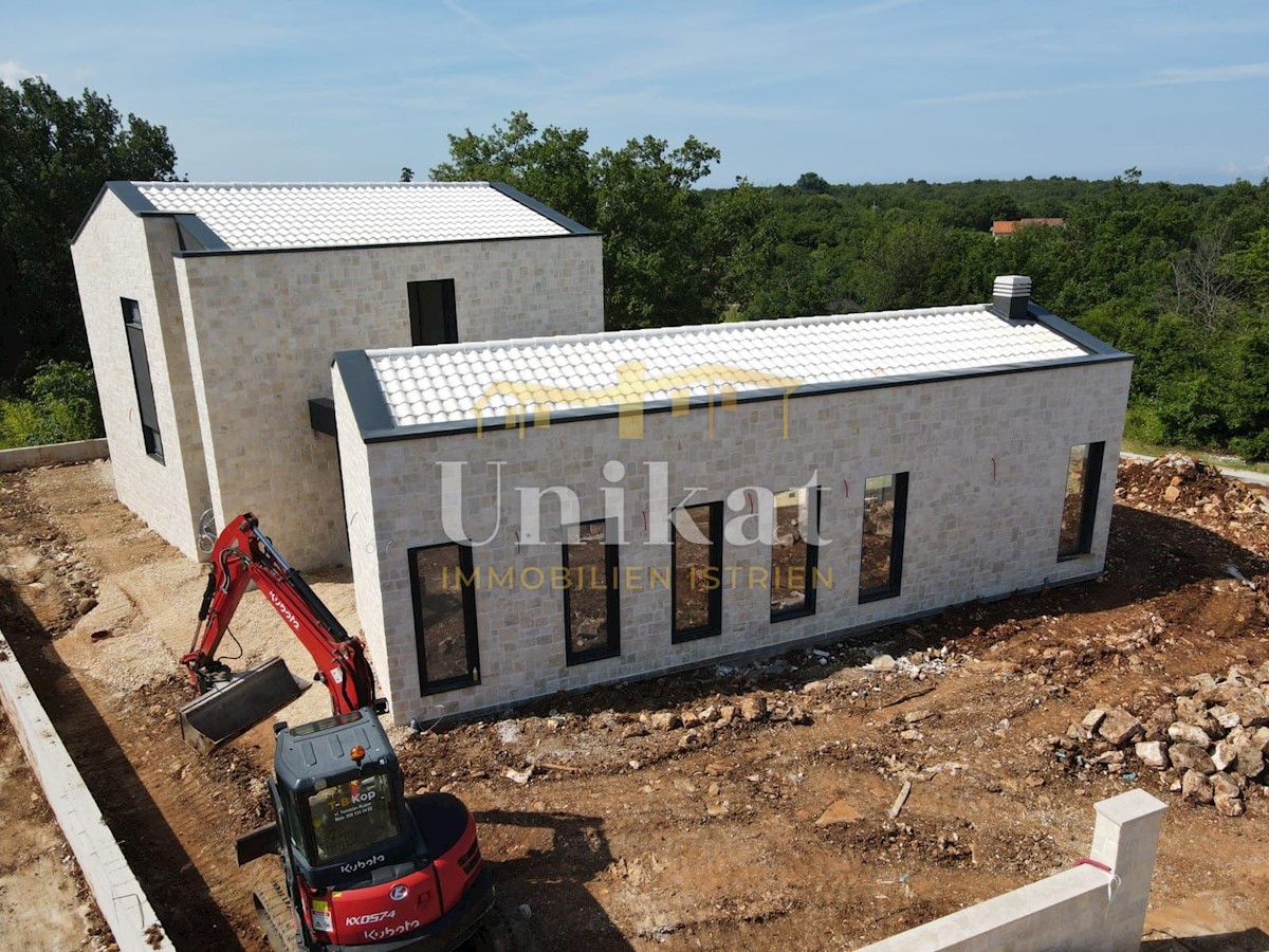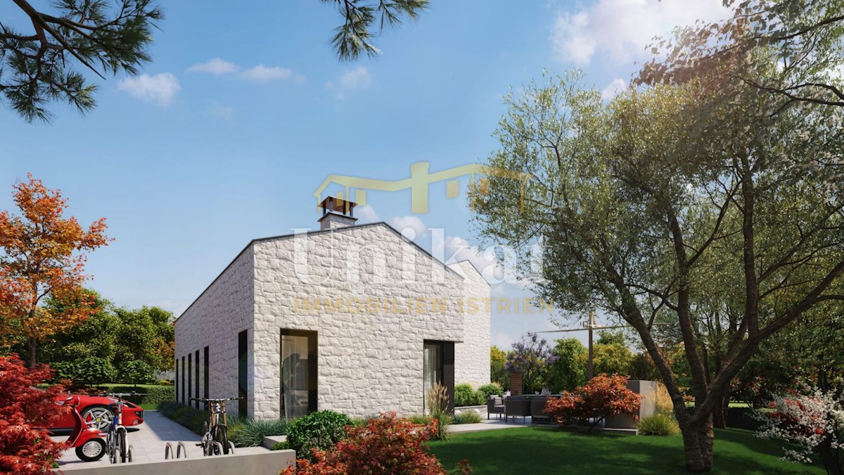 Modern house clad in natural stone, just a few kilometers from Poreč and the sea. The house is on the edge of a quiet place with a view of nature. On the ground floor there are living room with kitchen and dining area, two bedrooms, two bathrooms and a se