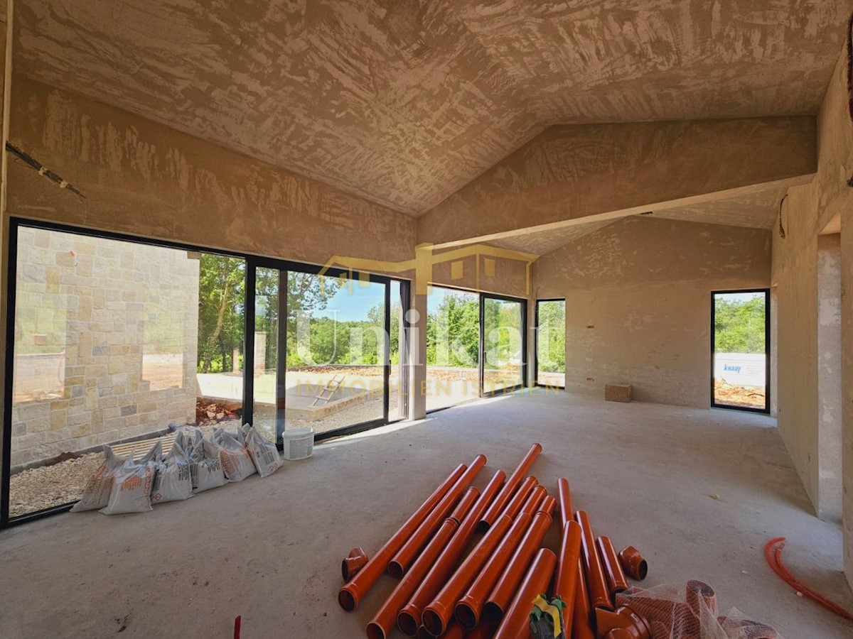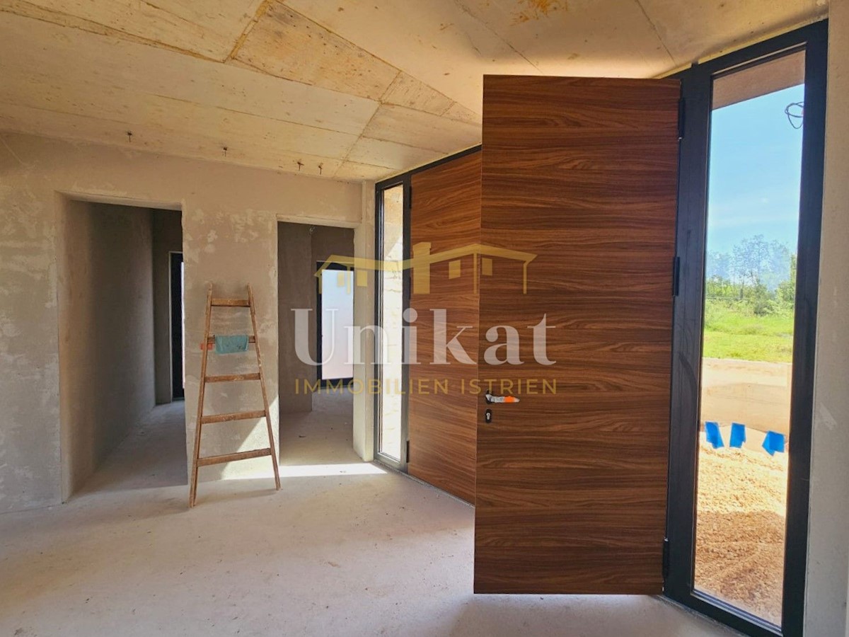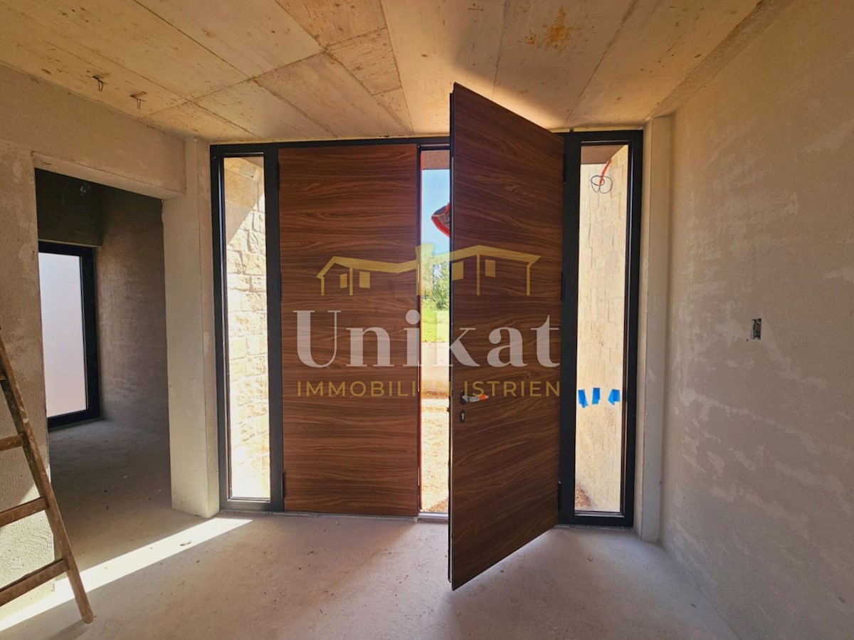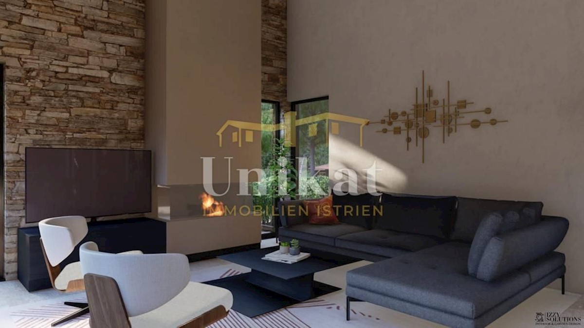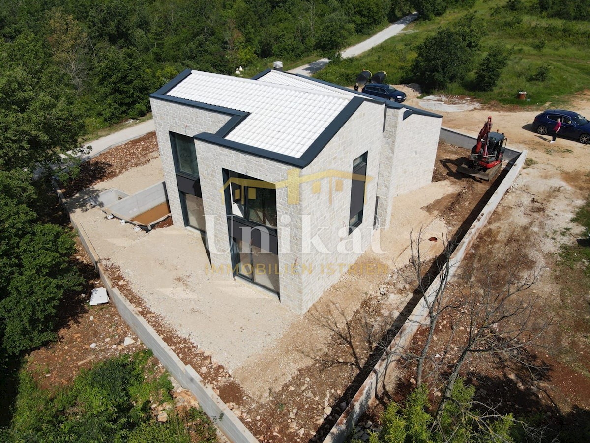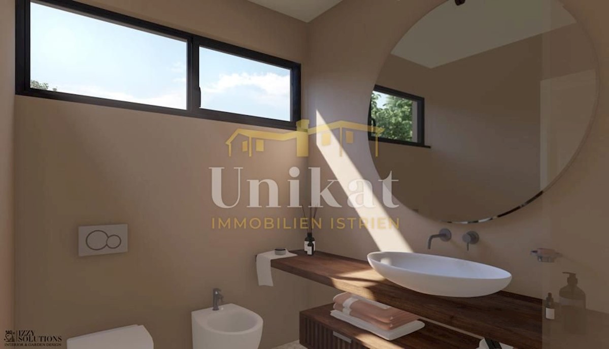 Modern house clad in natural stone, just a few kilometers from Poreč and the sea. The house is on the edge of a quiet place with a view of nature. On the ground floor there are living room with kitchen and dining area, two bedrooms, two bathrooms and a se