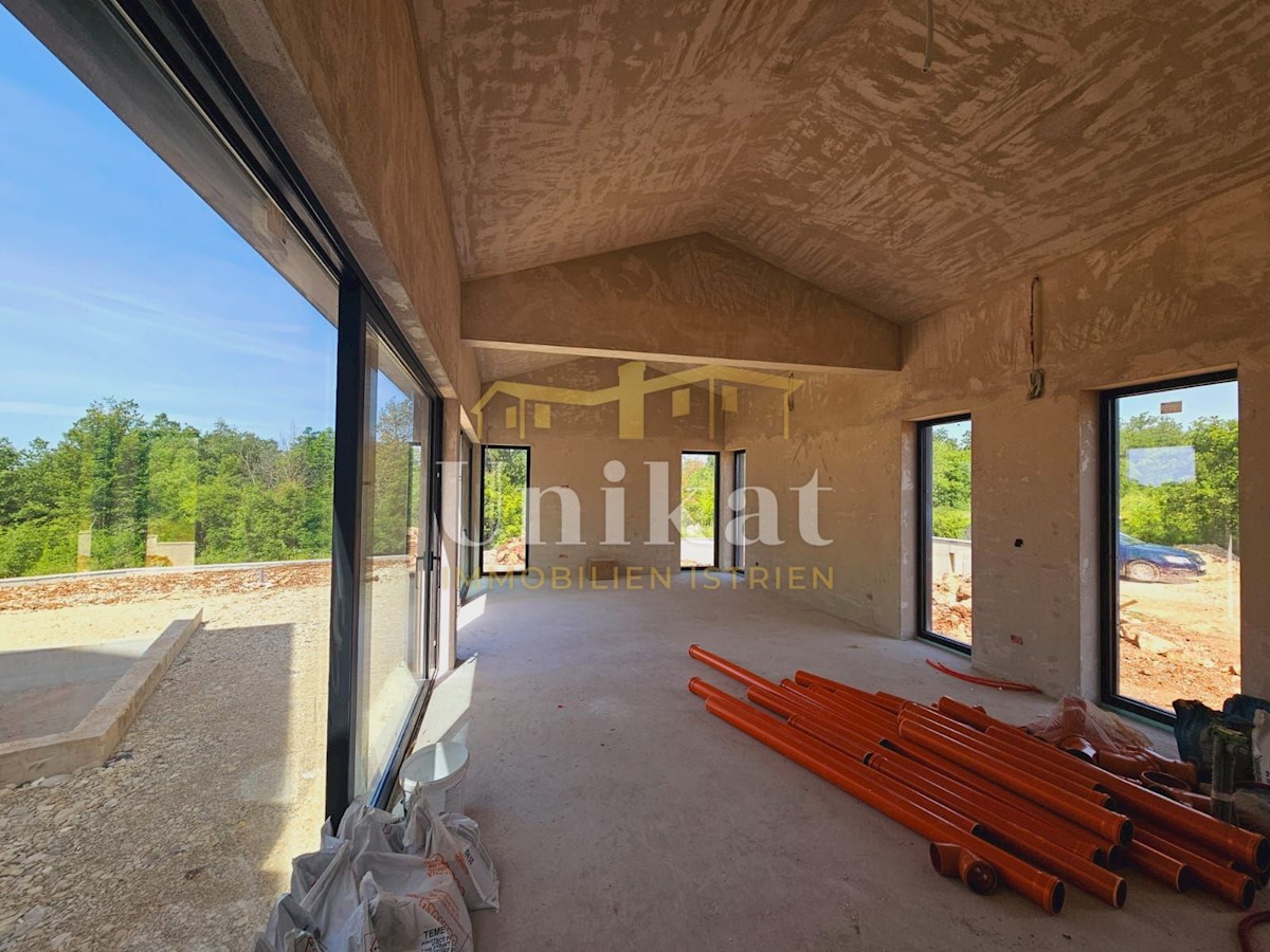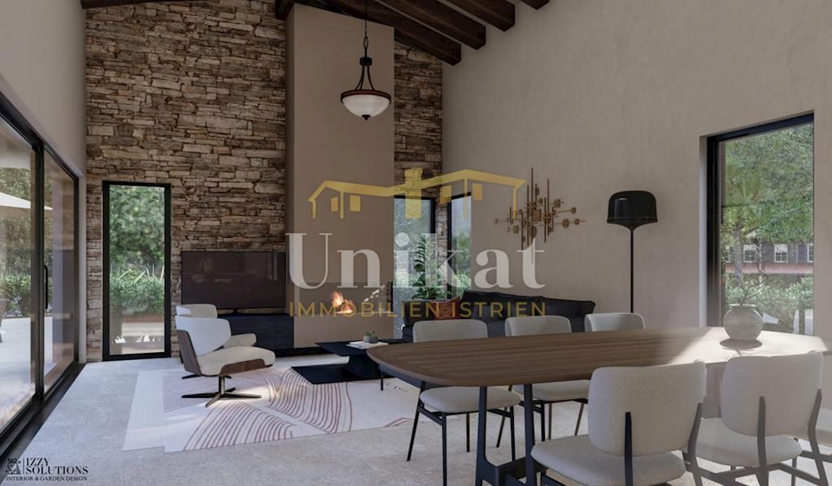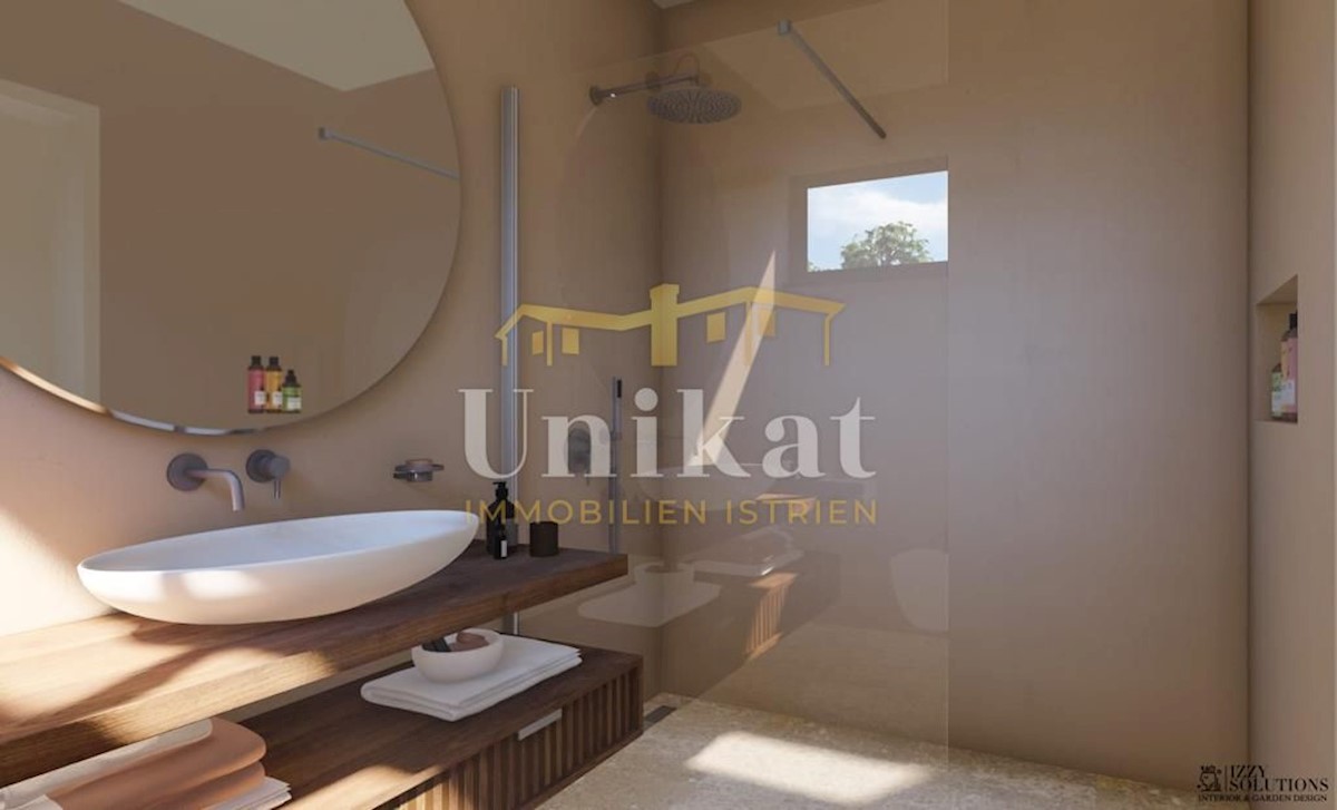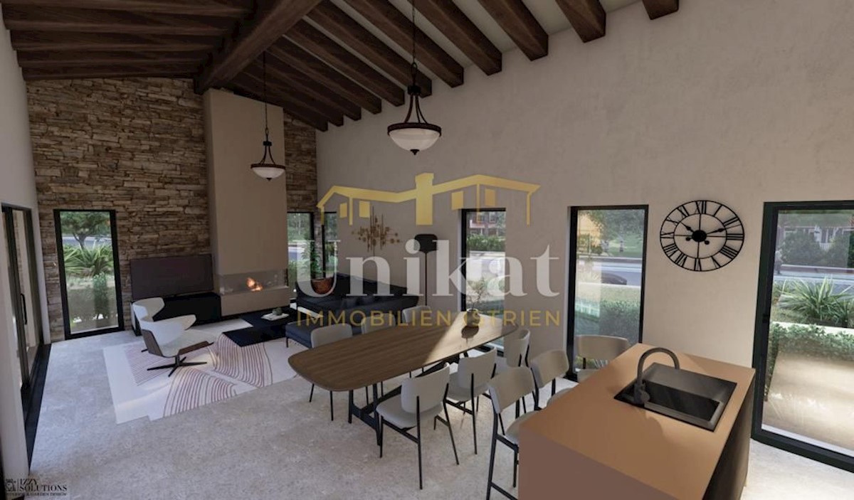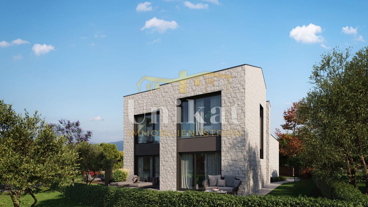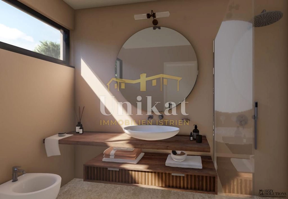 Modern house clad in natural stone, just a few kilometers from Poreč and the sea. The house is on the edge of a quiet place with a view of nature. On the ground floor there are living room with kitchen and dining area, two bedrooms, two bathrooms and a se