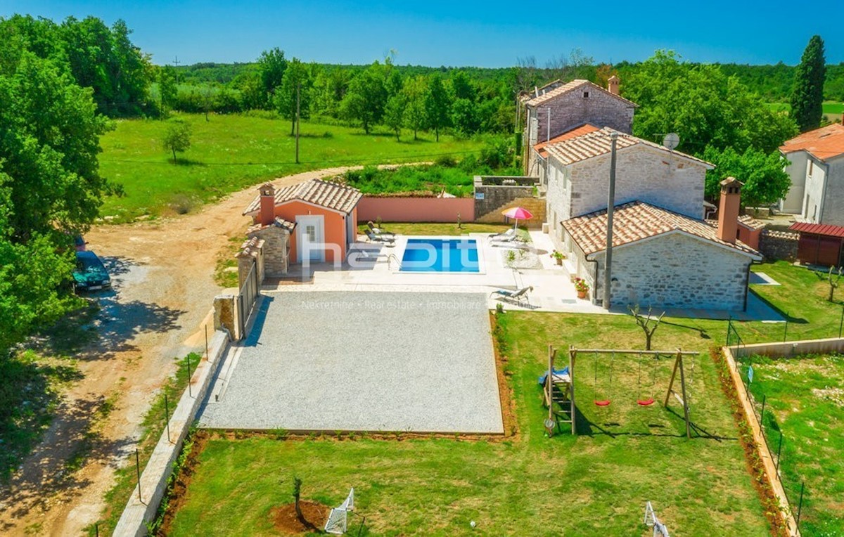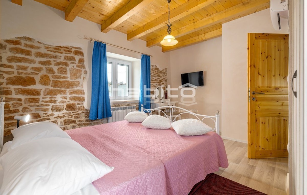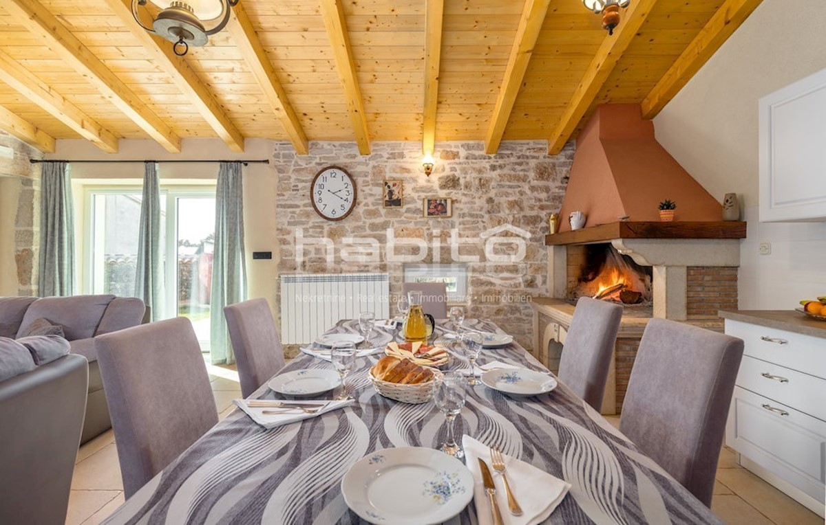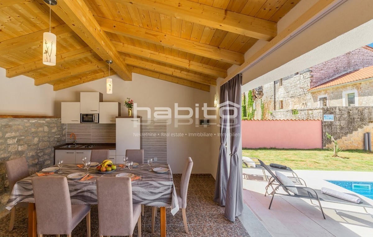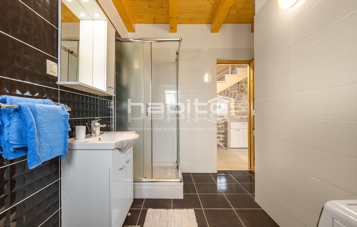 Stone house of approx. 150 m2 with a pool is designed in a modern style while keeping a touch of the original Istrian tradition. On the ground floor there is a living room, a kitchen, a dining room, a storage room and a bedroom with its own bathroom. On t