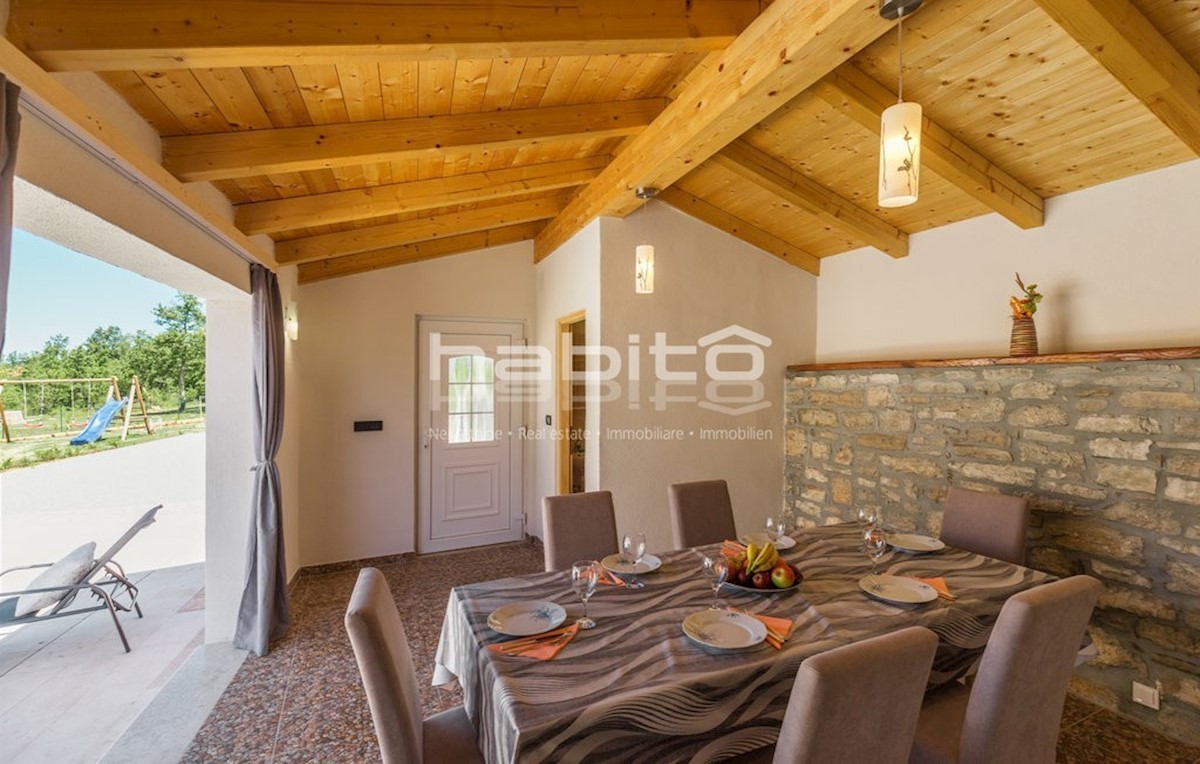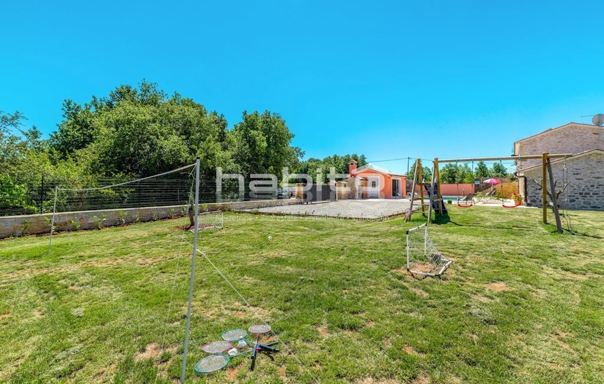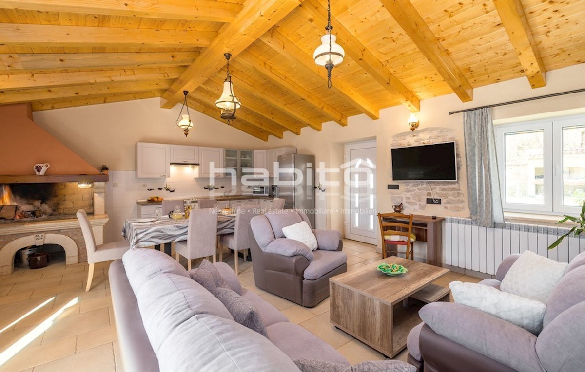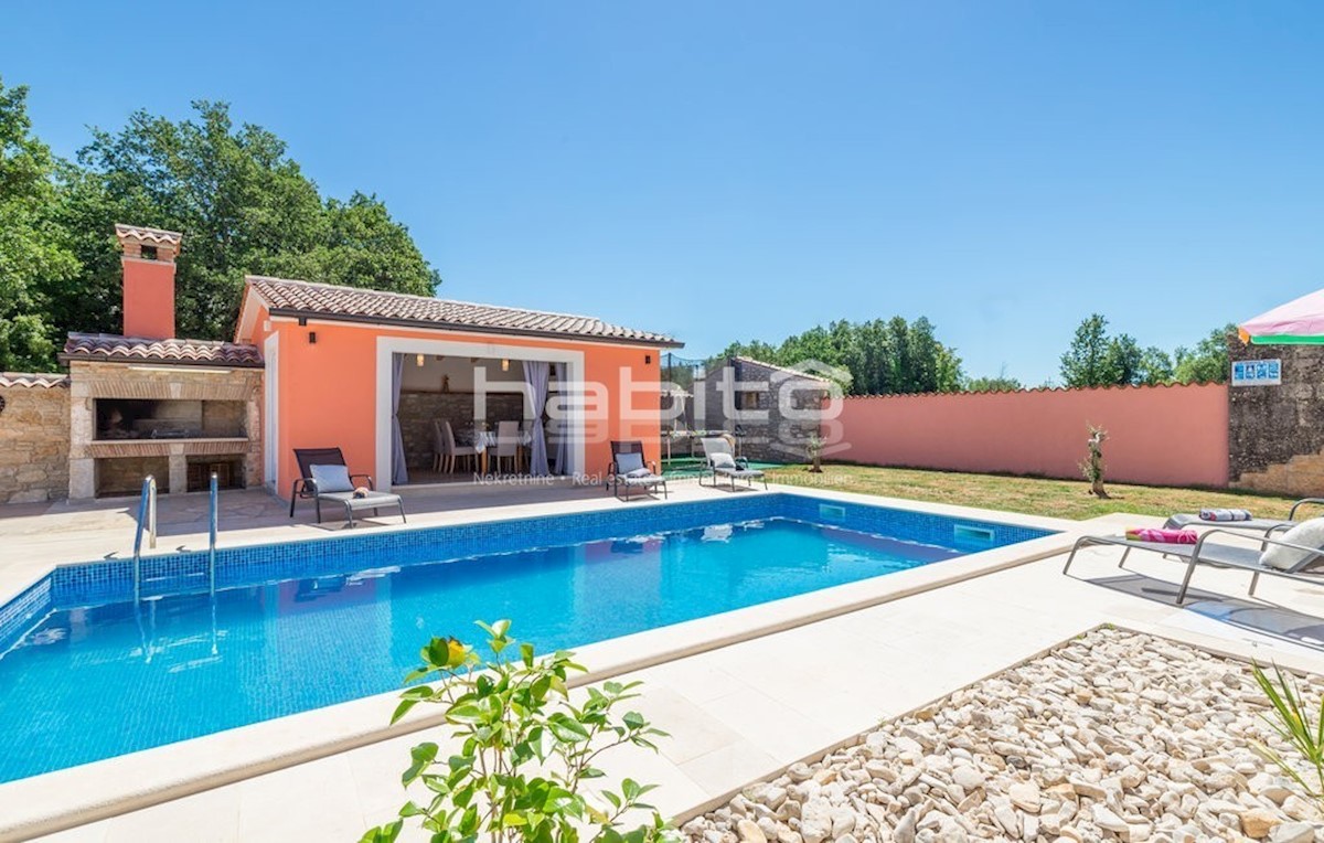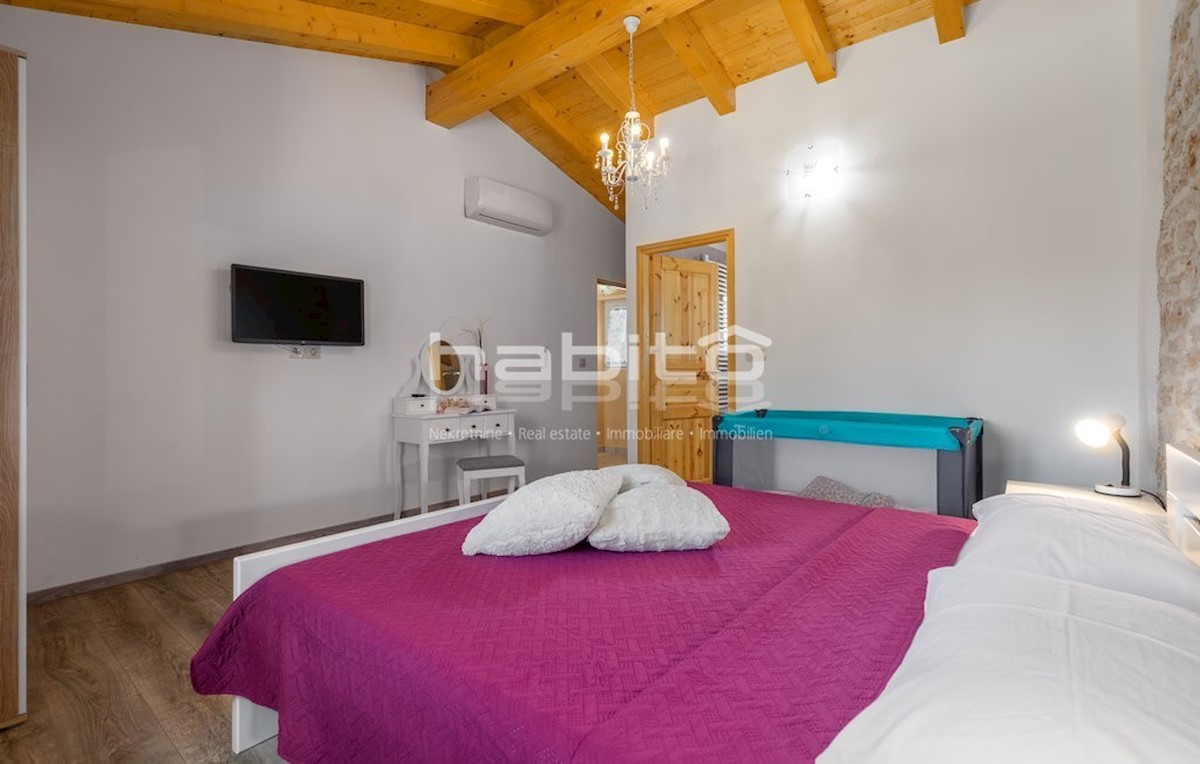 Stone house of approx. 150 m2 with a pool is designed in a modern style while keeping a touch of the original Istrian tradition. On the ground floor there is a living room, a kitchen, a dining room, a storage room and a bedroom with its own bathroom. On t