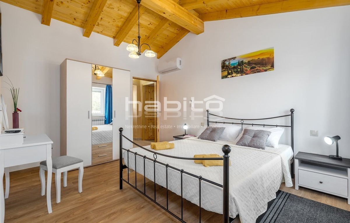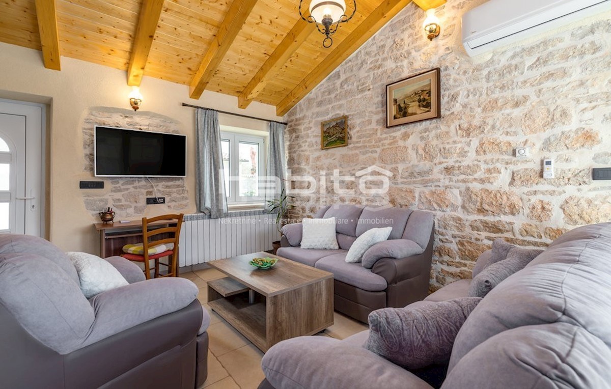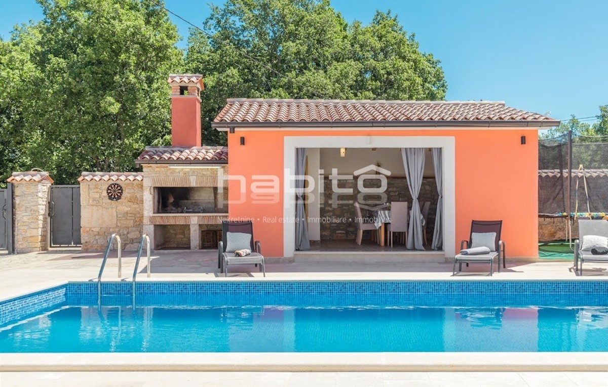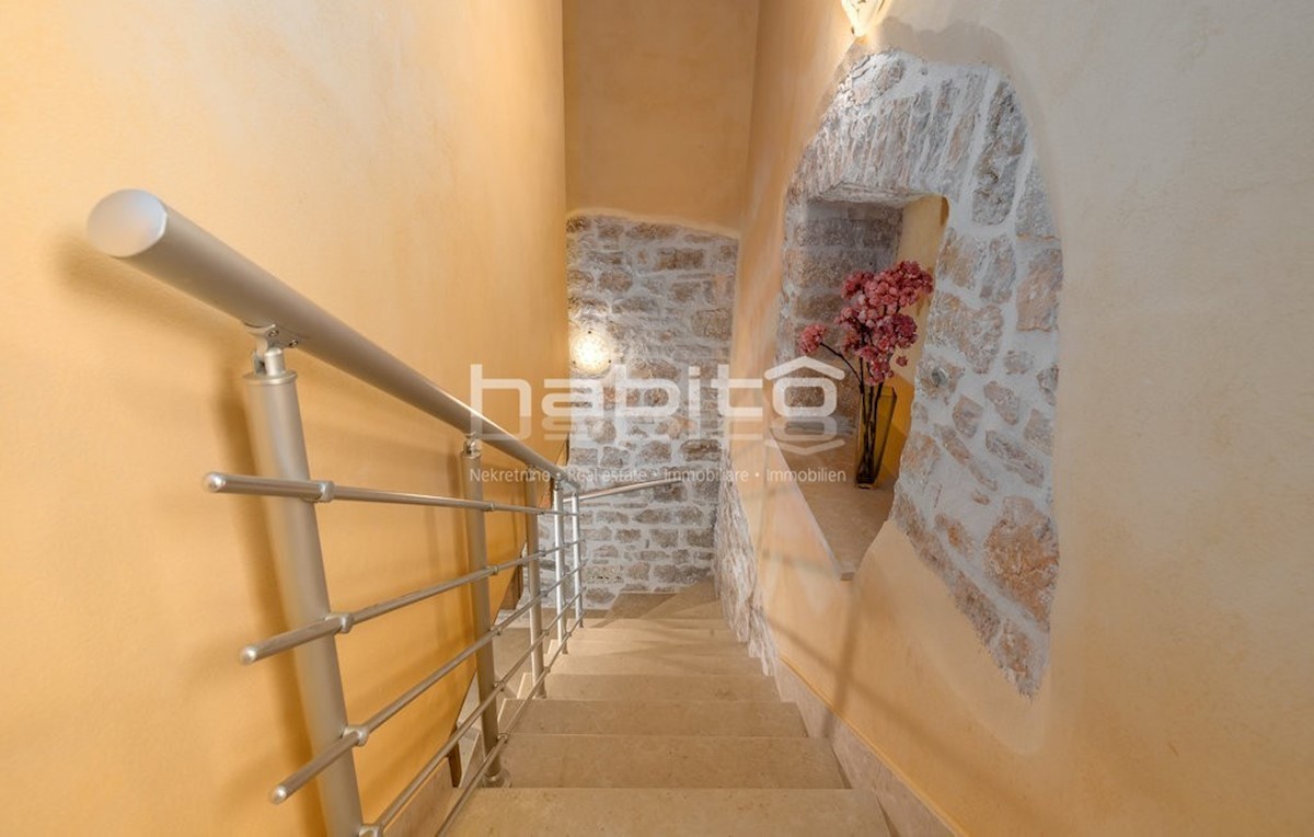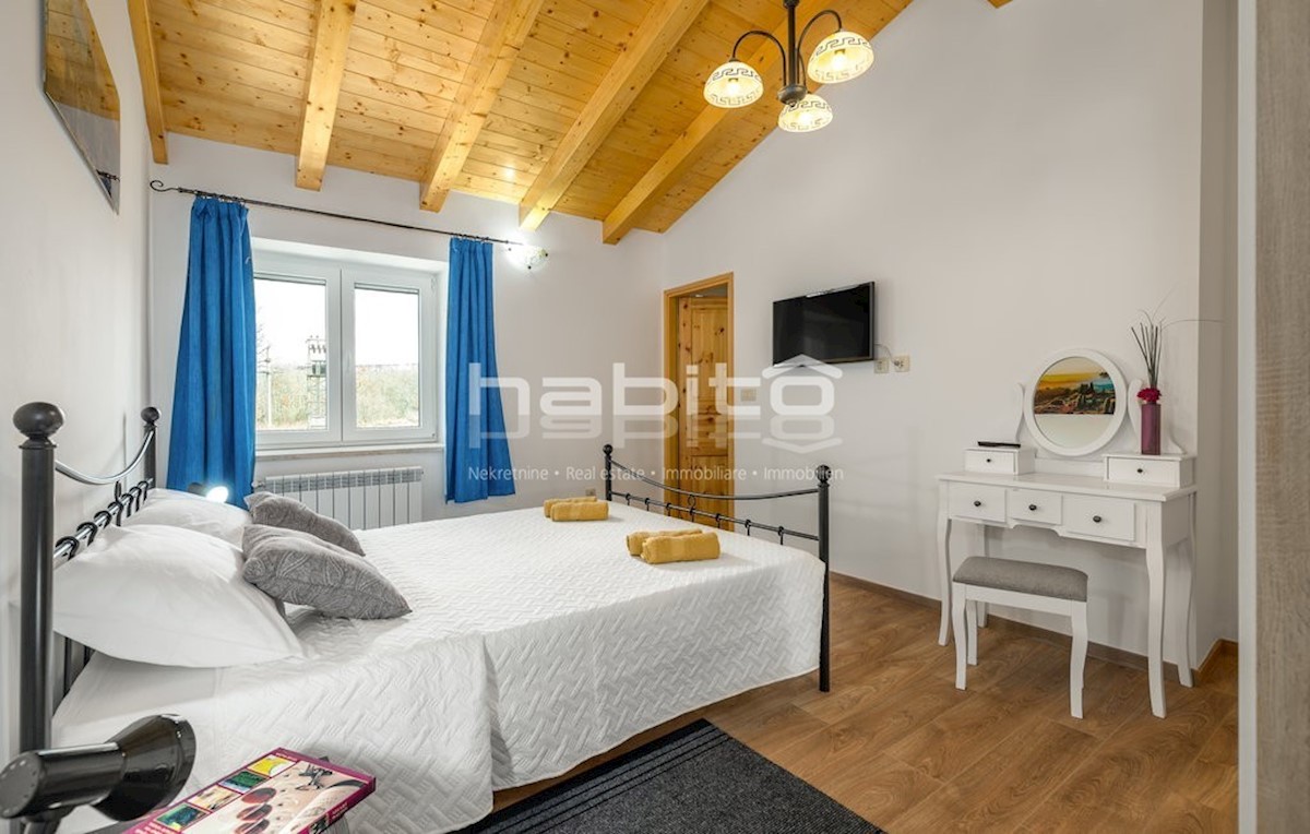 Stone house of approx. 150 m2 with a pool is designed in a modern style while keeping a touch of the original Istrian tradition. On the ground floor there is a living room, a kitchen, a dining room, a storage room and a bedroom with its own bathroom. On t