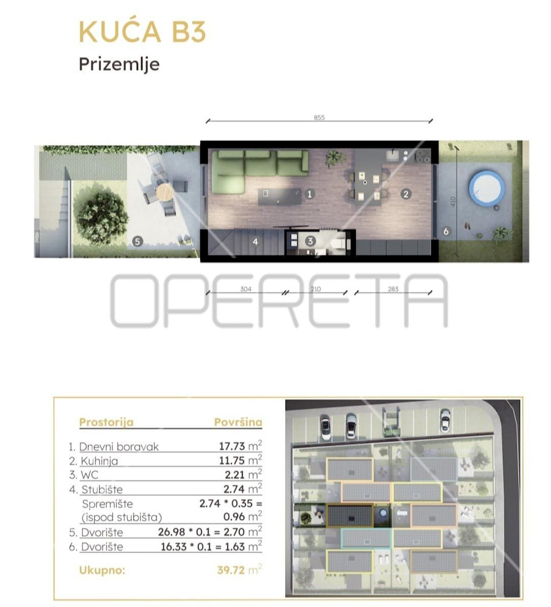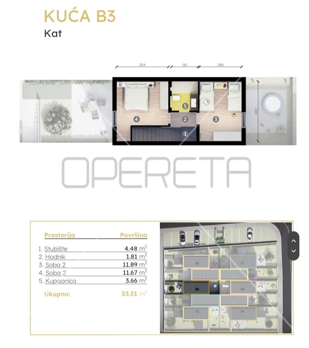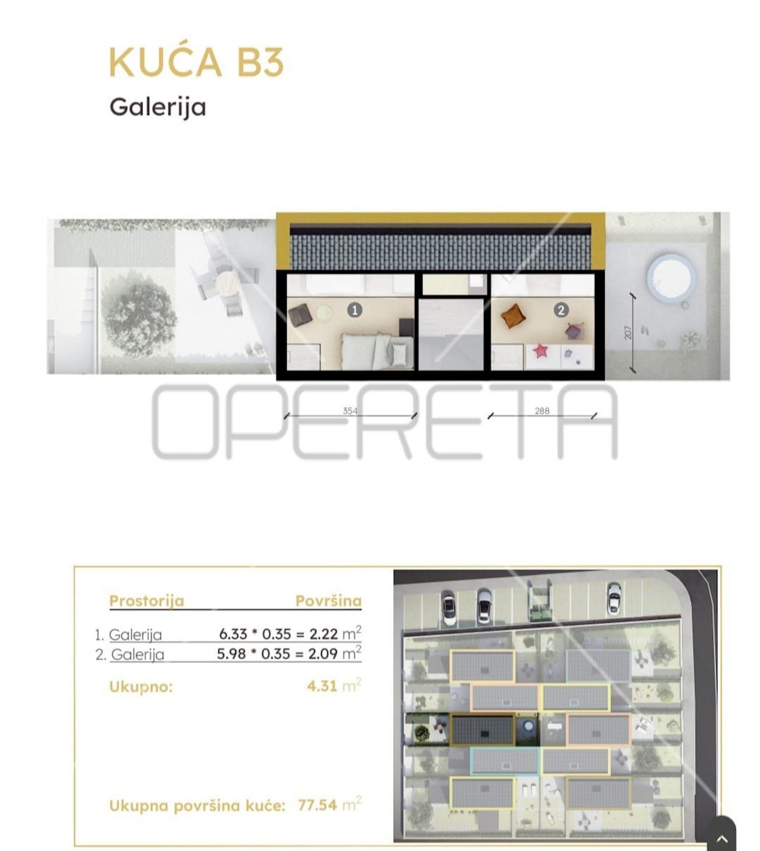 House B3 consists of two floors with a total living area of 77.54m2 spread over two floorsThe ground floor consists of a kitchen, dining room and living room with access to the terrace, while on the upper floor there are 2 bedrooms with a smaller toilet o