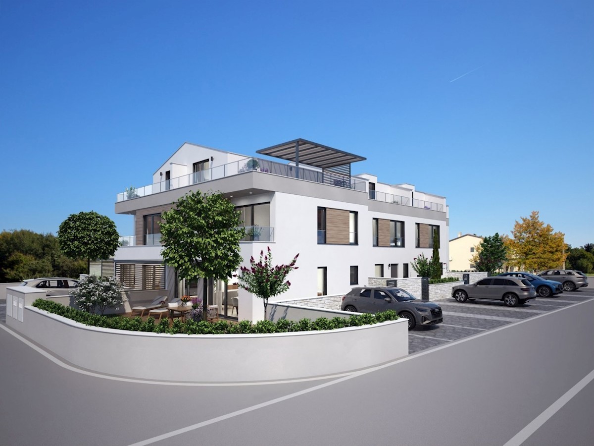 POREČ - only approx. 1000 m from the city and approx. 2000 m from the sea, a modern terraced house for sale on three floors with an area of 124,54 m2 + a yard of approx. 134 m2. Ground floor: living room with kitchen and dining room, toilet, laundry room