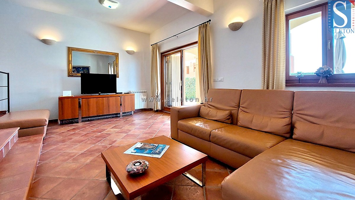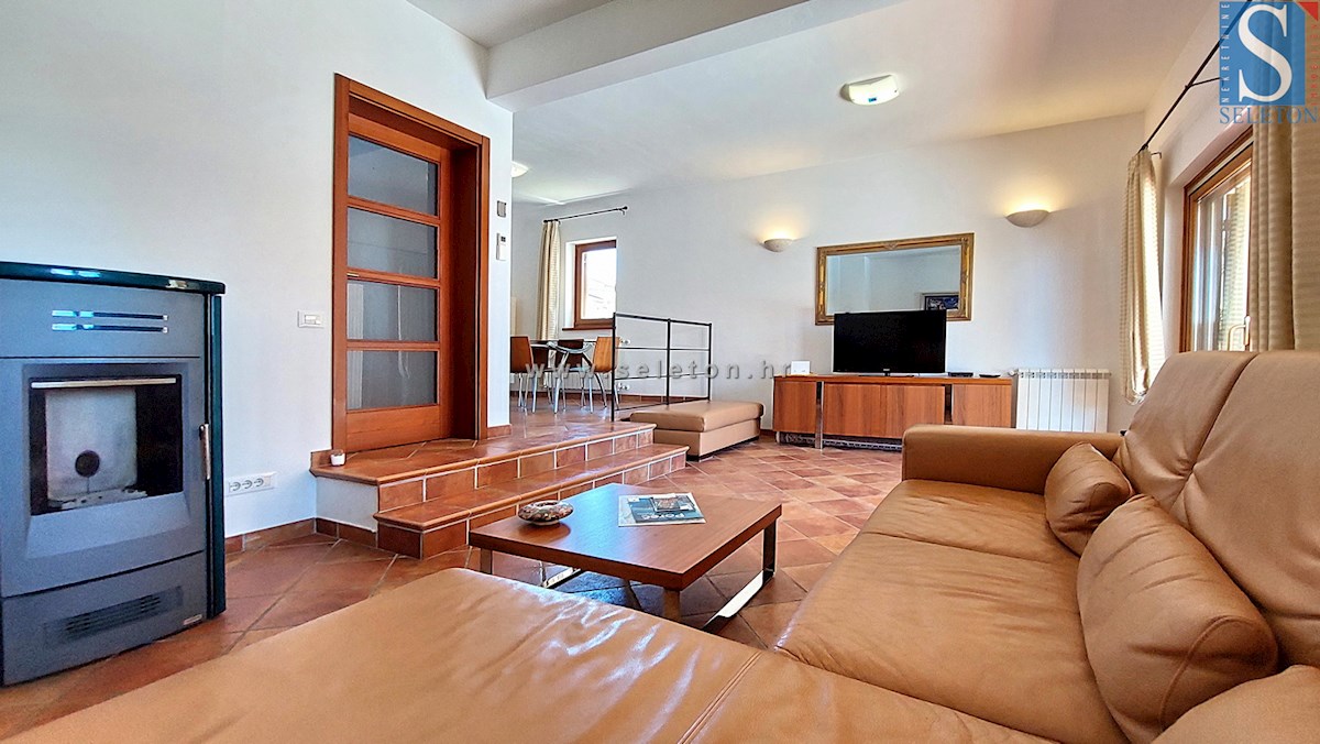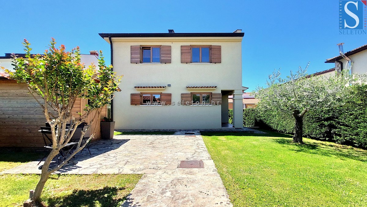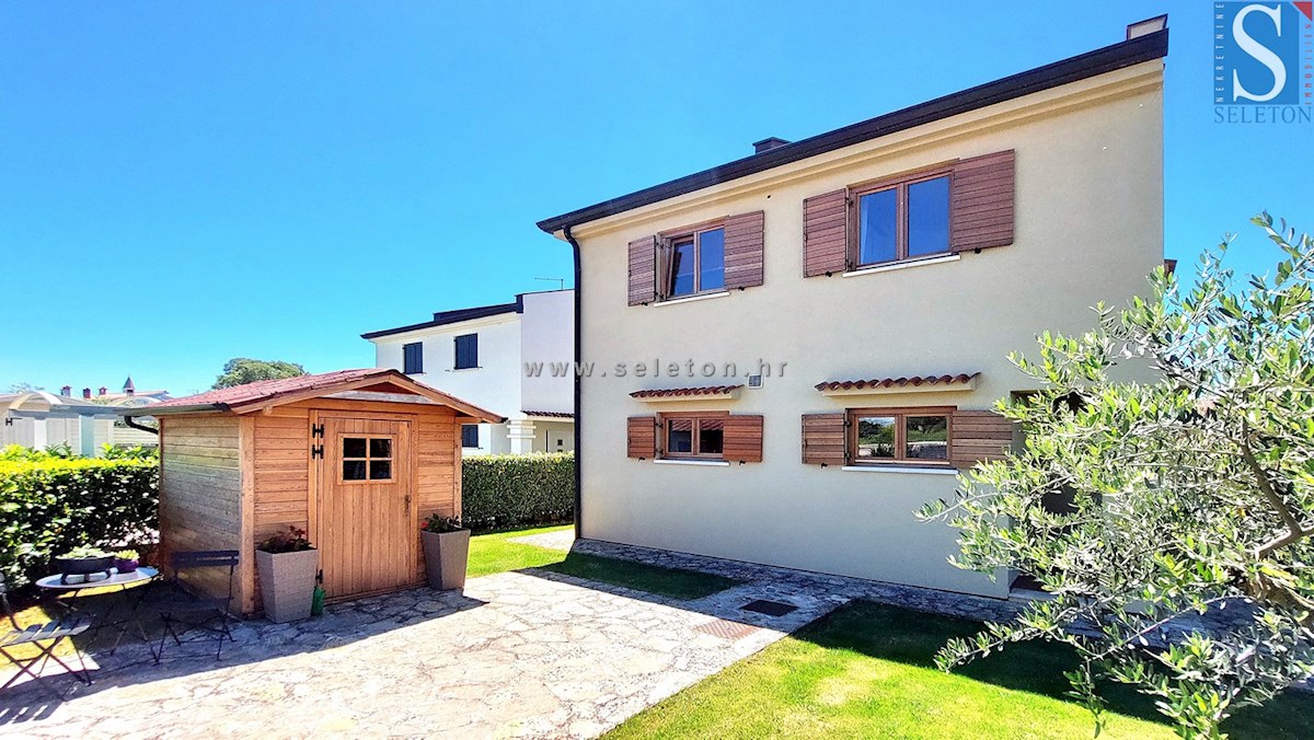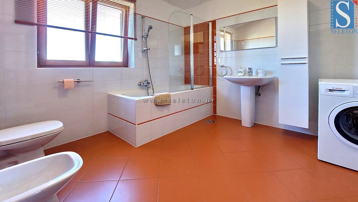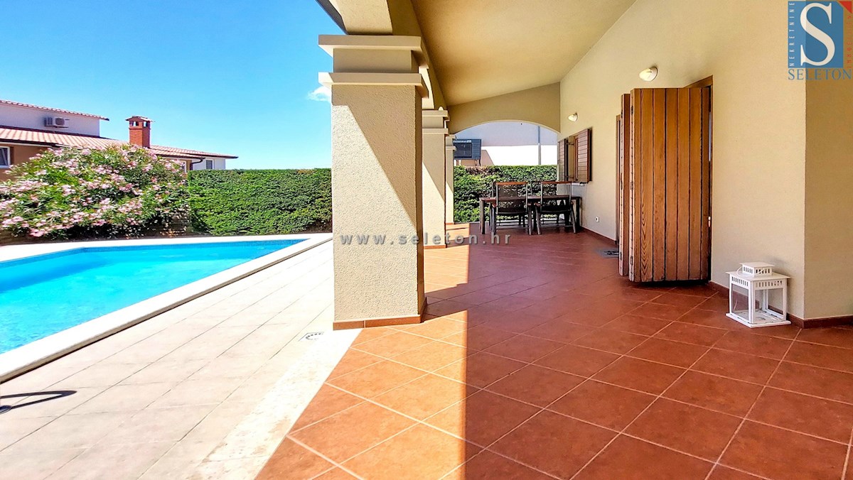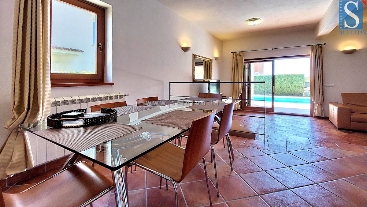A house with an area of 124 m2 is for sale, consisting of a living room, kitchen, dining room, hallway, terrace, 3 bedrooms and two bathrooms. The house is built on a plot of land of 460 m2, has central heating, air conditioning, swimming pool, automatic