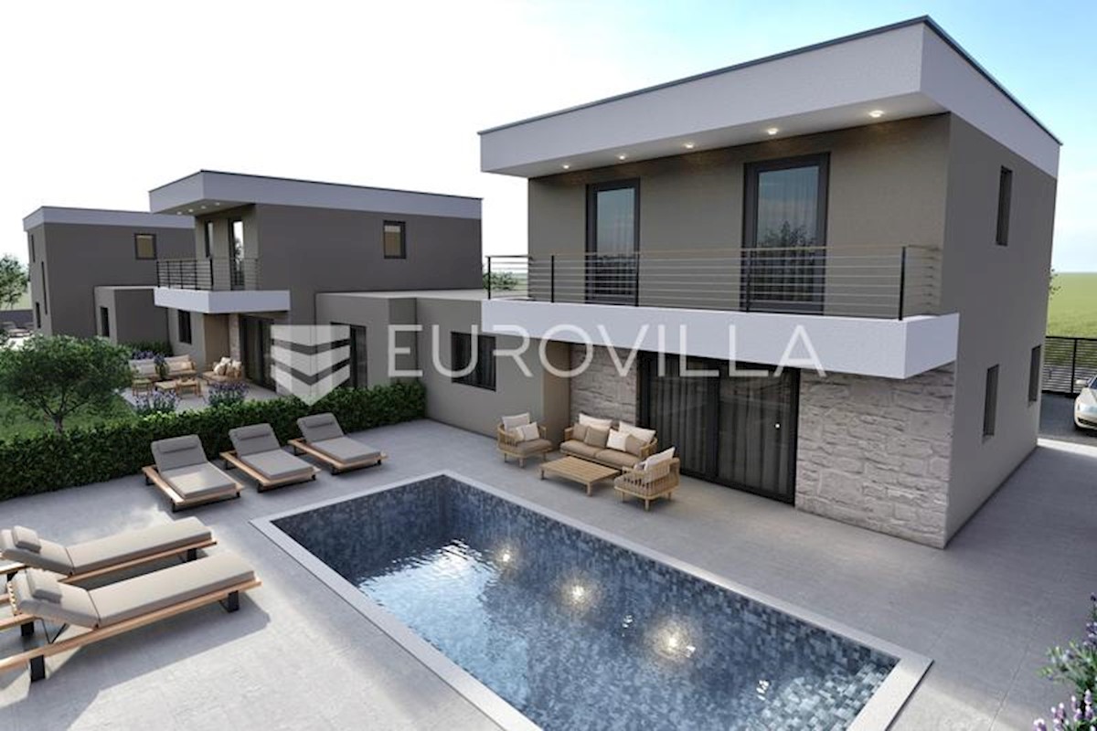 Only 7 km from Poreč is this beautiful terraced house. The house on the ground floor consists of a storage room, a hallway, an open living room, a dining room, a kitchen with access to the sun deck and pool, a guest toilet, a bedroom with its own bathroom