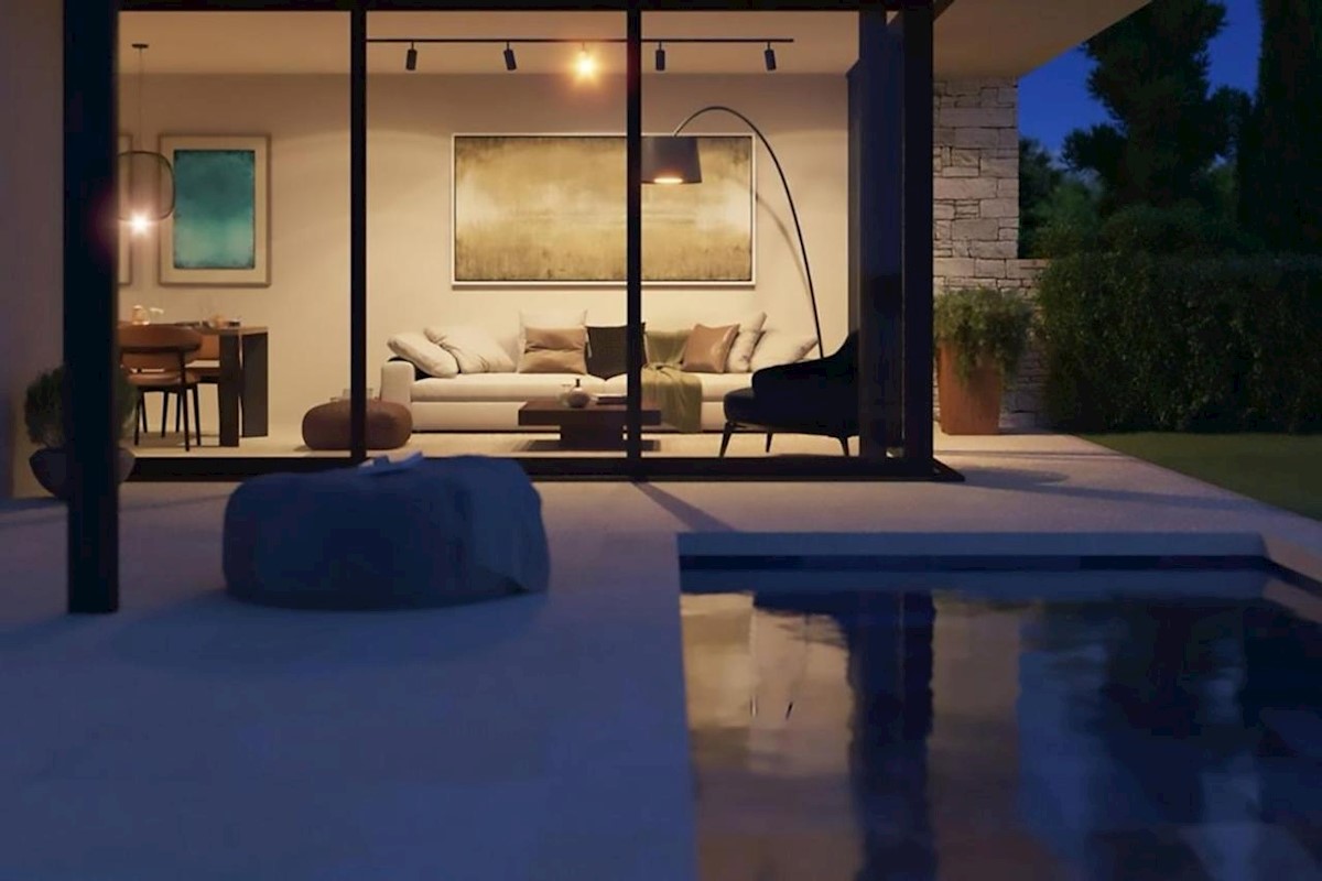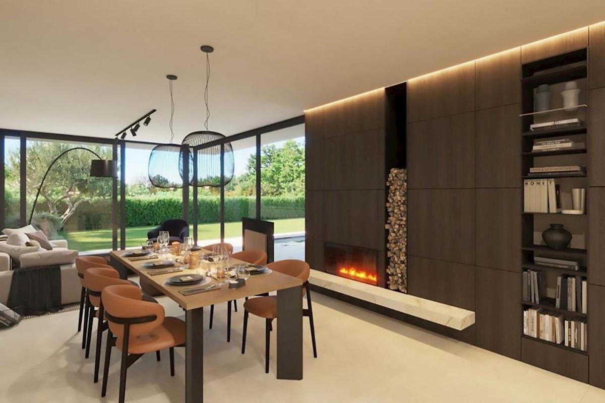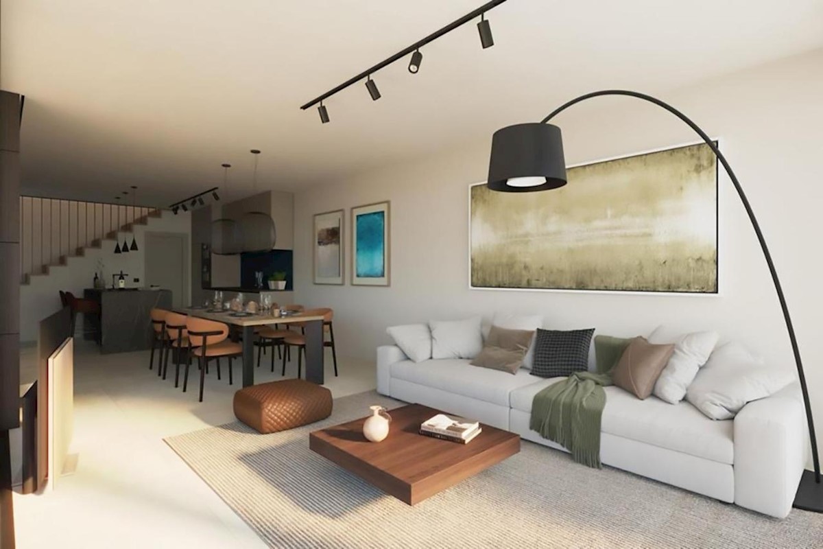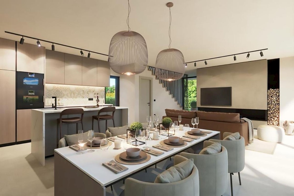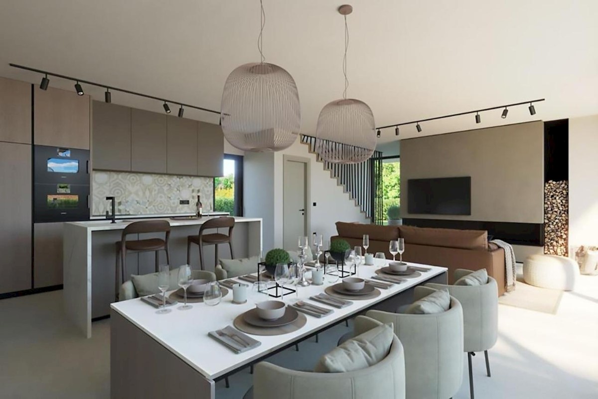 This modern semi-detached villa is for sale near the town of Poreč. The villa has a total net living area of 110 m2, which extends through the ground floor and first floor. The ground floor of the villa consists of an open space that includes the livin
