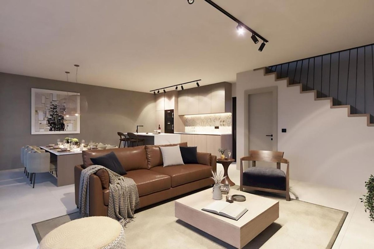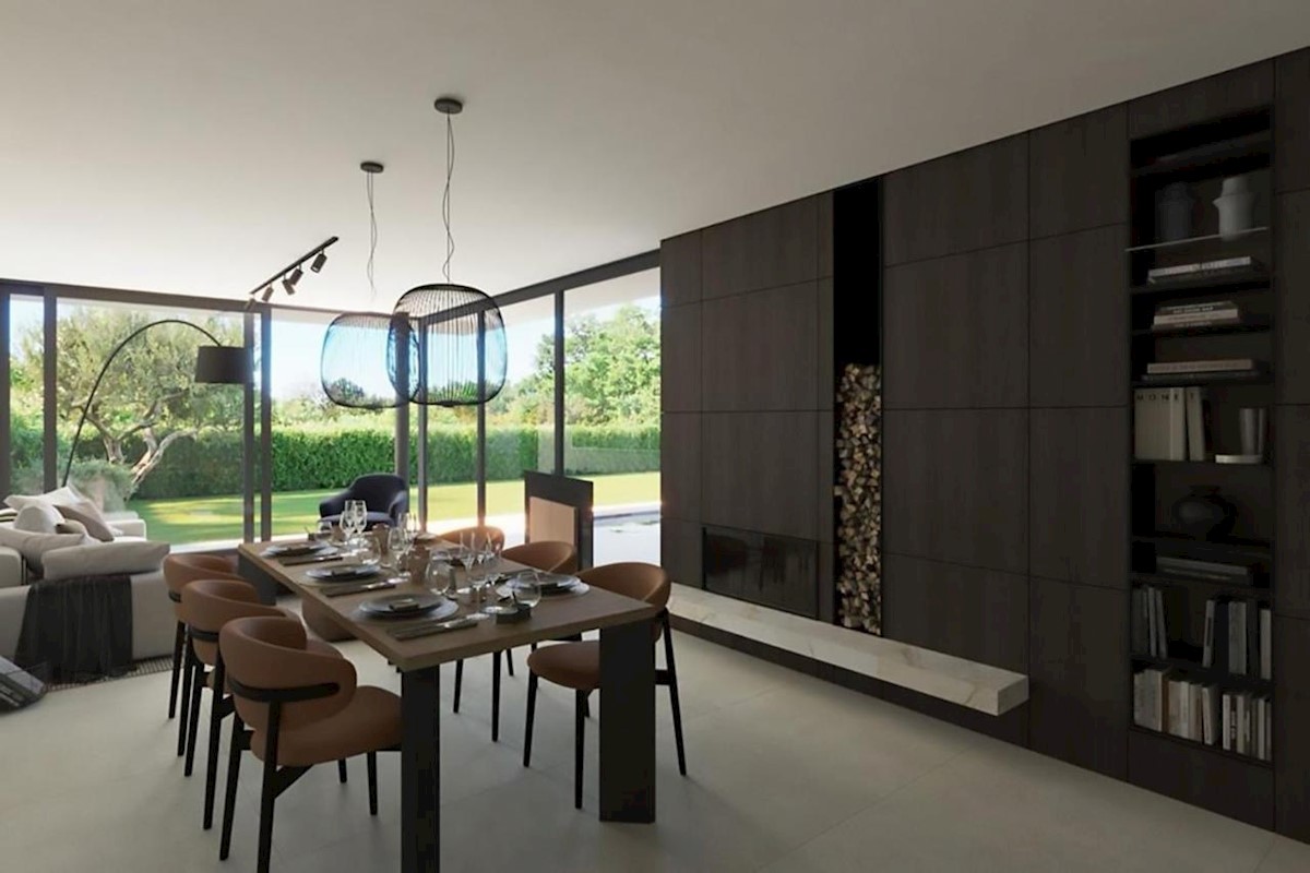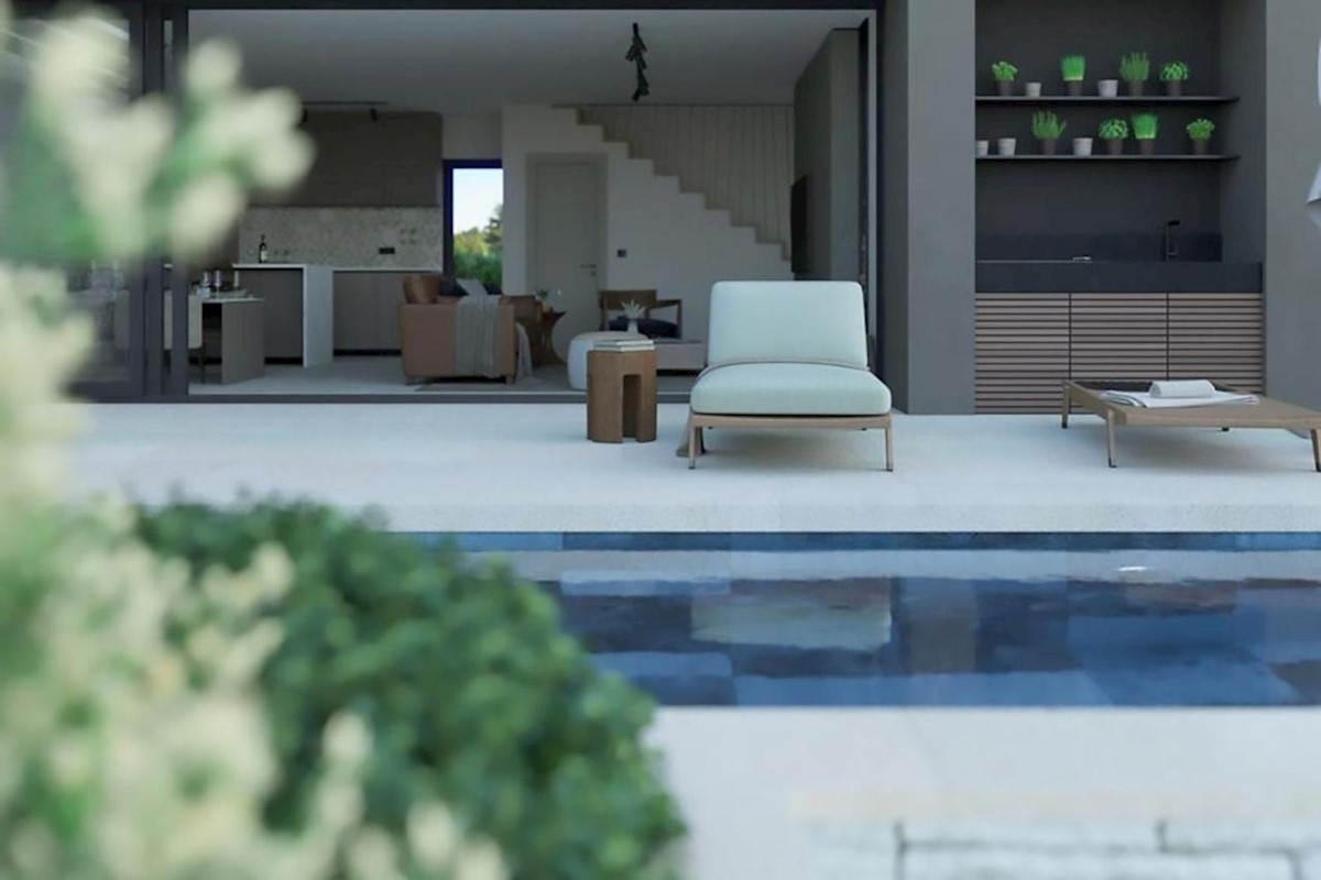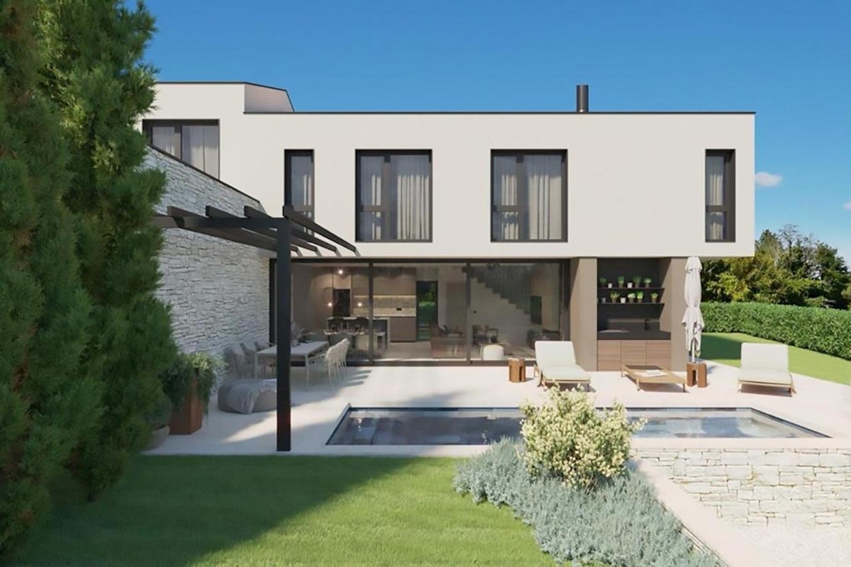 This modern semi-detached villa is for sale near the town of Poreč. The villa has a total net living area of 110 m2, which extends through the ground floor and first floor. The ground floor of the villa consists of an open space that includes the livin