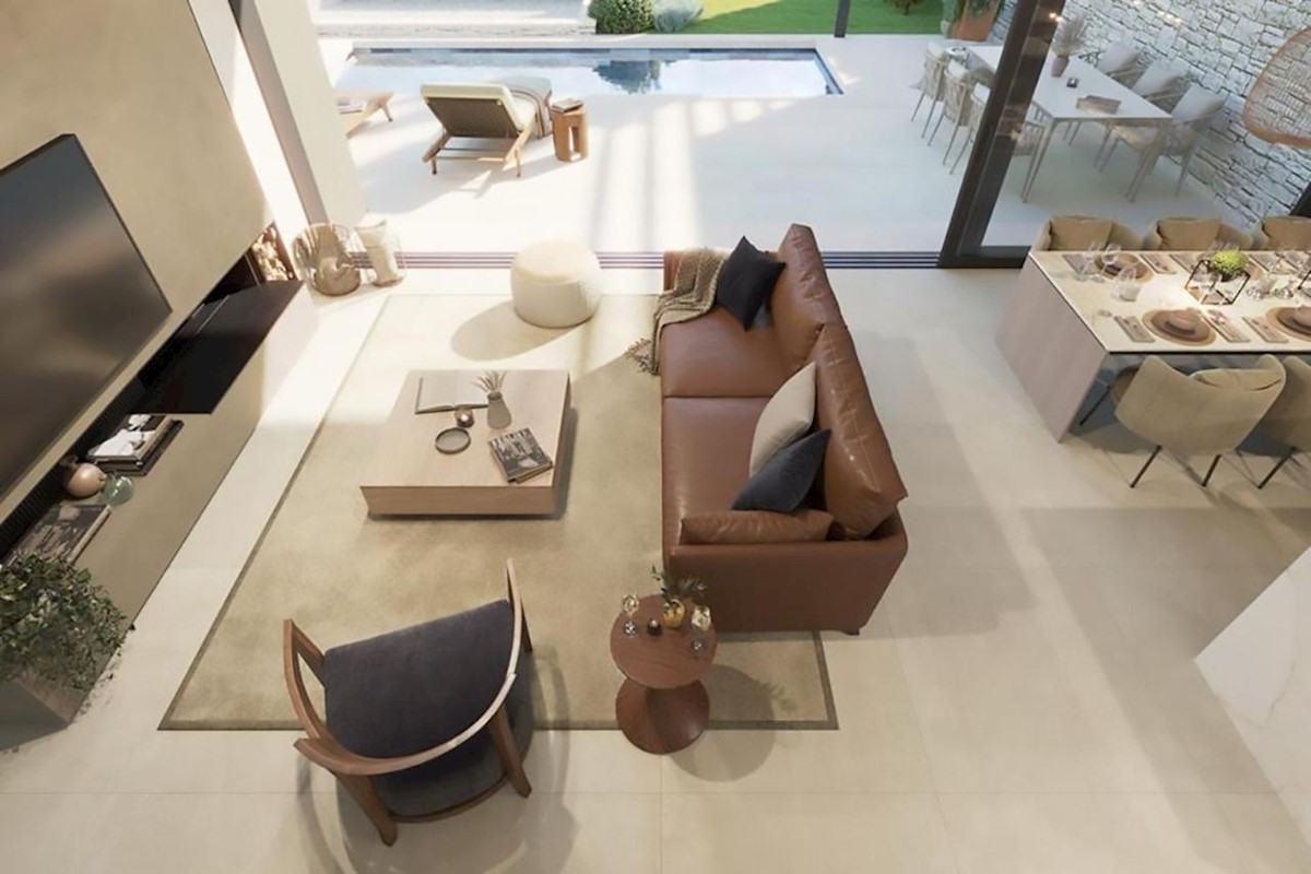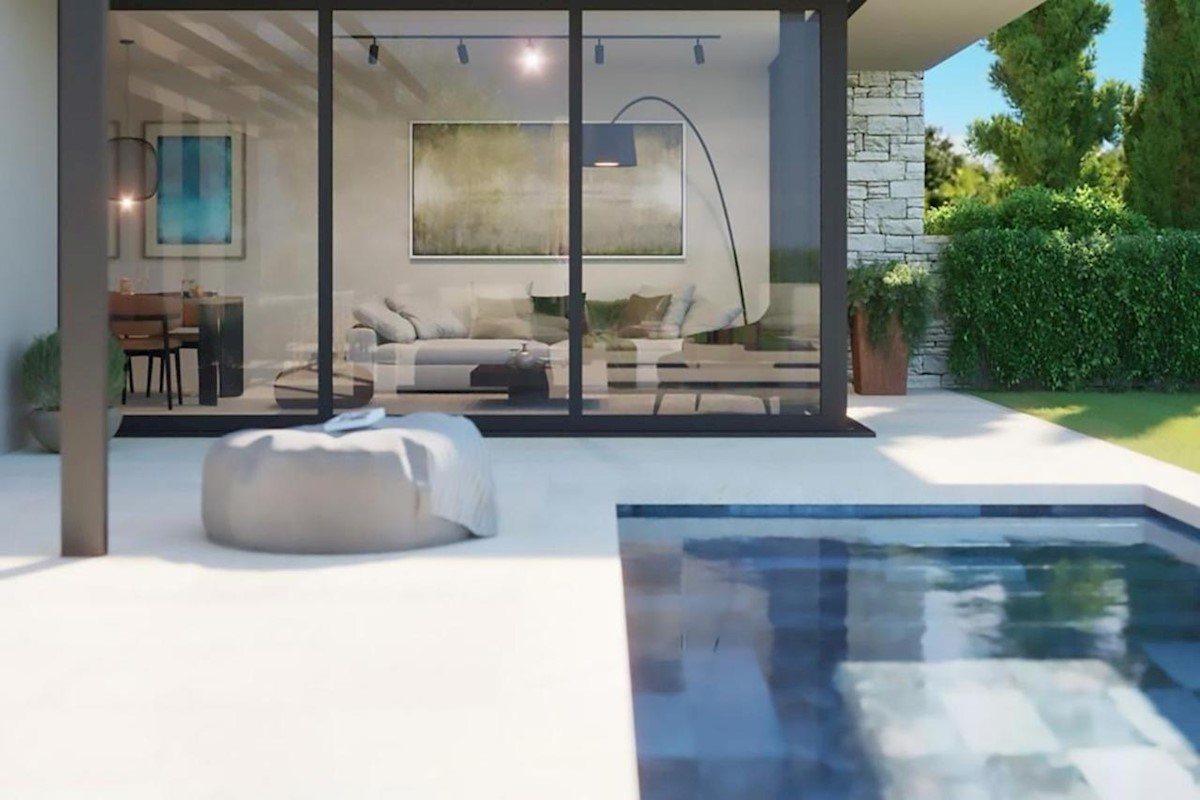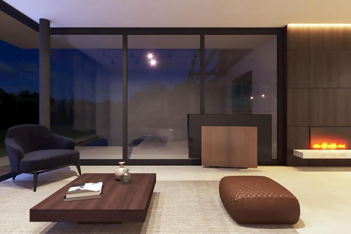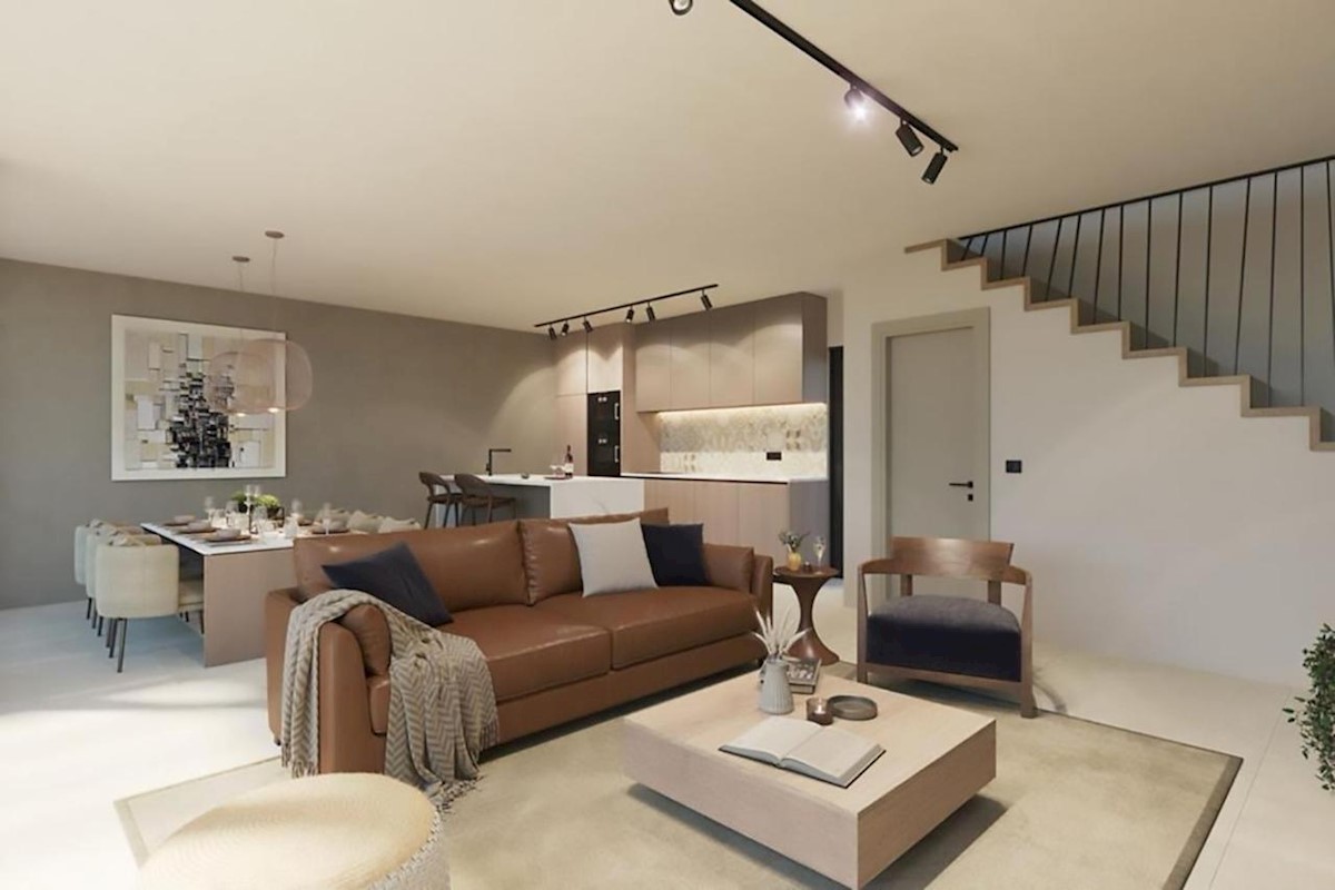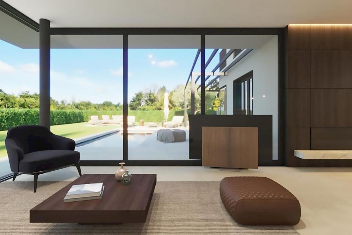 This modern semi-detached villa is for sale near the town of Poreč. The villa has a total net living area of 110 m2, which extends through the ground floor and first floor. The ground floor of the villa consists of an open space that includes the livin
