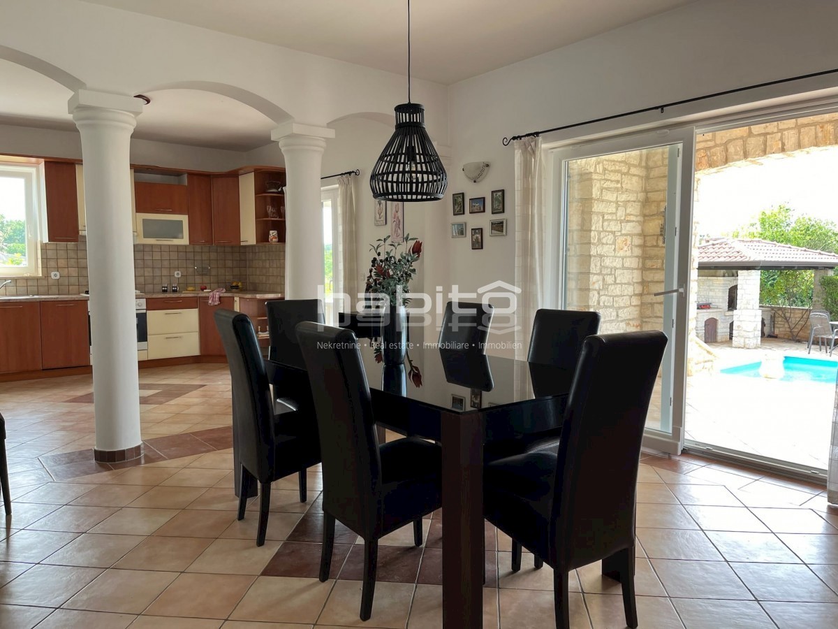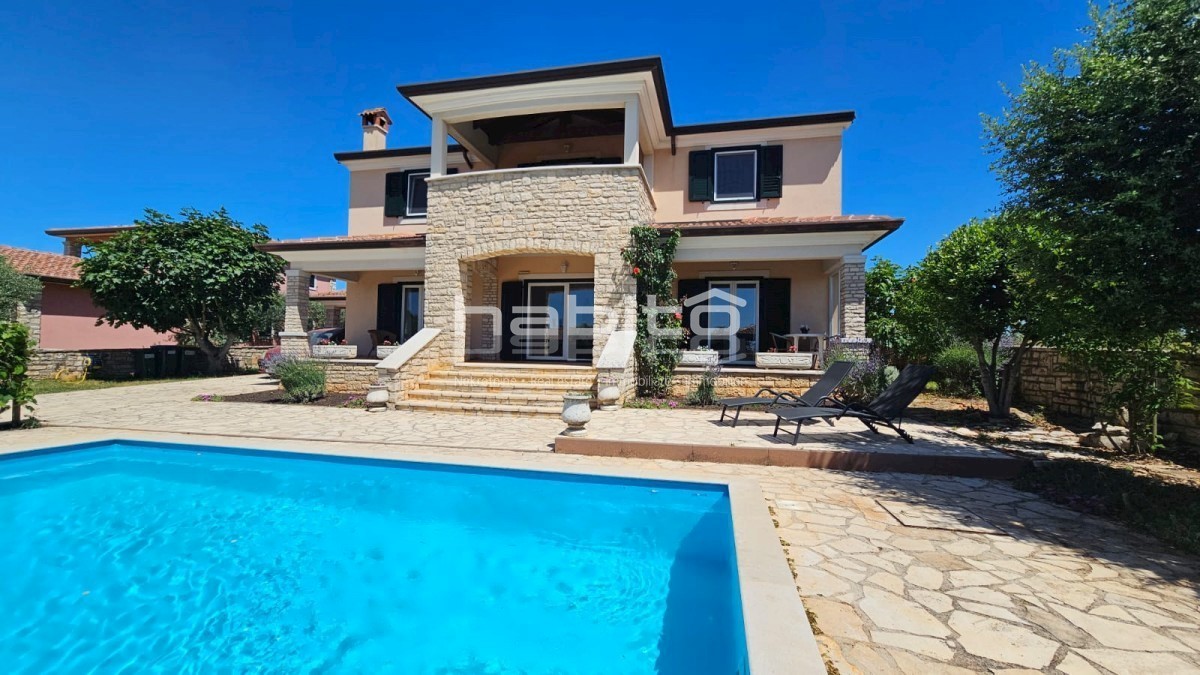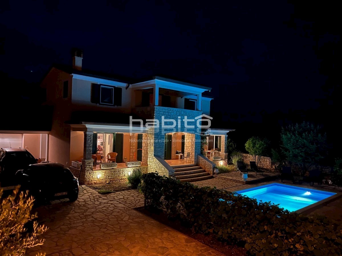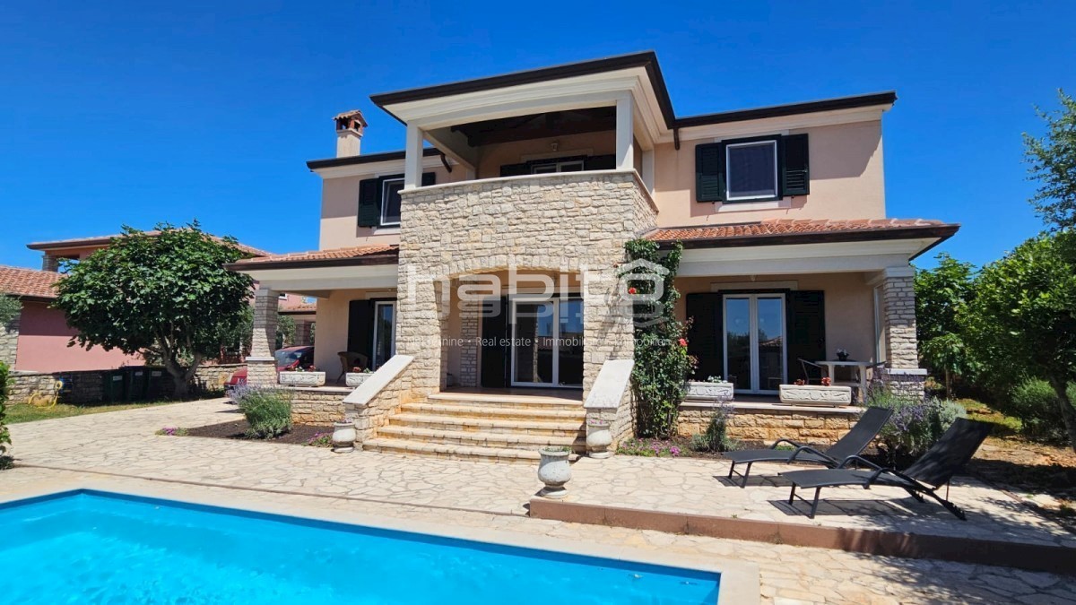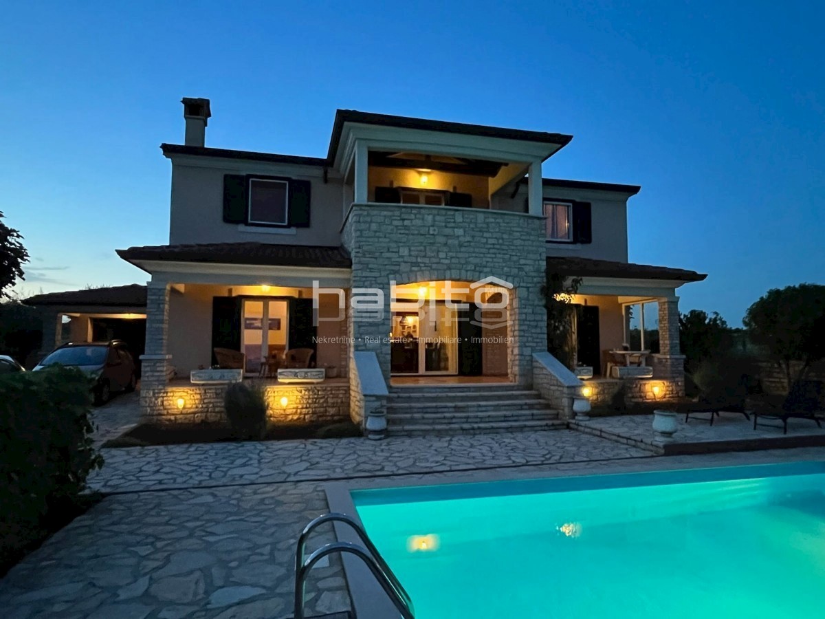 Elegant Mediterranean villa located in a peaceful setting in a small Istrian village, 5 km from the sea. This spacious 208 m² house is spread over two floors and offers everything you need for a comfortable life. A private pool surrounded by a Mediterrane
