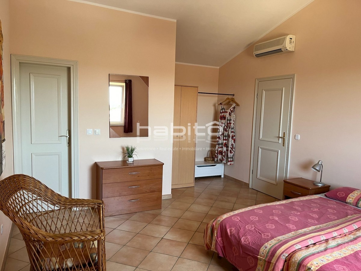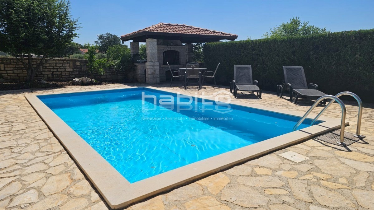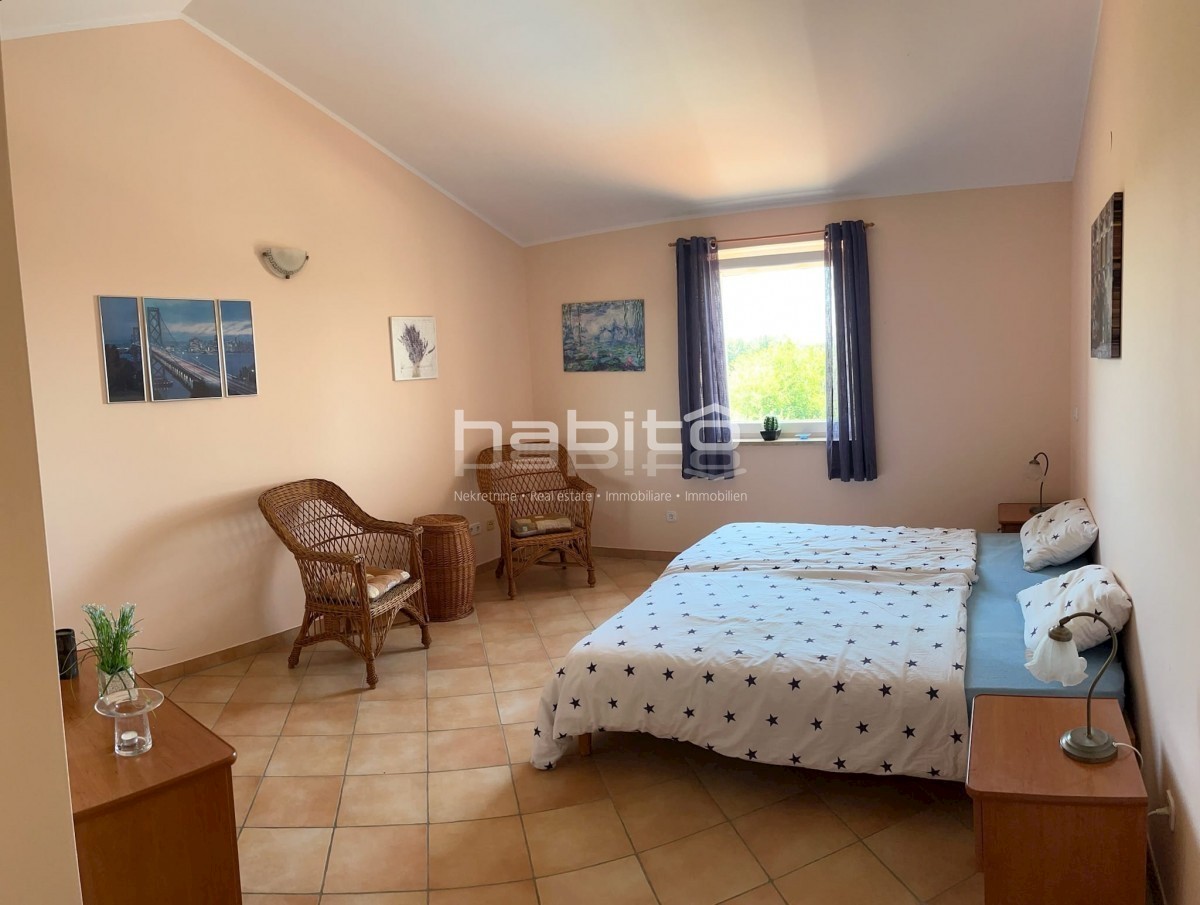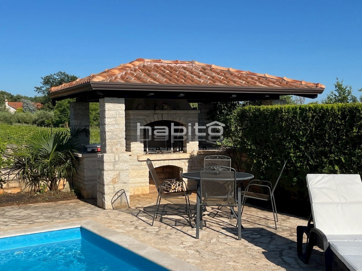 Elegant Mediterranean villa located in a peaceful setting in a small Istrian village, 5 km from the sea. This spacious 208 m² house is spread over two floors and offers everything you need for a comfortable life. A private pool surrounded by a Mediterrane