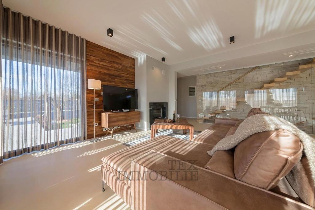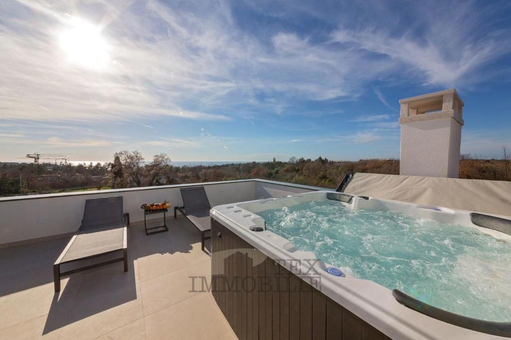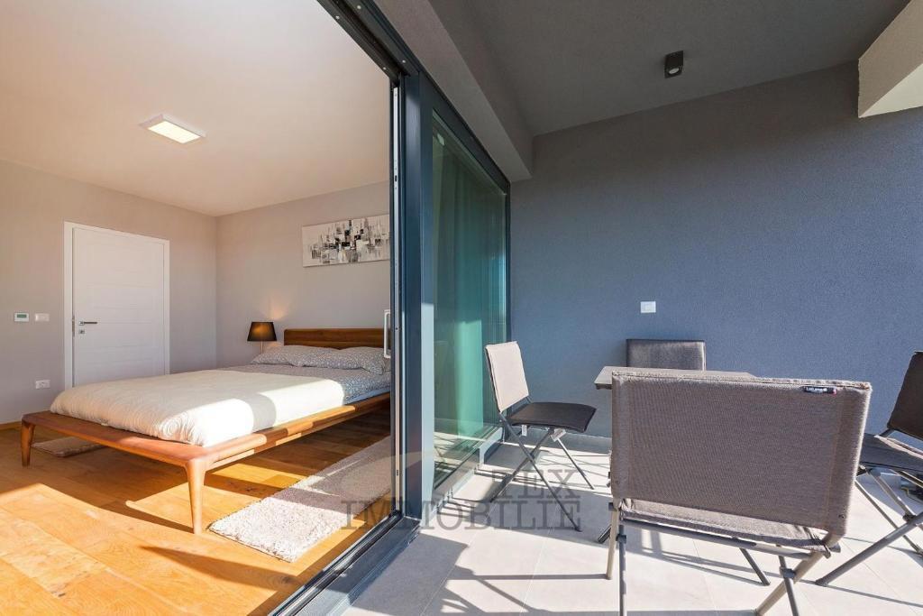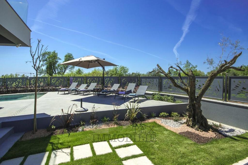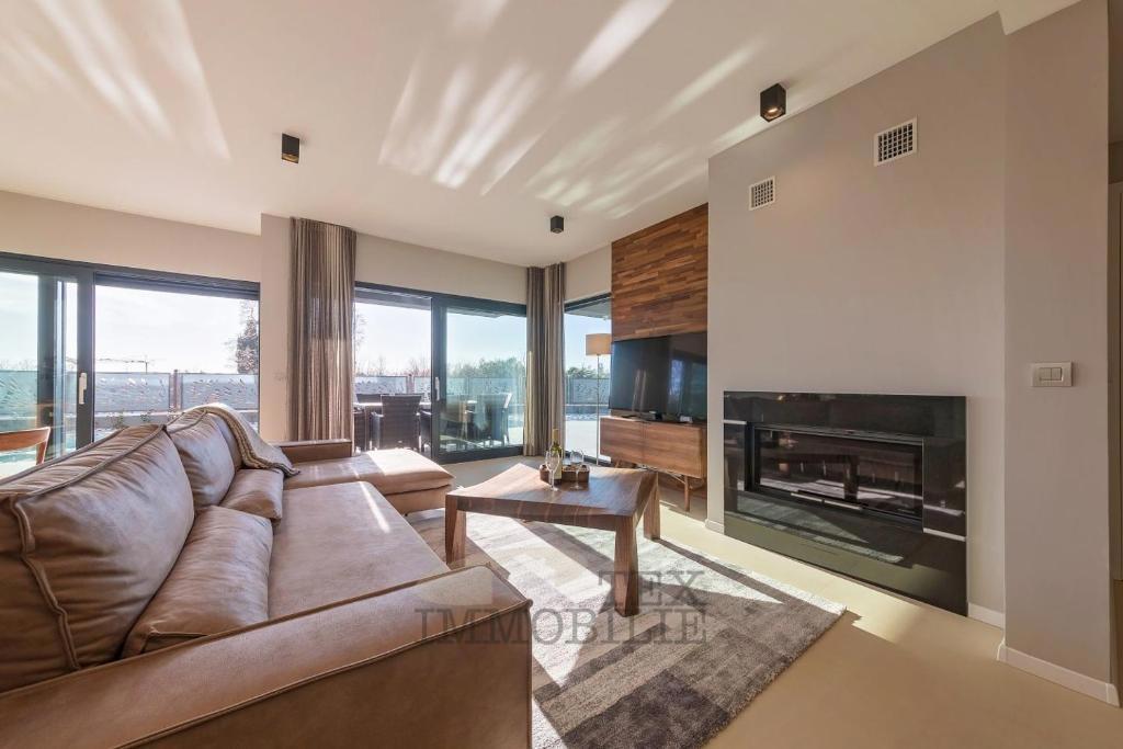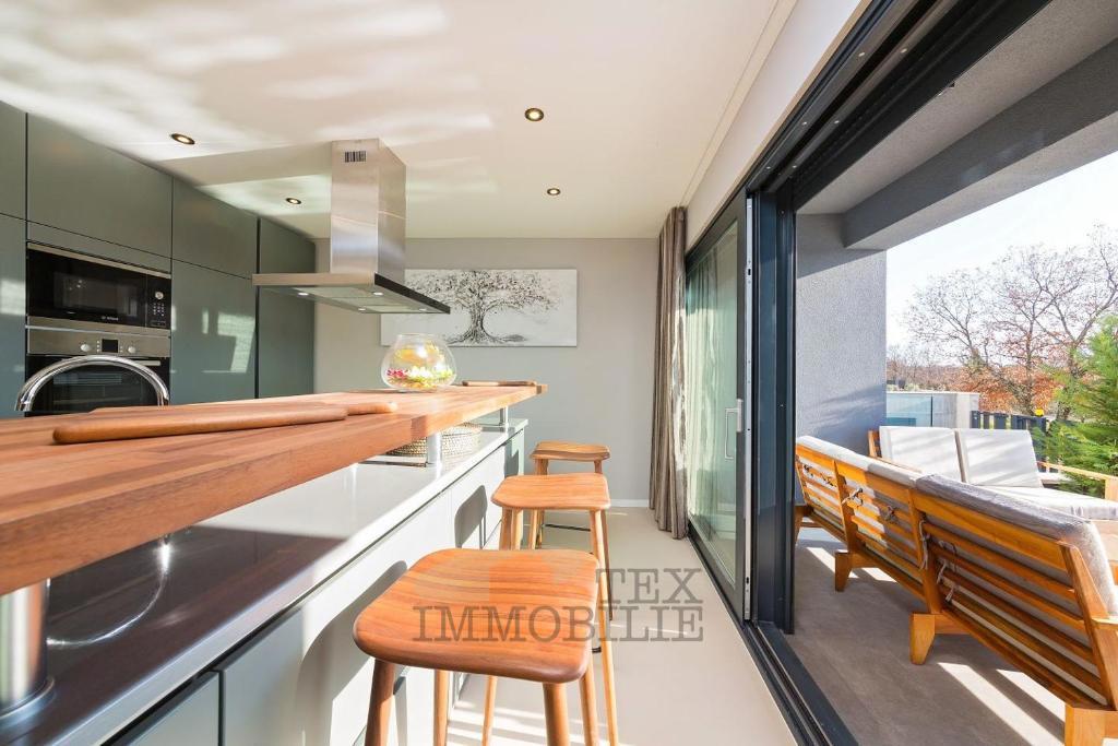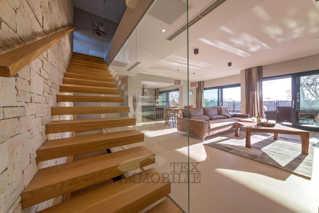 For sale is a modern house located just 500 meters from the sea and 1.4 km from the city center of Poreč. The ground floor features an open space living room with a kitchen equipped with top-quality designer furniture, offering views of the outdoor terrac