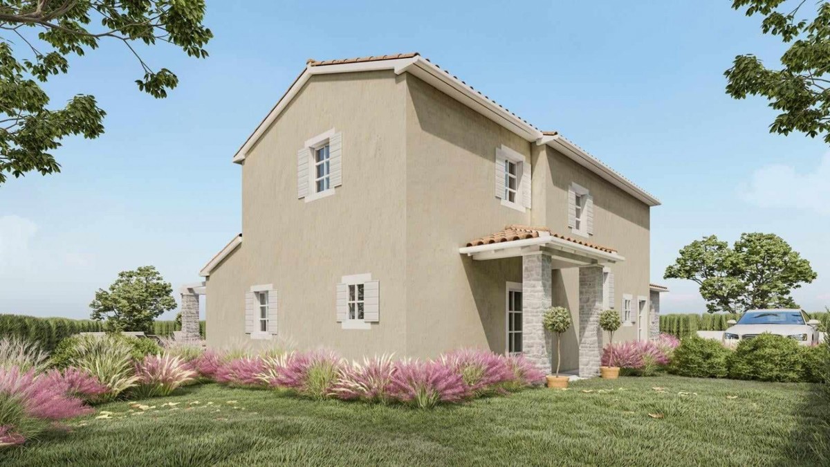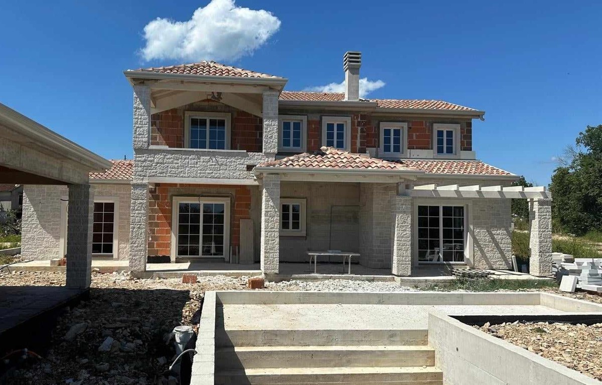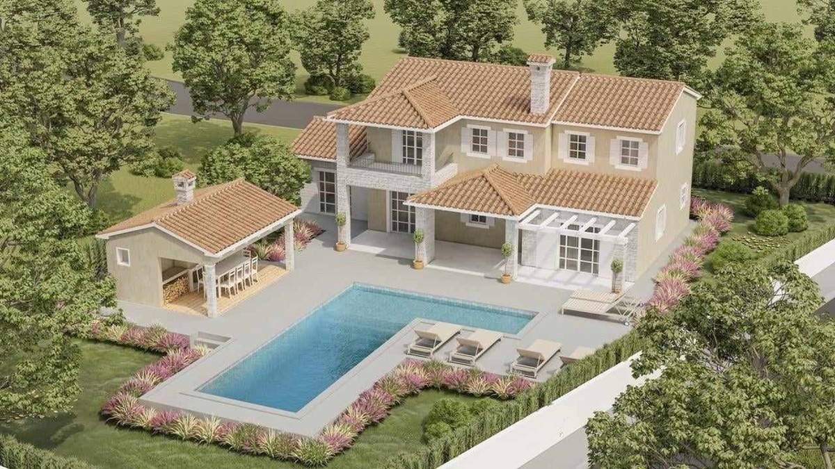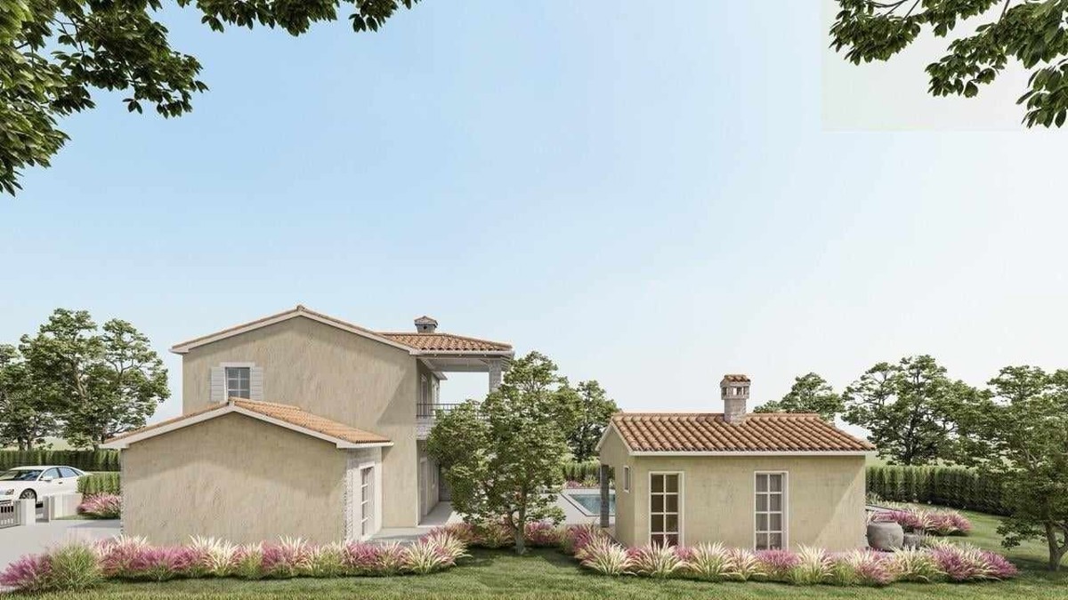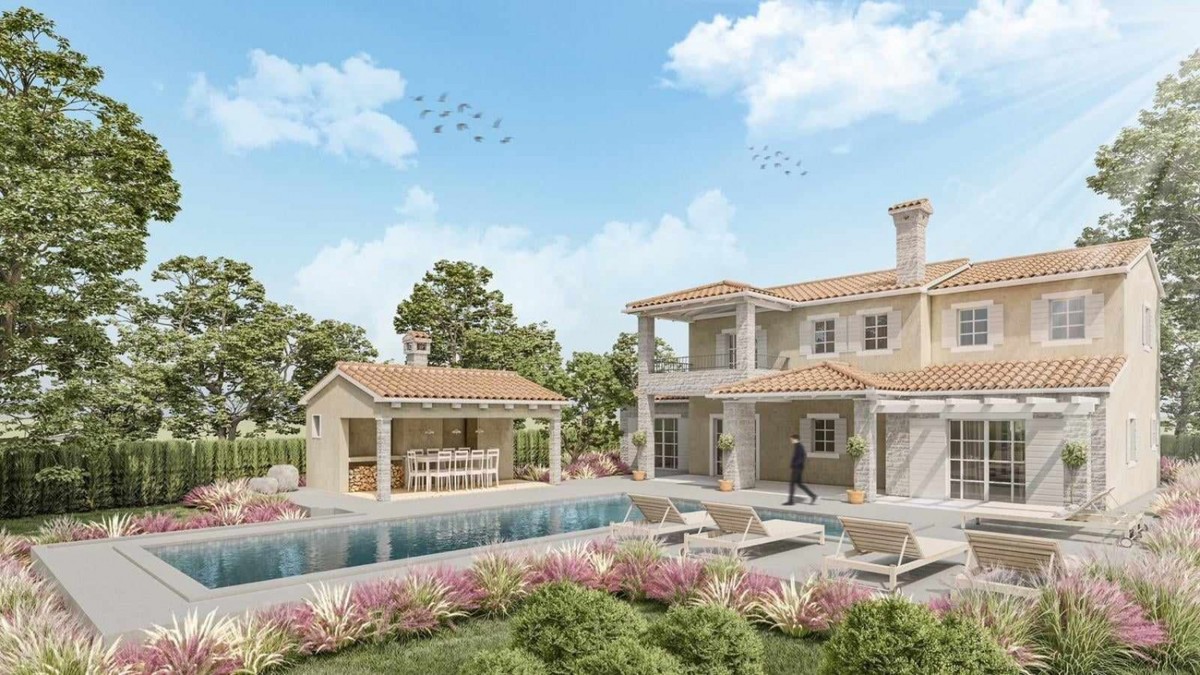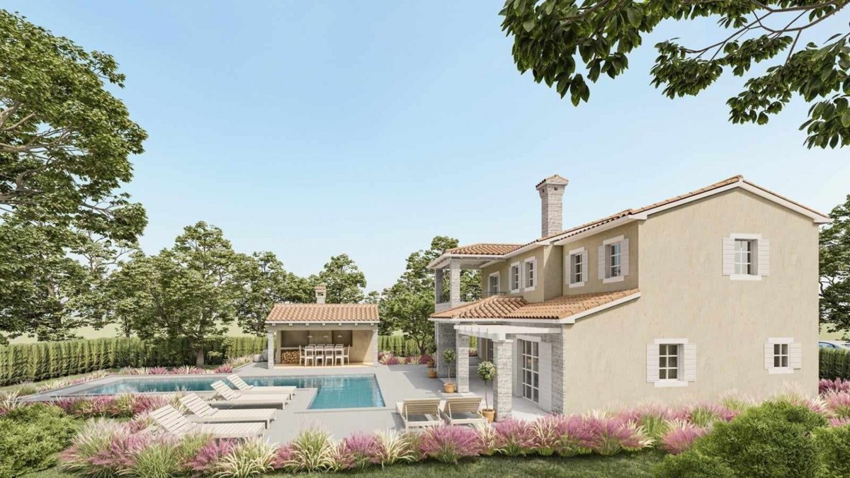 Istria, luxury villa with sea view, in a quiet location, approx. 17 km from the sea - The villa has a large living room with a kitchen, four bedrooms, four bathrooms, two toilets, a large balcony, two covered terraces, a terrace with a pergola - spacious