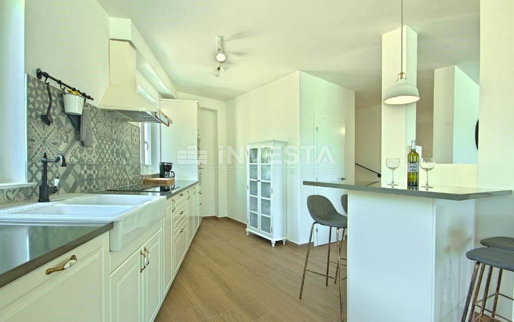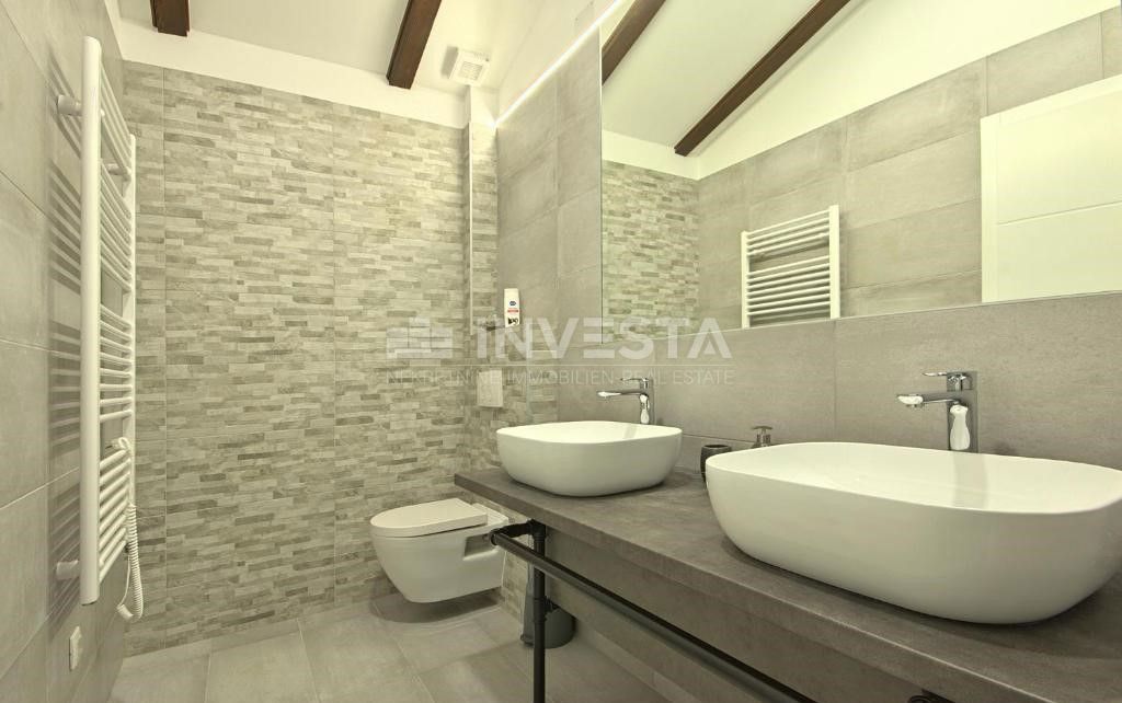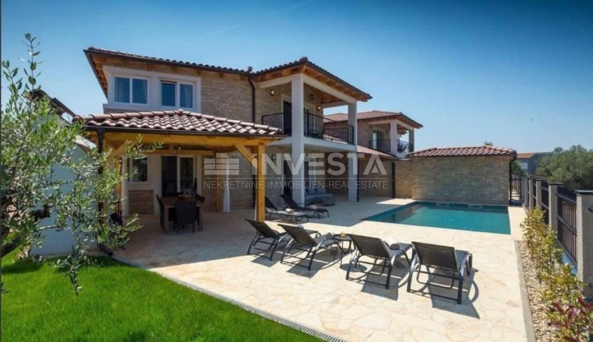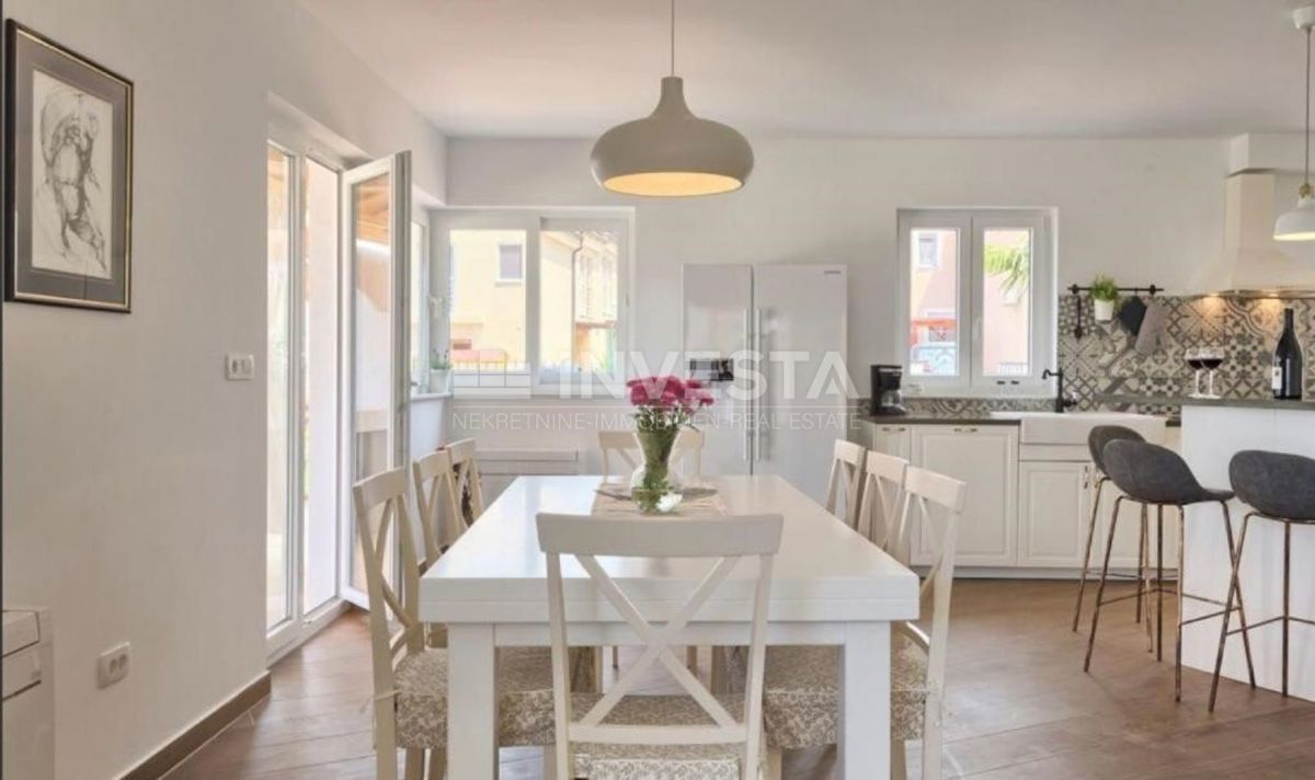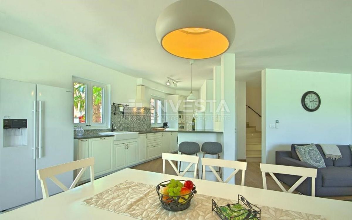 In close proximity to Poreč, in a peaceful neighborhood, there is a beautiful semi-detached house with a swimming pool, covering an area of 186 m² on a plot of 300 m². The house extends over two floors: ground floor and first floor. On the ground floor,