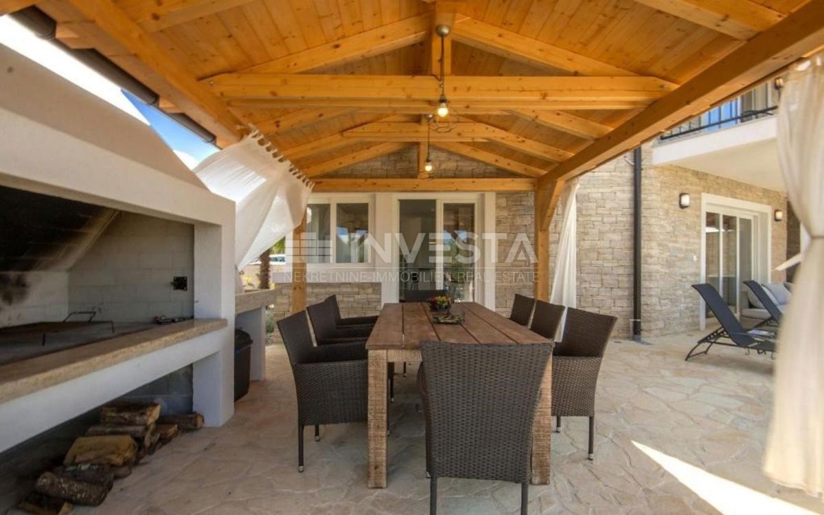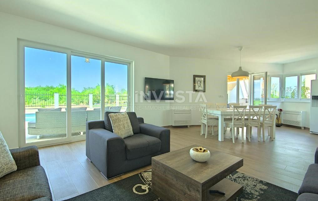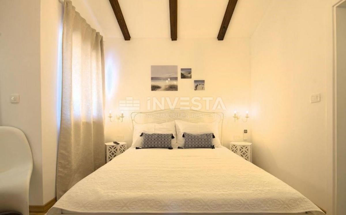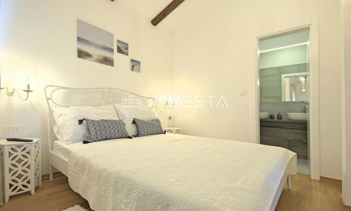 In close proximity to Poreč, in a peaceful neighborhood, there is a beautiful semi-detached house with a swimming pool, covering an area of 186 m² on a plot of 300 m². The house extends over two floors: ground floor and first floor. On the ground floor,