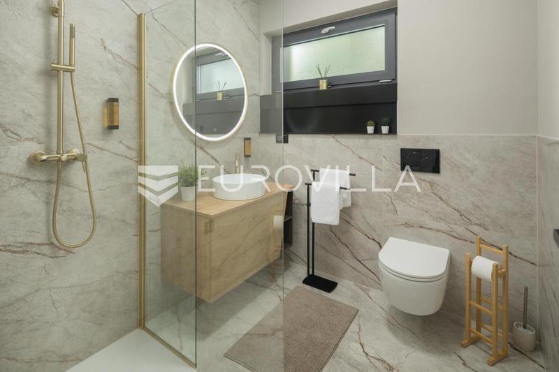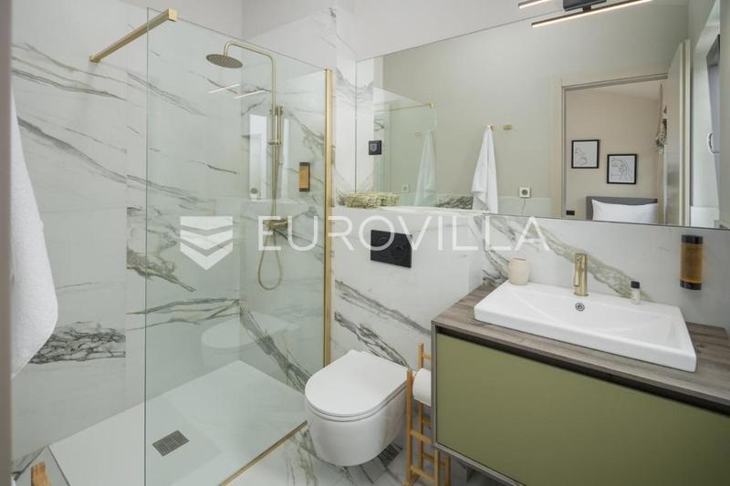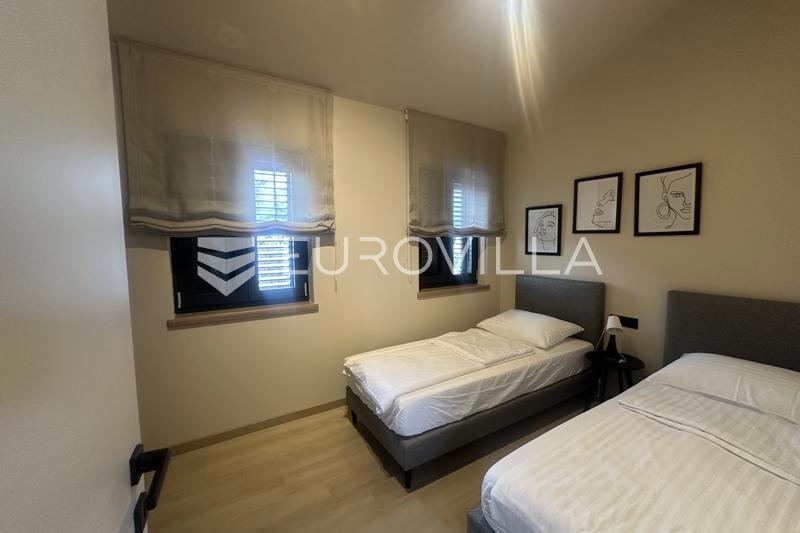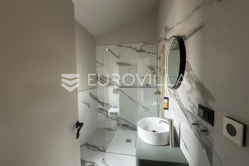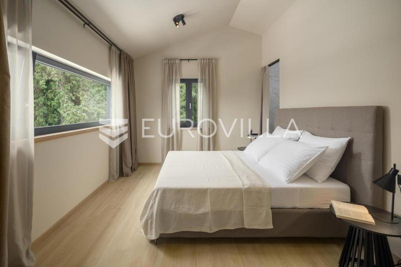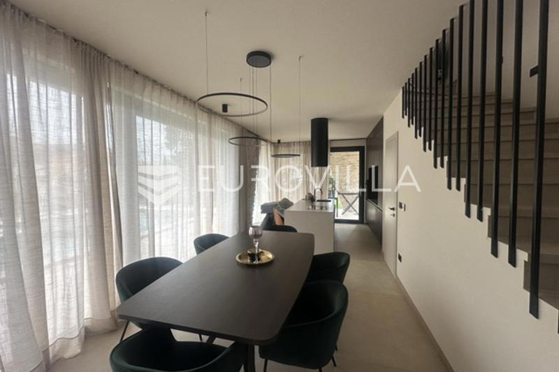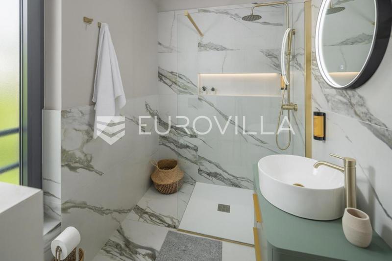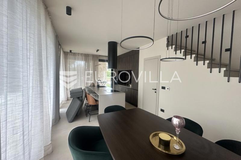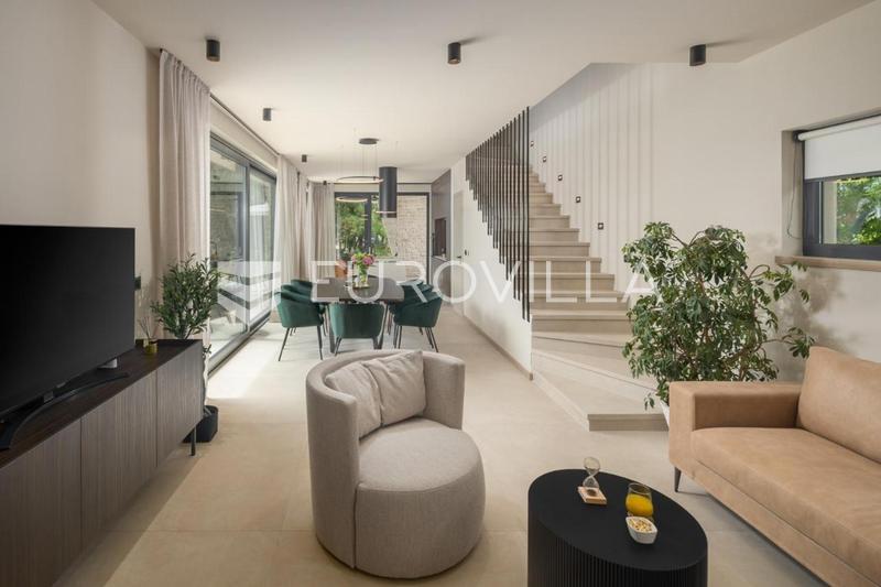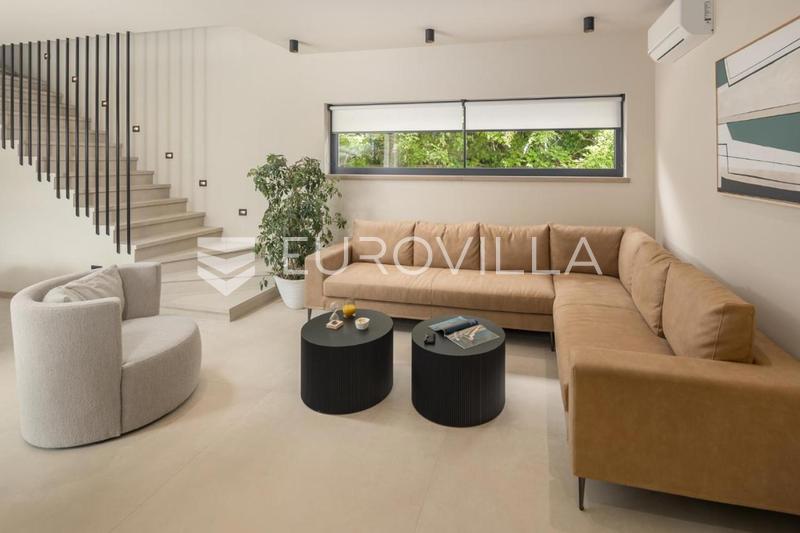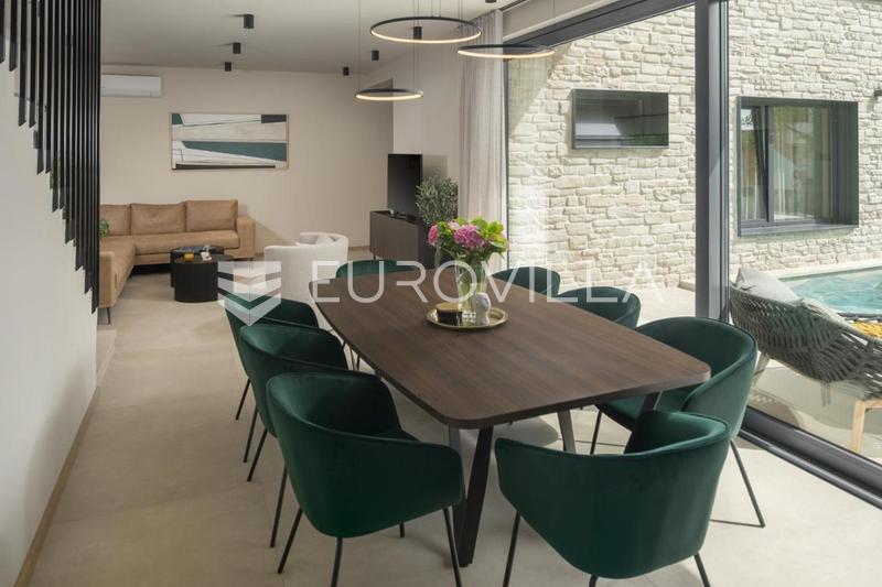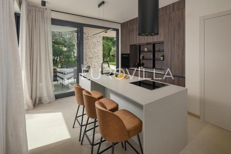 This elegant NKP 190 m2 villa is located in the immediate vicinity of Poreč, surrounded by beautiful and well-kept villas, on a green and meticulously landscaped garden of 550 m2. On the ground floor of the villa there is a large bright living room and ki