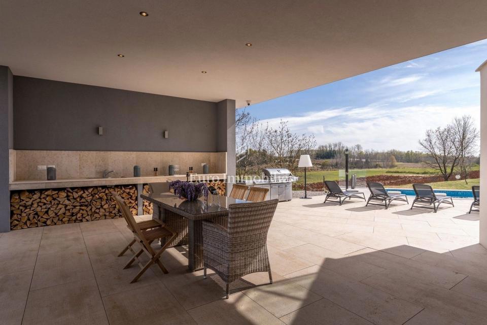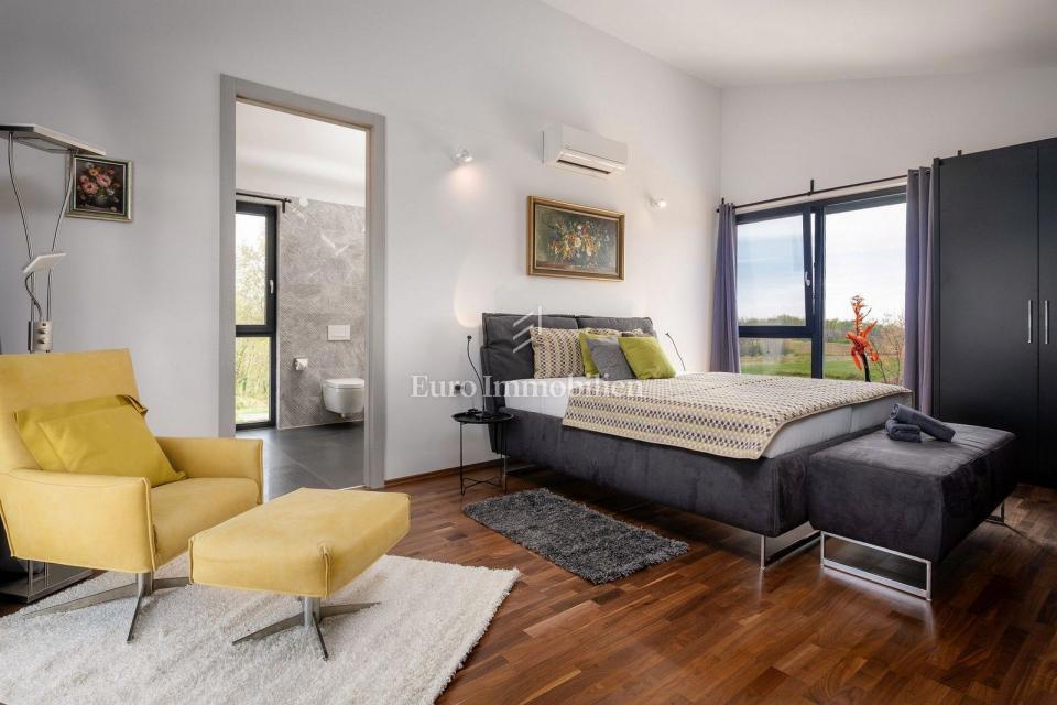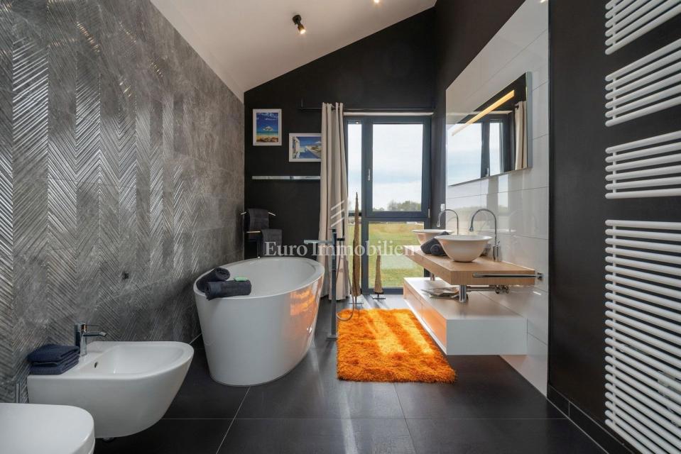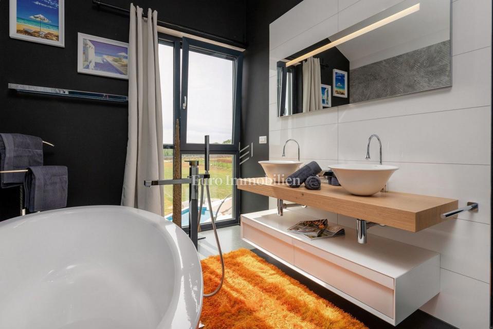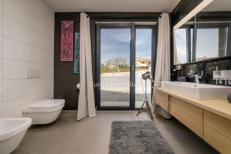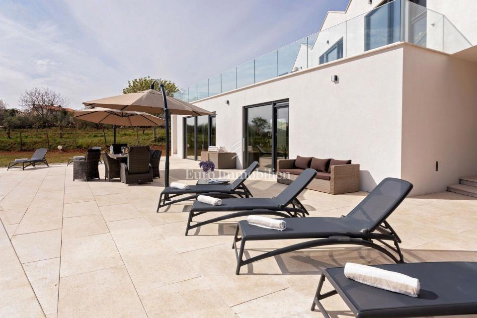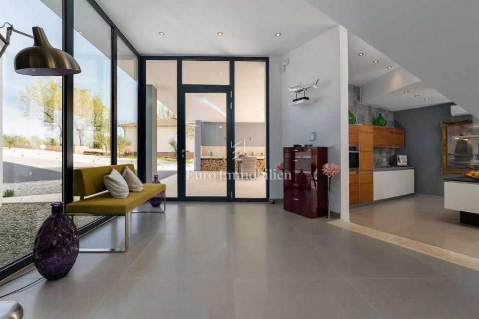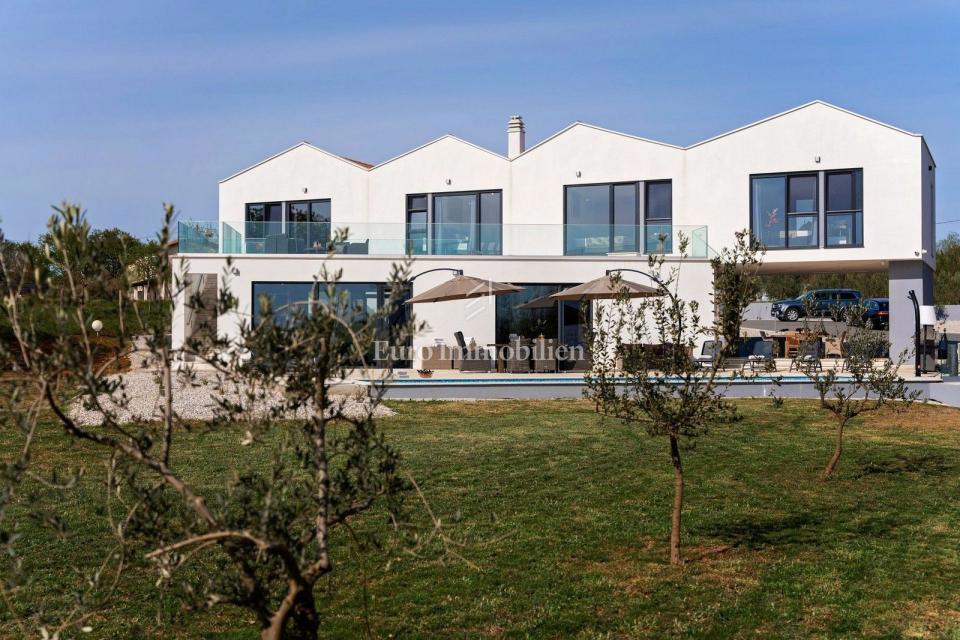 This unique villa in its appearance and architecture is located in the wider vicinity of Poreč (distance approx. 18 km), on the edge of a small Istrian village (conveniences such as discount shops, schools, churches, restaurants are 4 km away). It was bui