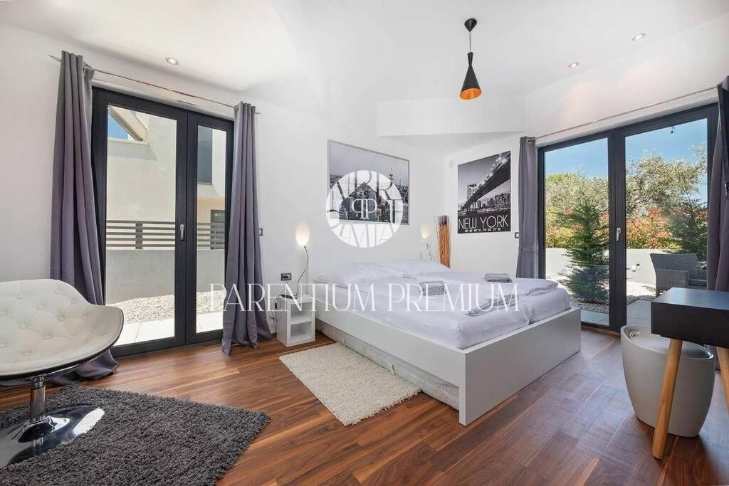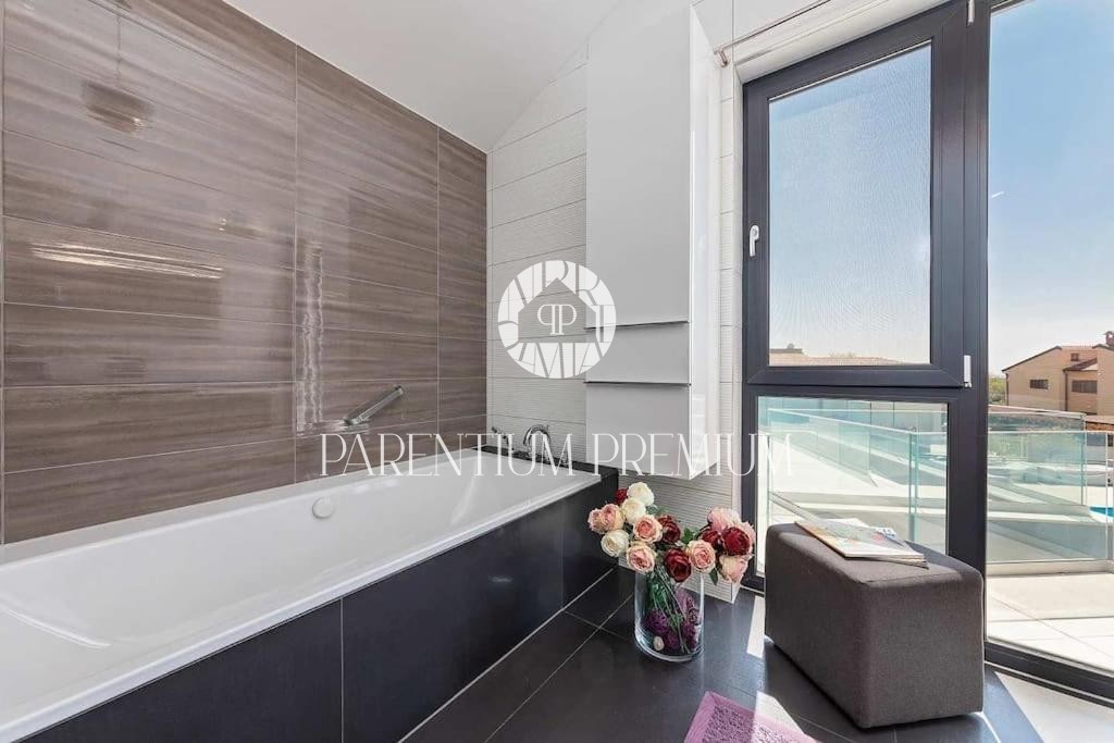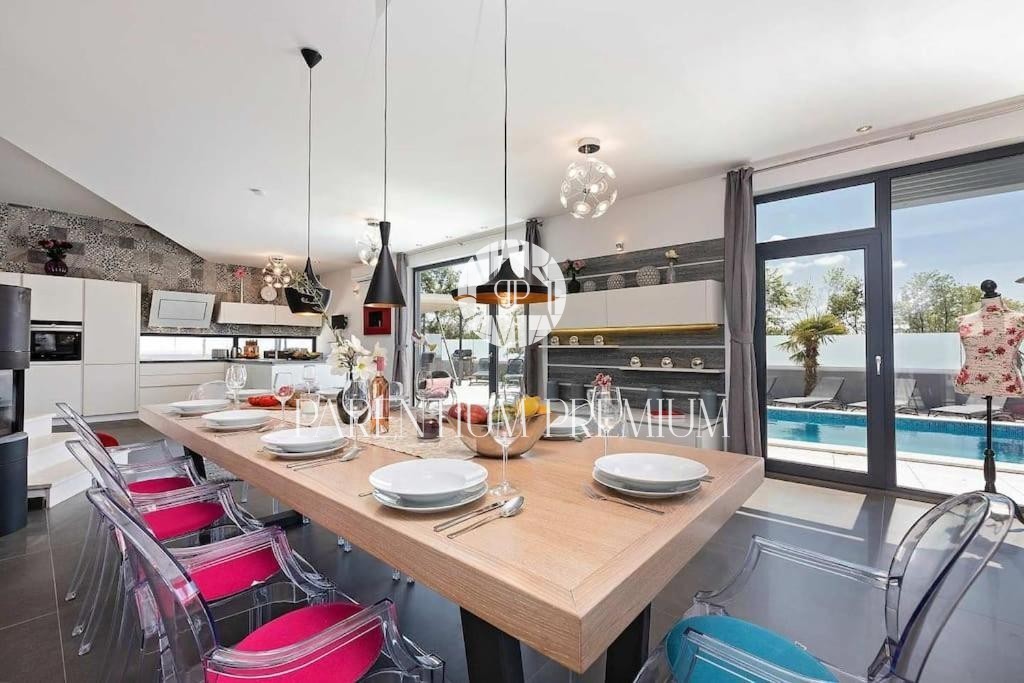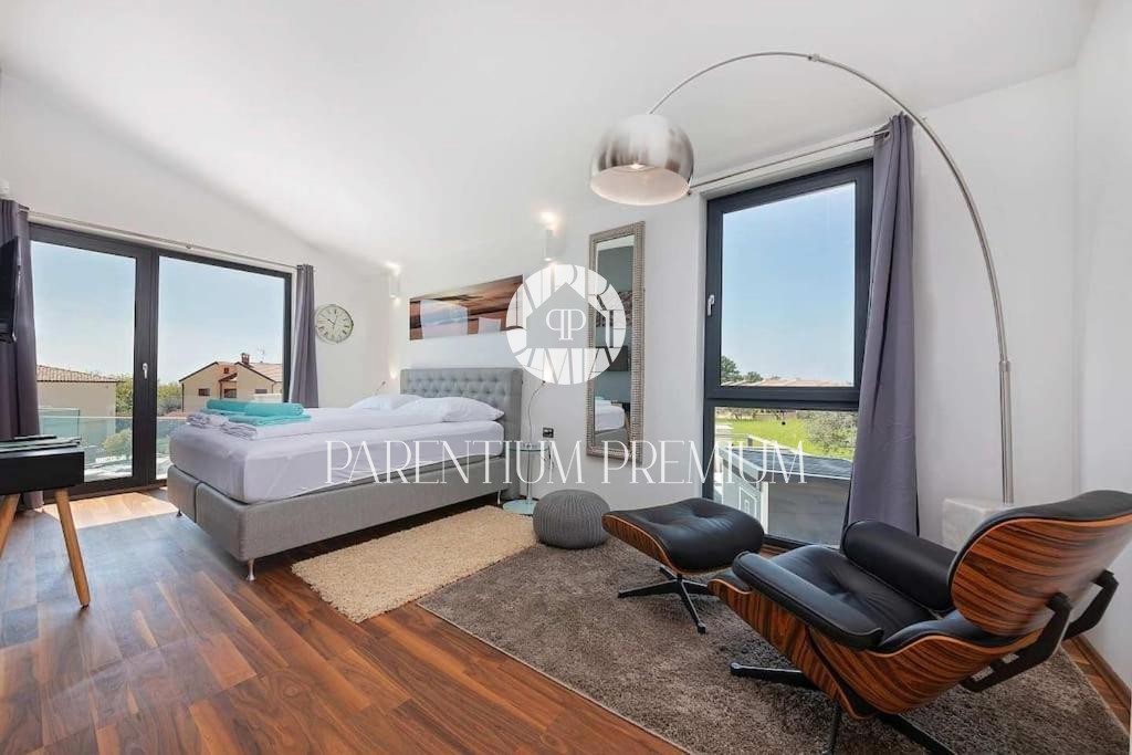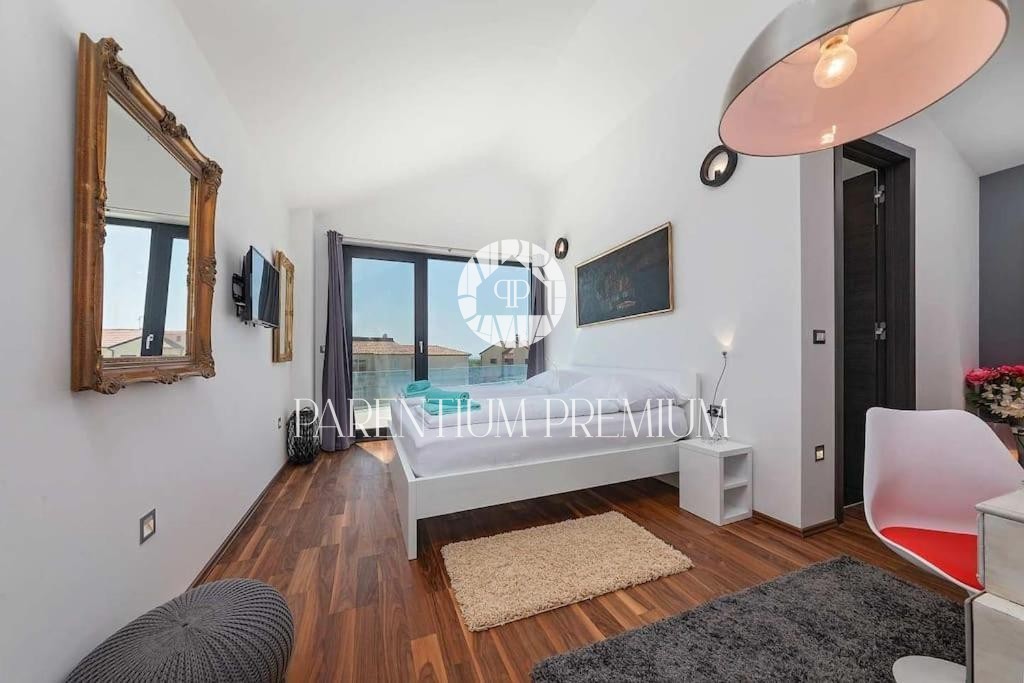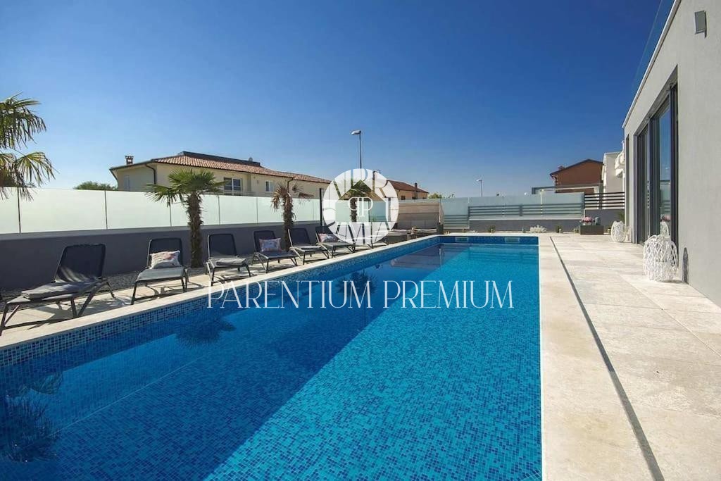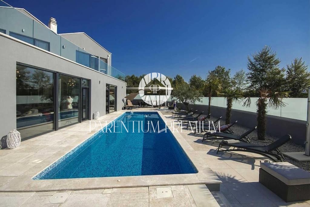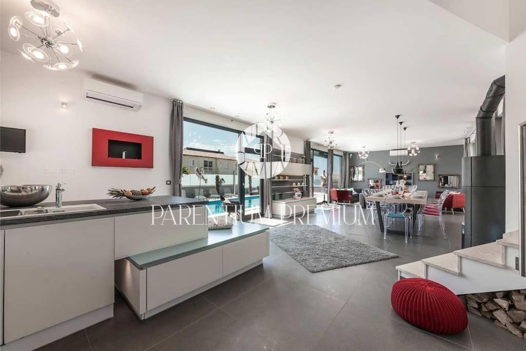 Istria, Poreč area A luxurious designer villa with a swimming pool is for sale near Poreč, located on a plot of 871m2. The villa extends over two floors, ground floor and first floor, with a total area of 385 m2 and a spacious garden of 870 m2. The vil