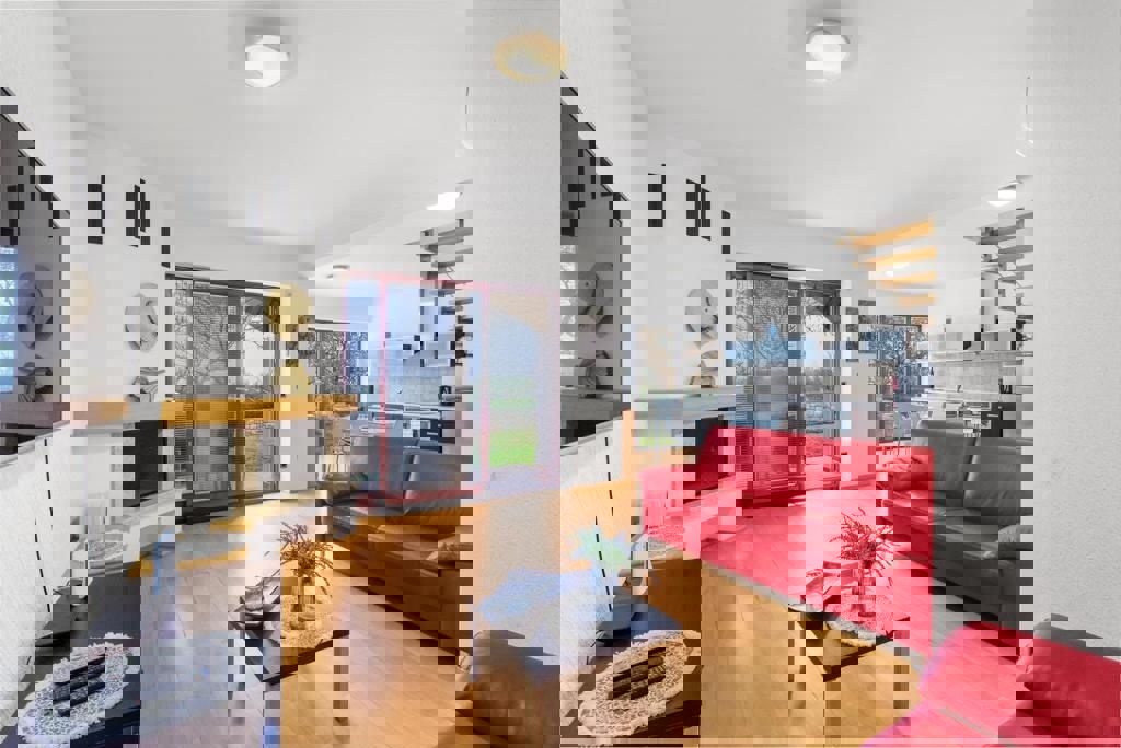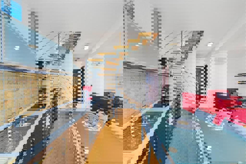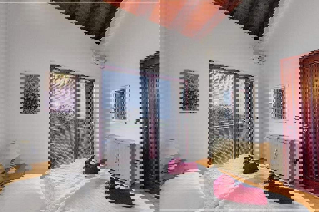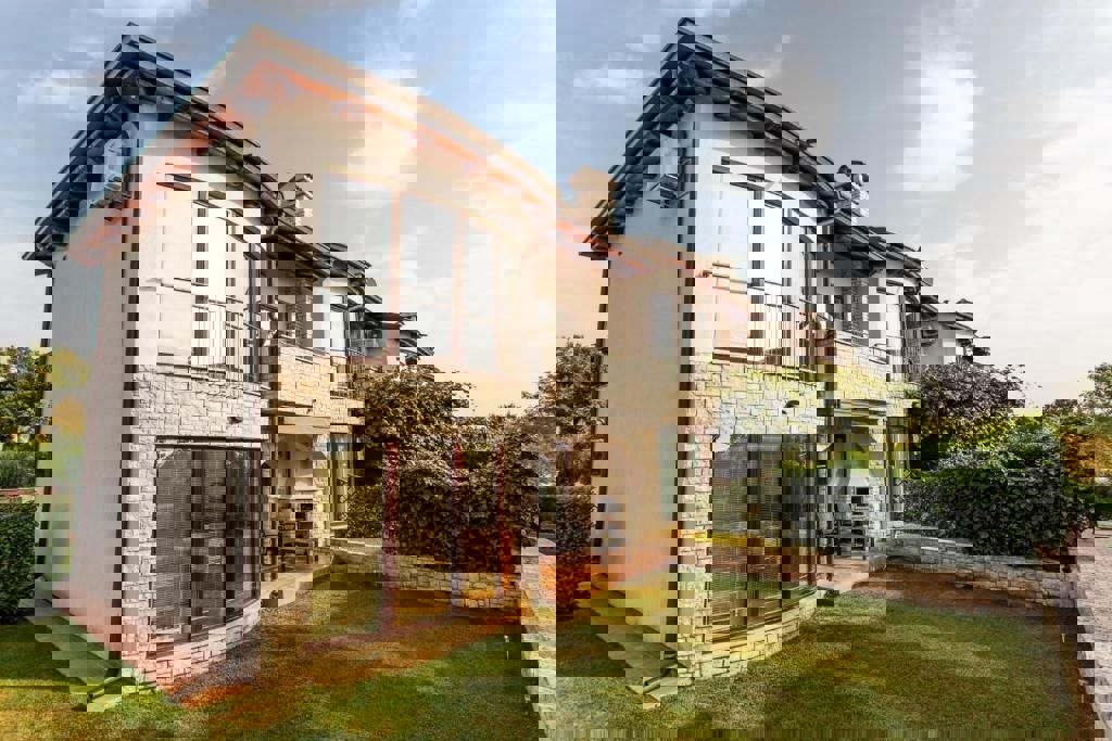 Not far from Poreč and the sea, the last house in a row with an open view of nature and the sea is for sale. The ground floor of the house consists of an entrance hall, bathroom, pantry, kitchen with dining room and living room with a fireplace and access
