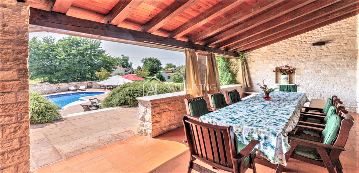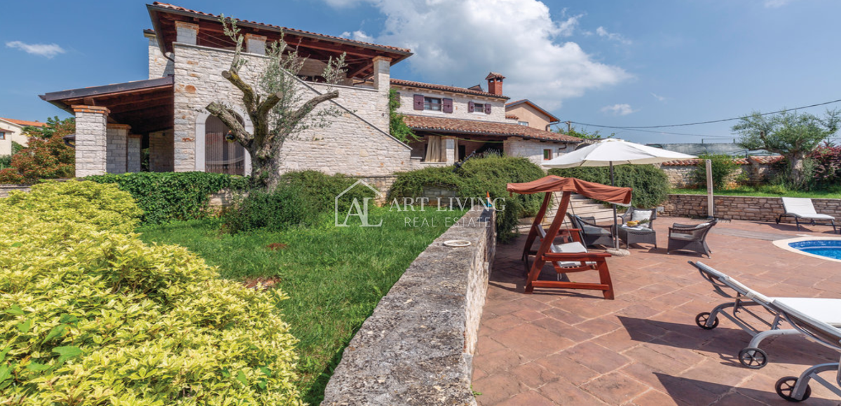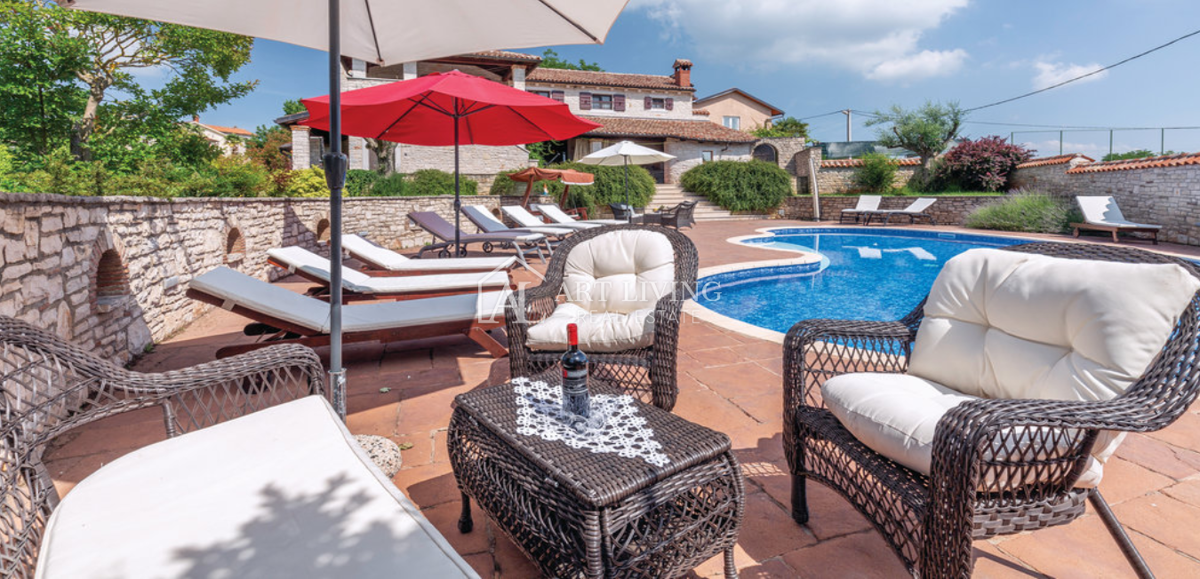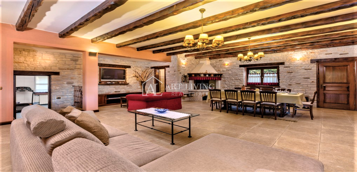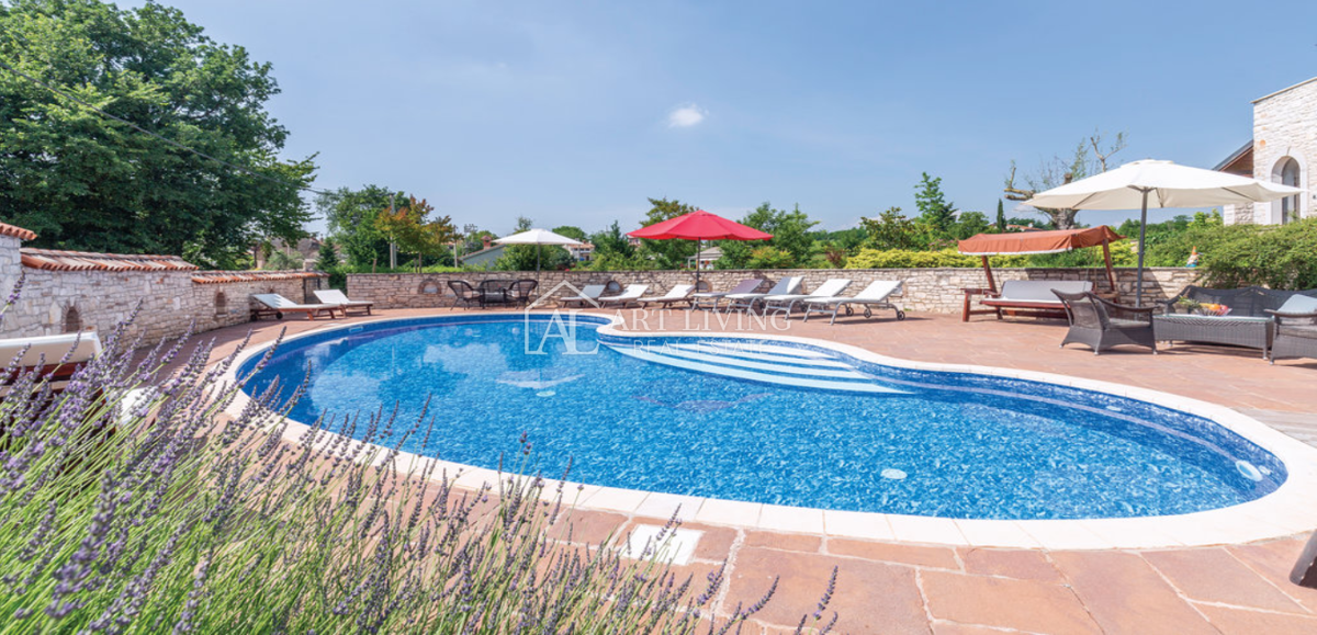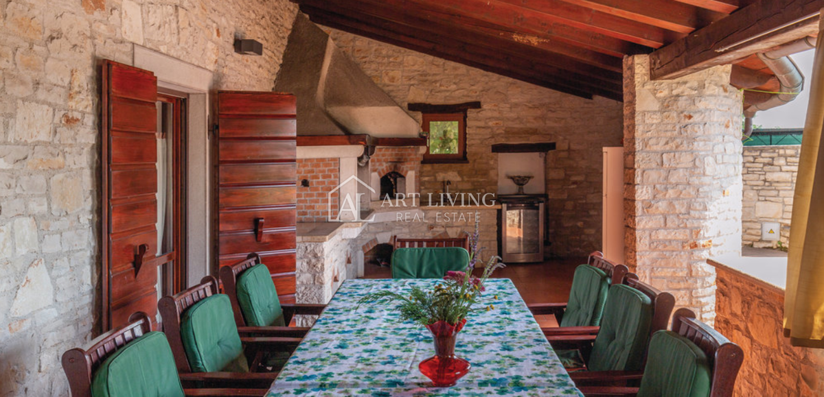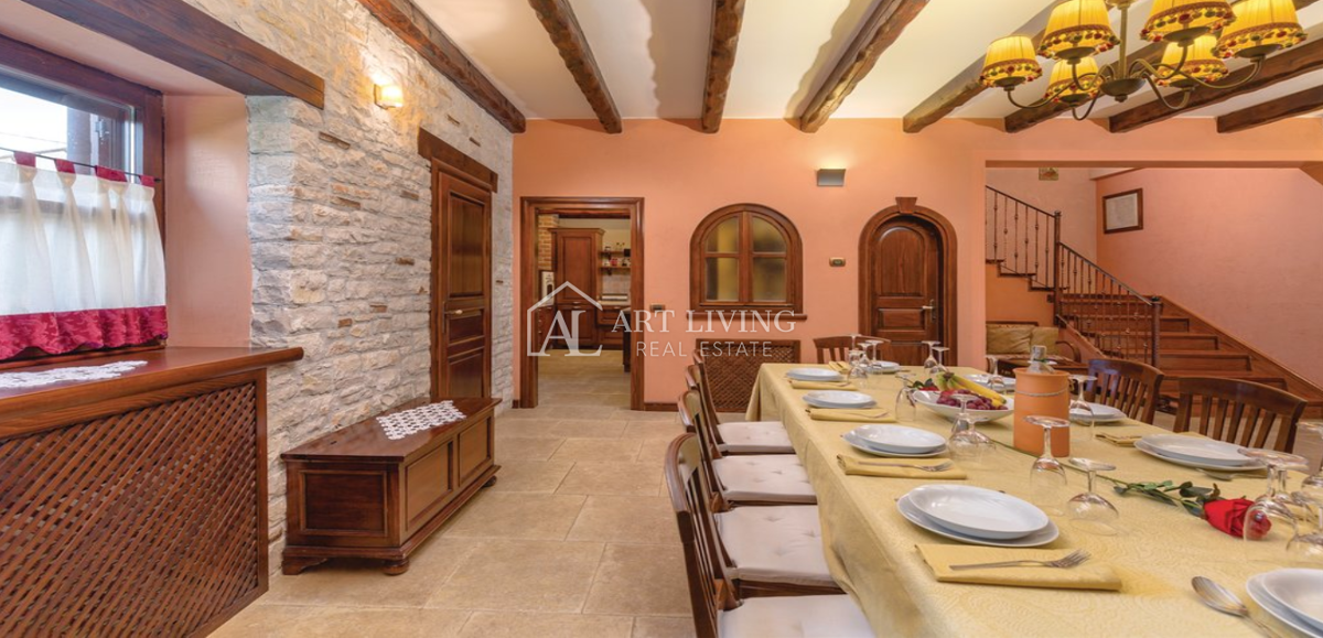 Istria, Porec, Visnjan A beautiful stone house with wooden details and a large pool is for sale. The house is located in a quiet location surrounded by nature and greenery. It is 15 km away from the ugly Porec and the sea. 40 km from the border crossing