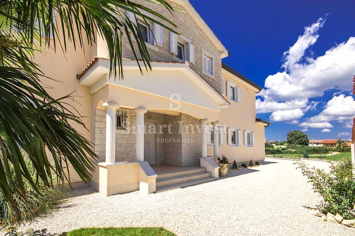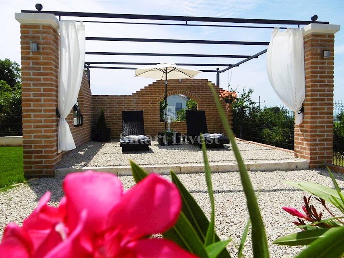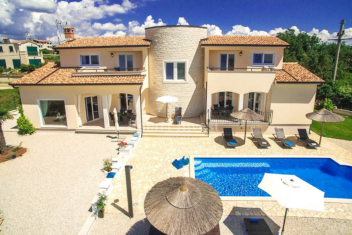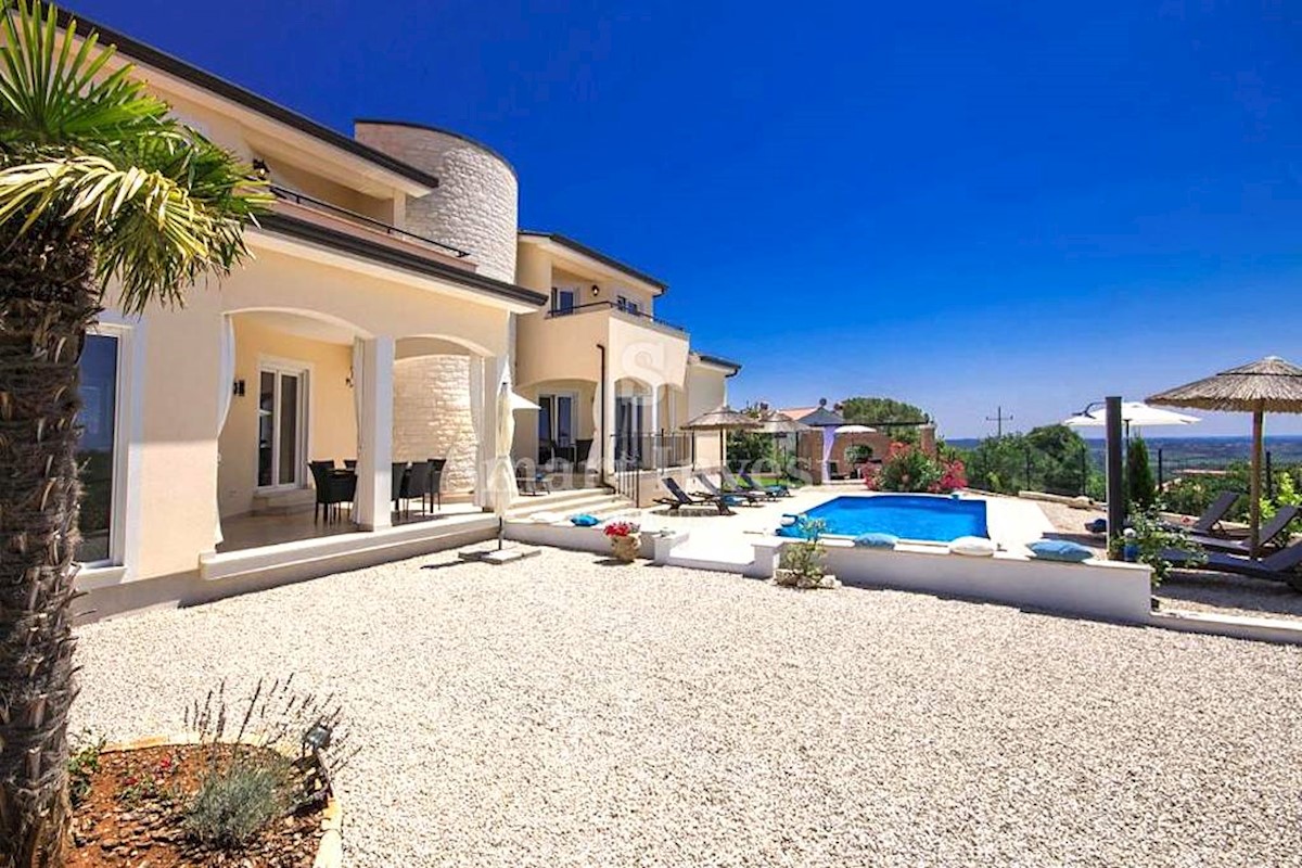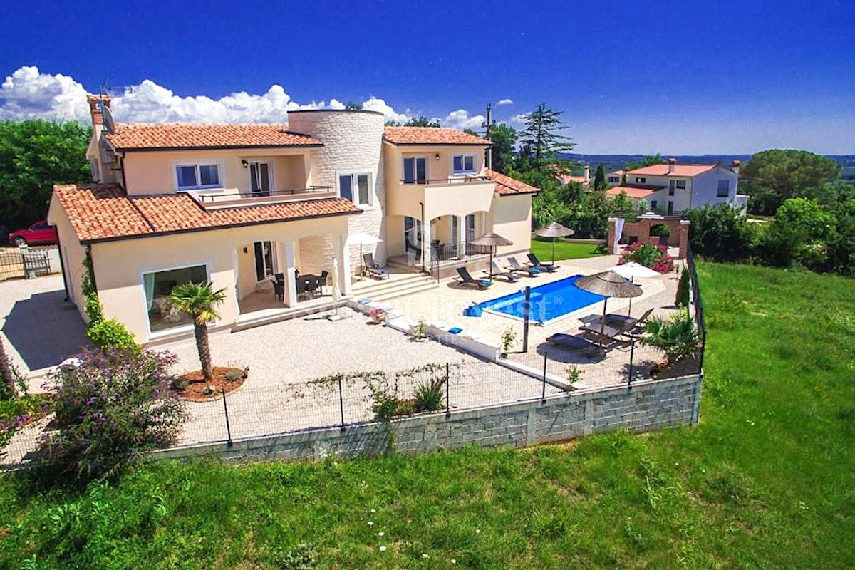 POREČ vicinity, Luxury 4-bedrooms villa with a swimming pool, spacious landscaped territory and beautiful sea view, on a quiet location 8 km away from the sea and 11 km away from the center of Poreč or Novigrad. The villa of 245 sqm is situated on a land