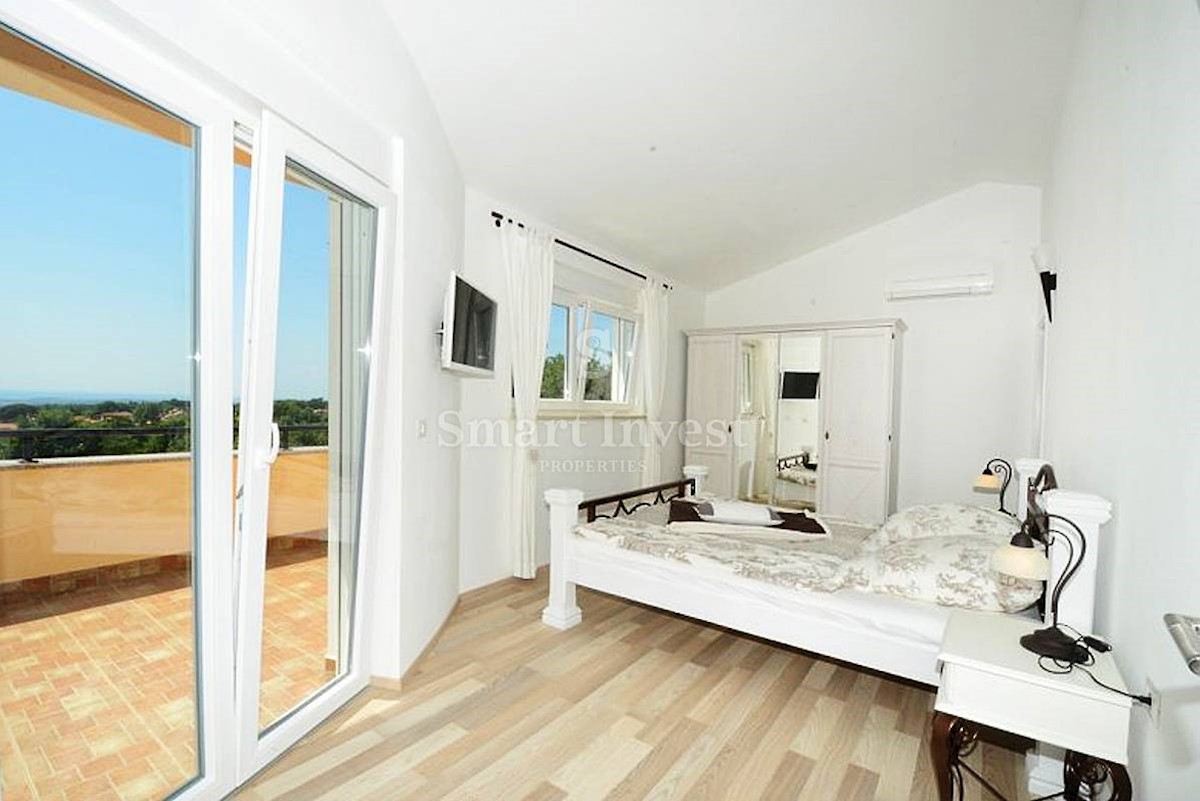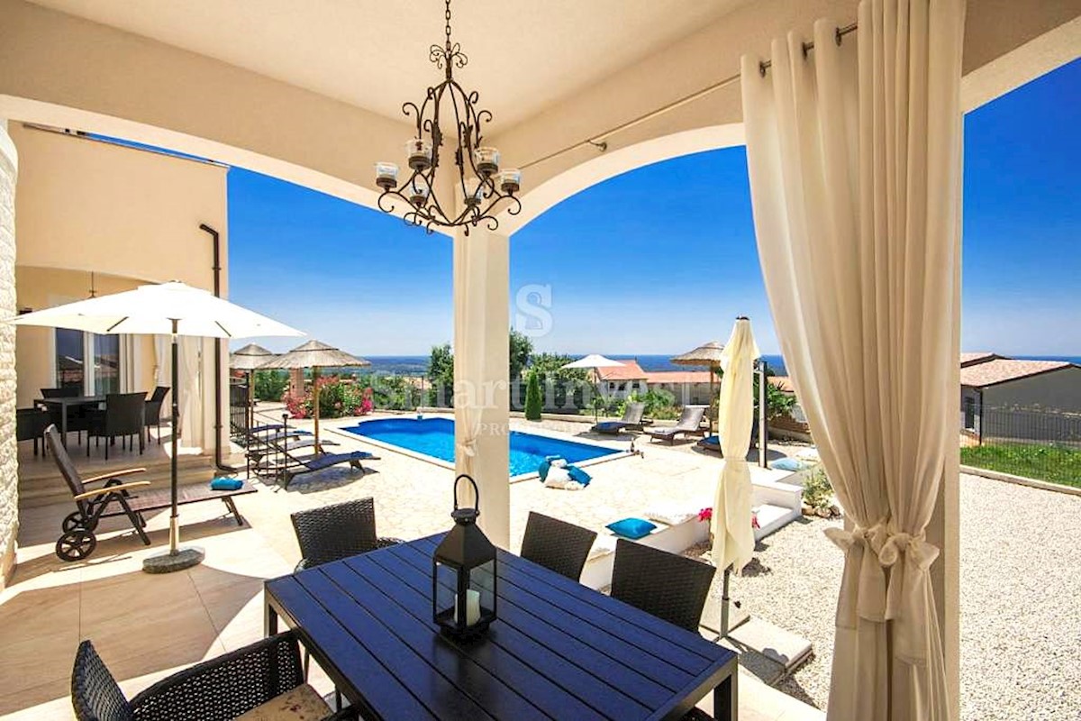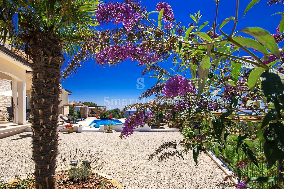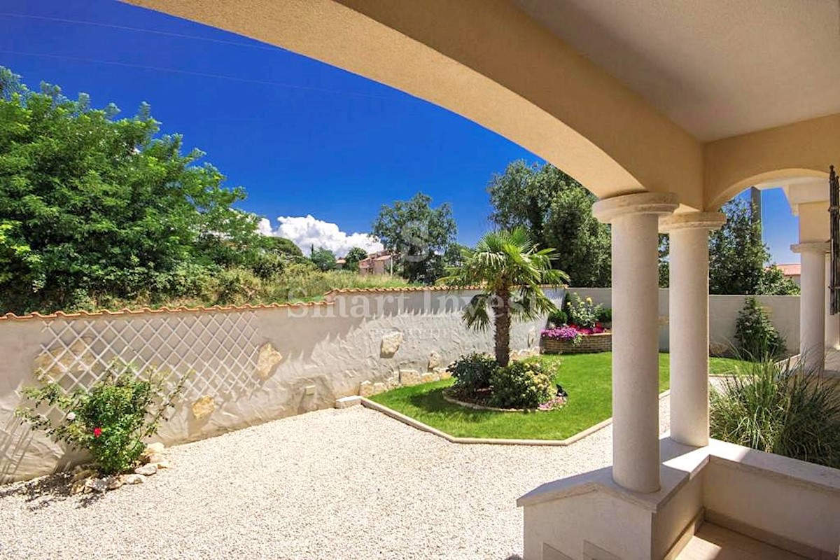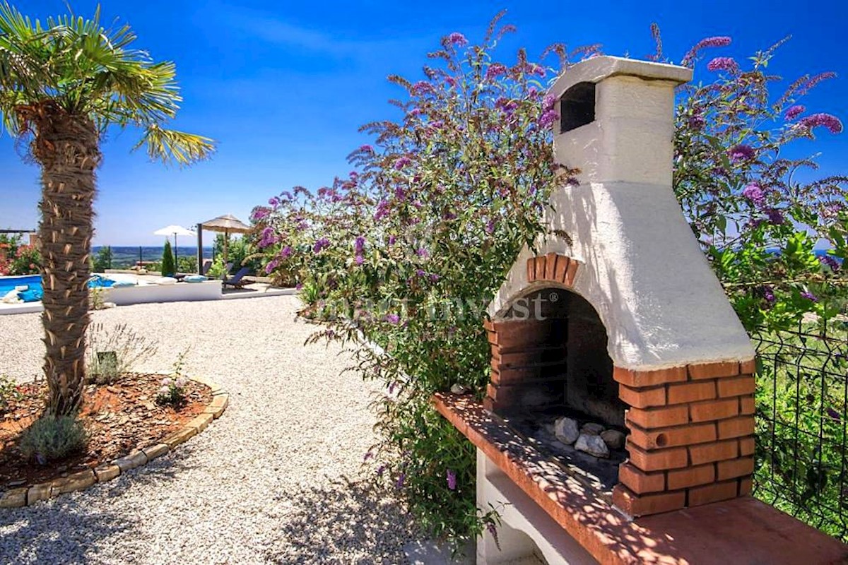 POREČ vicinity, Luxury 4-bedrooms villa with a swimming pool, spacious landscaped territory and beautiful sea view, on a quiet location 8 km away from the sea and 11 km away from the center of Poreč or Novigrad. The villa of 245 sqm is situated on a land