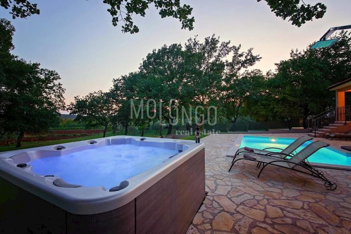 Extremely comfortable and luxurious rural villa with swimming pool located on the edge of the village in the hinterland of Poreč. The house was built in 2016 and is located in an extremely quiet position, surrounded by an oak forest and with a view of fie