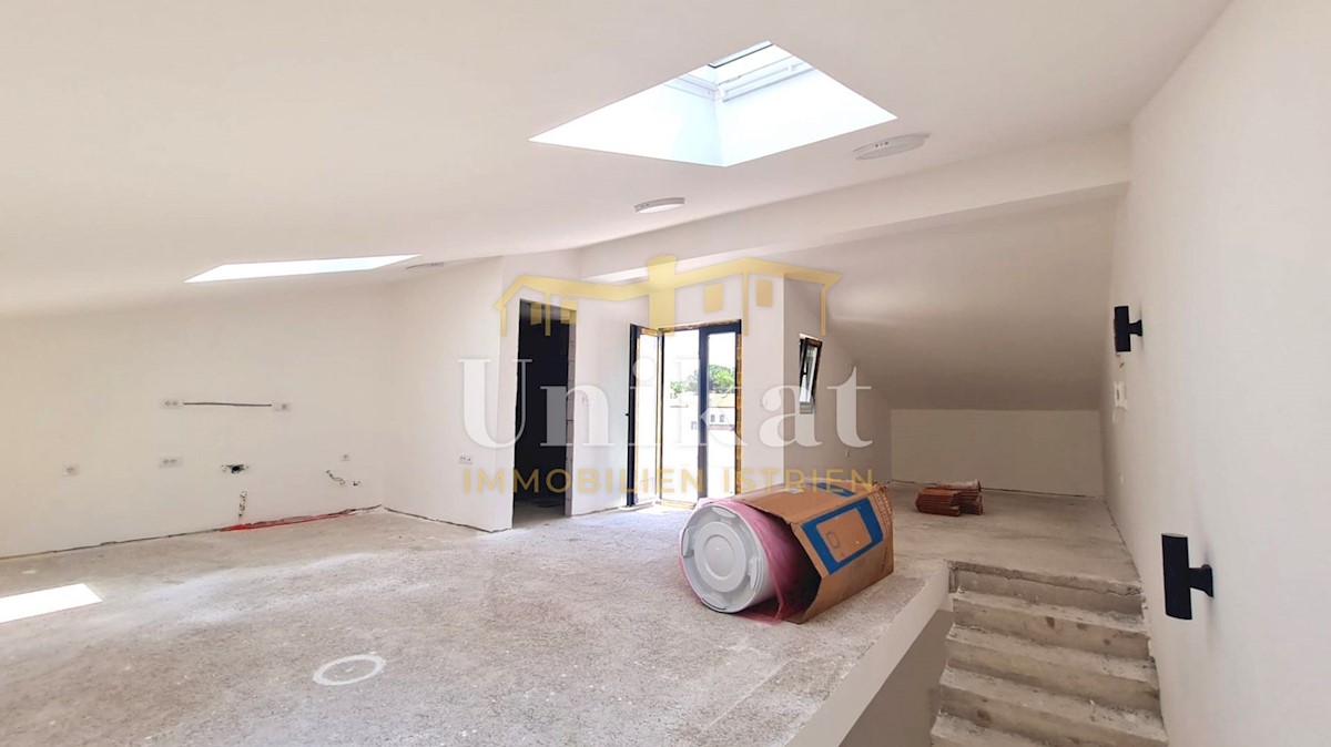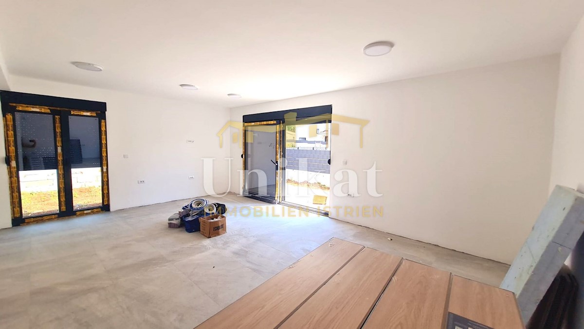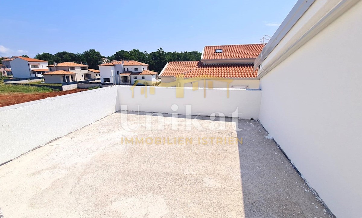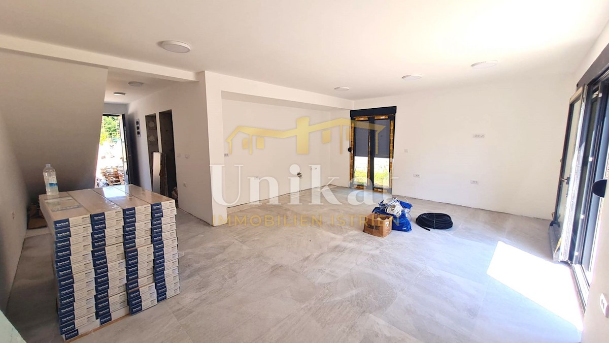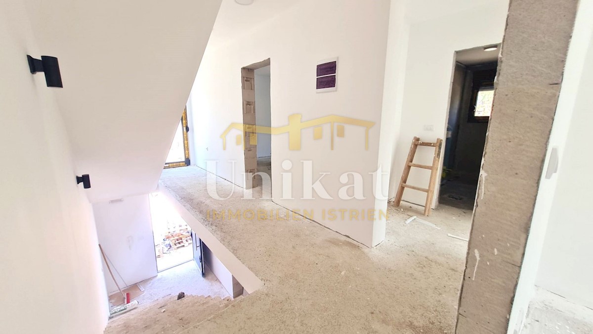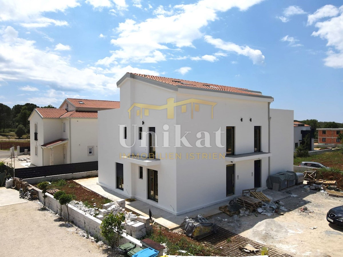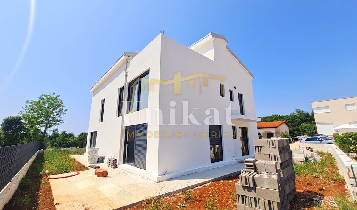 Modern semi-detached house on three floors, 2 km from the center of Poreč and 2.5 km from the sea. The net area of the house is 187 m2. On the ground floor there is an entrance area, a spacious living room with kitchen and dining room, bedroom, bathroom a