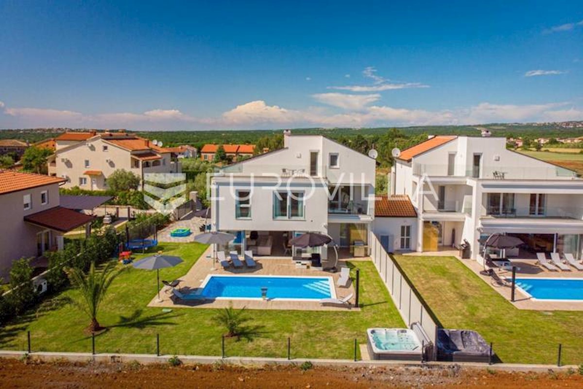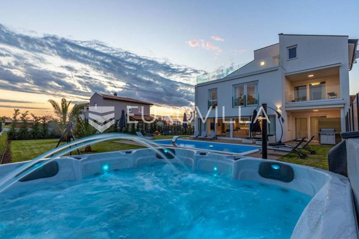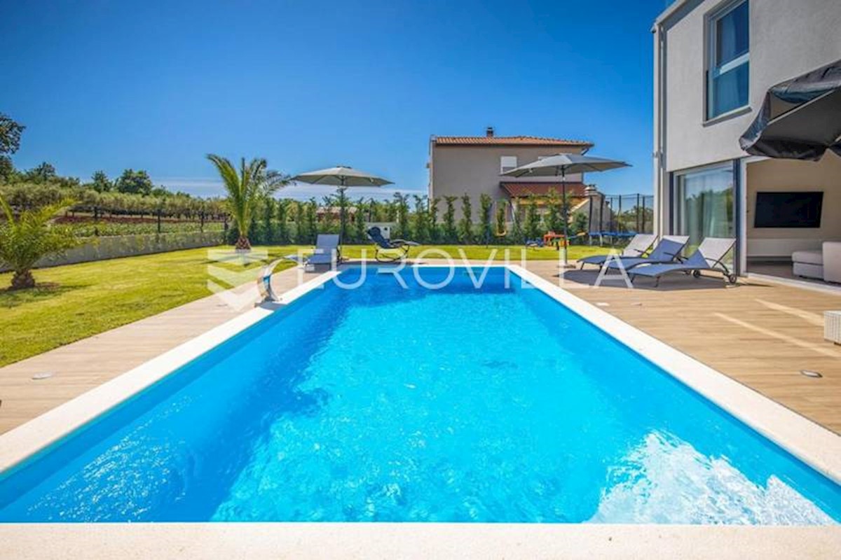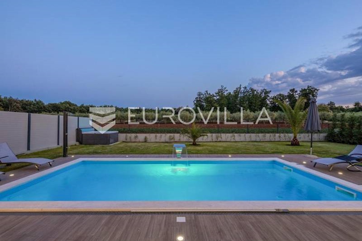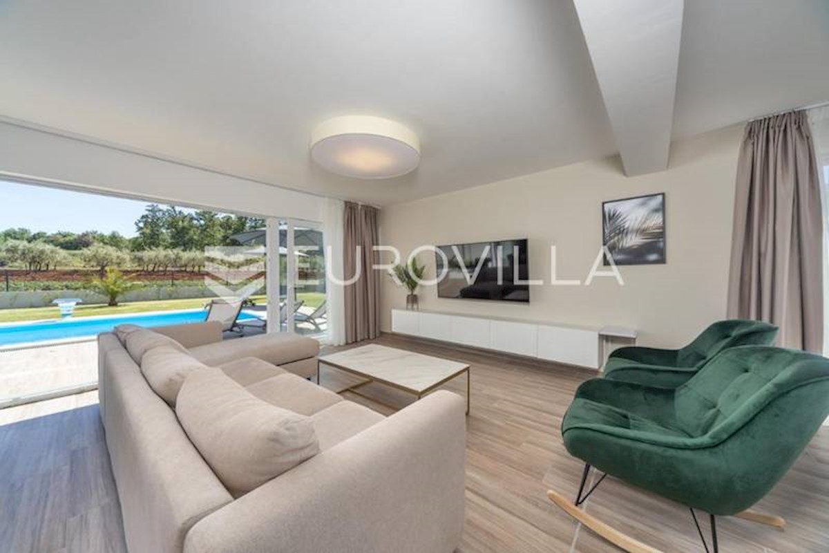 This luxury villa near Poreč, just five kilometers from the well-maintained beaches in beautiful Poreč, is spread over three floors with a total area of 244 m2. The ground floor of this villa consists of a large open living room with a modern custom-made