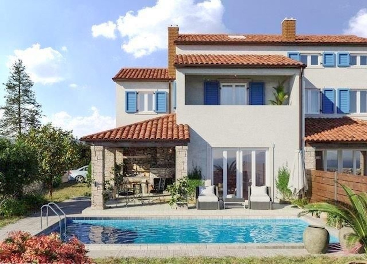- U blizini Poreča prodaje se dvojna kuća s panoramskim pogledom na more. Ova kvalitetna novogradnja prostire se na 134 m² stambenog prostora, uz dodatnih 186 m² dvorišta.U prizemlju smješten je toalet , spremište i kotlovnica, dnevni b