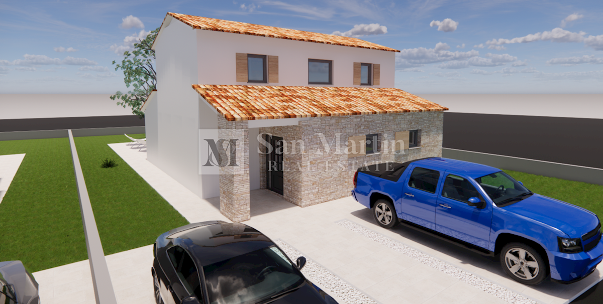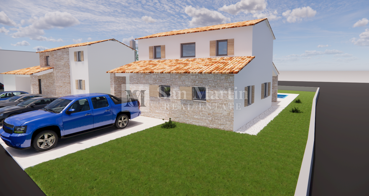 Poreč, okolica - moderna kuća s bazenom u izgradnji U okolici grada Poreča na okućnici od 553 m2 planira se izgradnja moderne samostojeće kuće ukupne površine 135,3 m2. Kuća se prostire na dvije etaže. U prizemlju se nalazi ulazni hodnik, dnevni borava