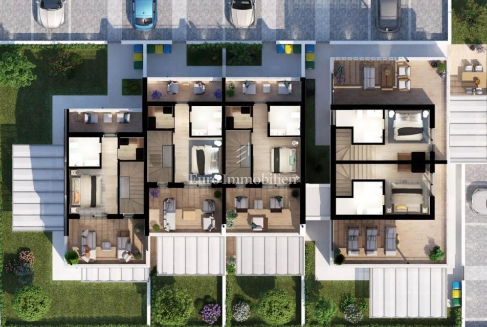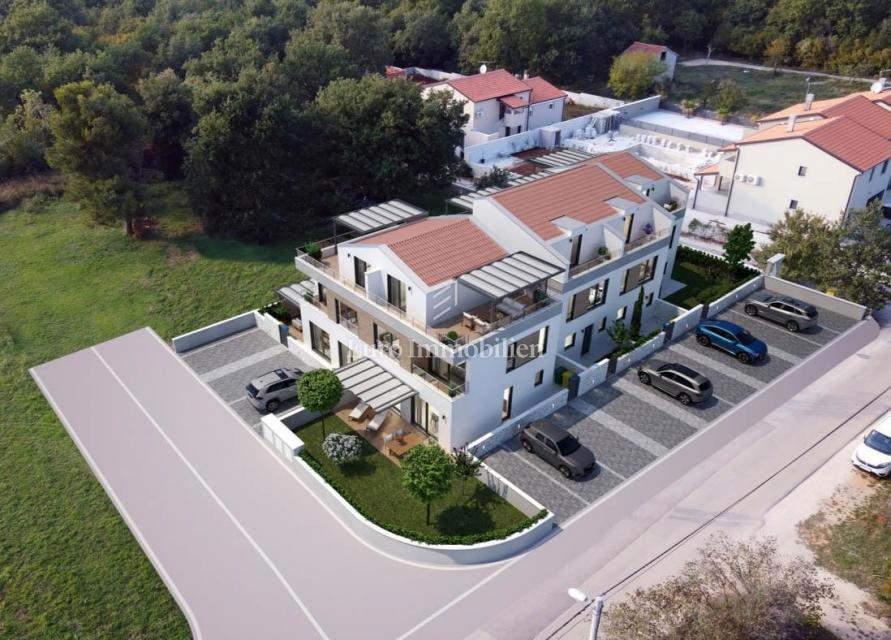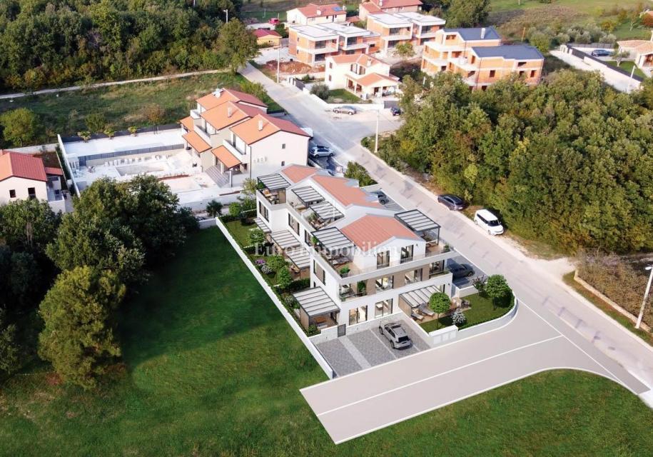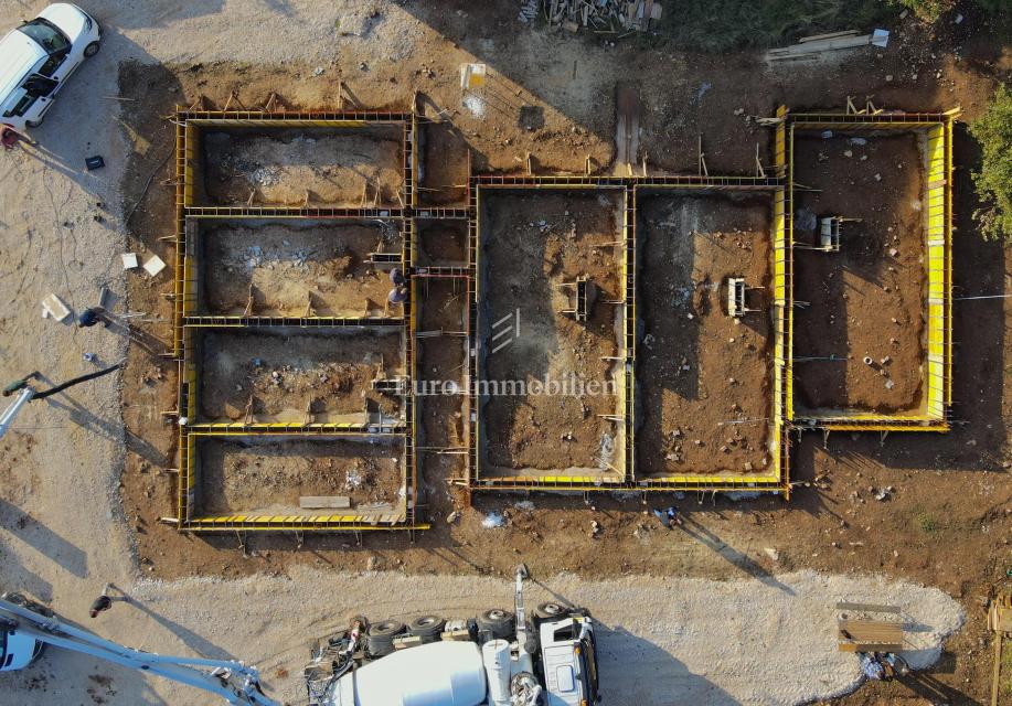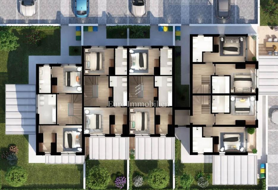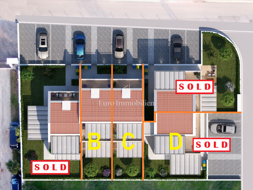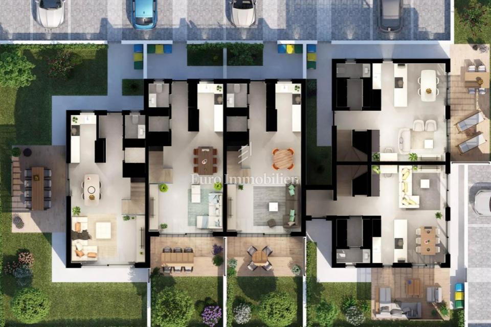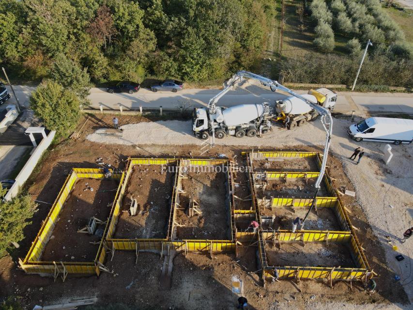 Novi projekt kuća u nizu nalazi se u Poreču, u mirnom i lijepom naselju, samo 2 km od mora i cca 5 minuta vožnje od centra grada Poreča. Tri kuće u nizu i dvojnica, ukupno pet jedinica koje pametnim arhitektonskim rješenjem dopuštaju visoku razinu privat